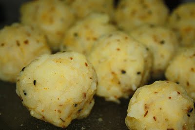 Сварите картошку в мундире. Очистите и потрите на крупной терке. Добавьте специи соль перец. Обычно добавляют пюре из дала( но как по мне это лишнее). Скатайте шарики 3 см или типа того. Внешняя сторона шарика должна быть очень плотной что бы не развалиться во фритюре.