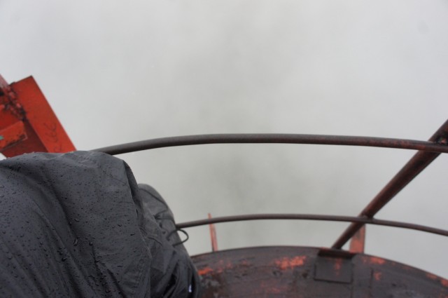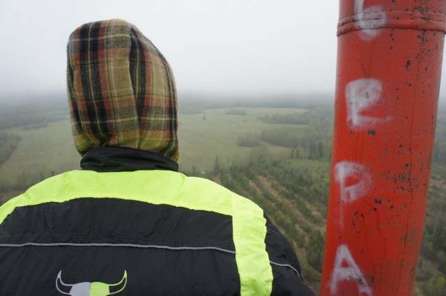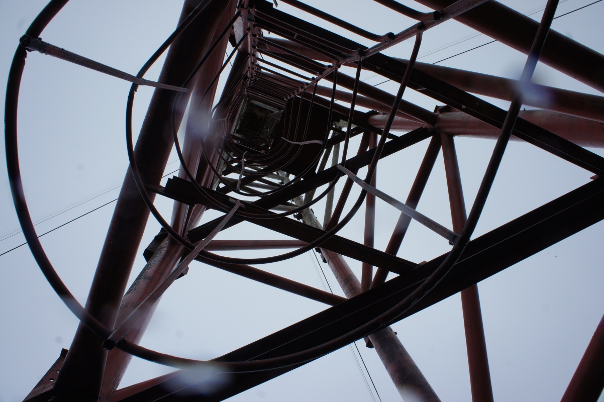 Из снаряжения прихватили только дождевые комбинезоны, балаклавы и перчатки, чтобы не замерзнуть, не промокнуть и испортить одежду, взбираясь по ржавым металлоконструкциям вышки. Погода была пасмурная, небо низкое, на столько, низкое, что вершину вышки было не видно, с одной стороны это лишало нас видов и снимков с самой верхней точки, а с другой – давало шанс забраться на небо к самым облакам.