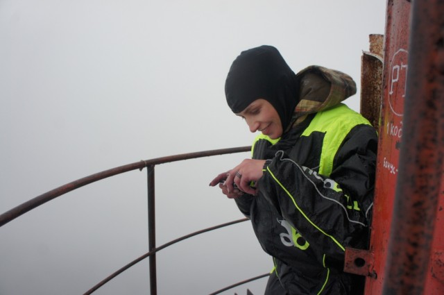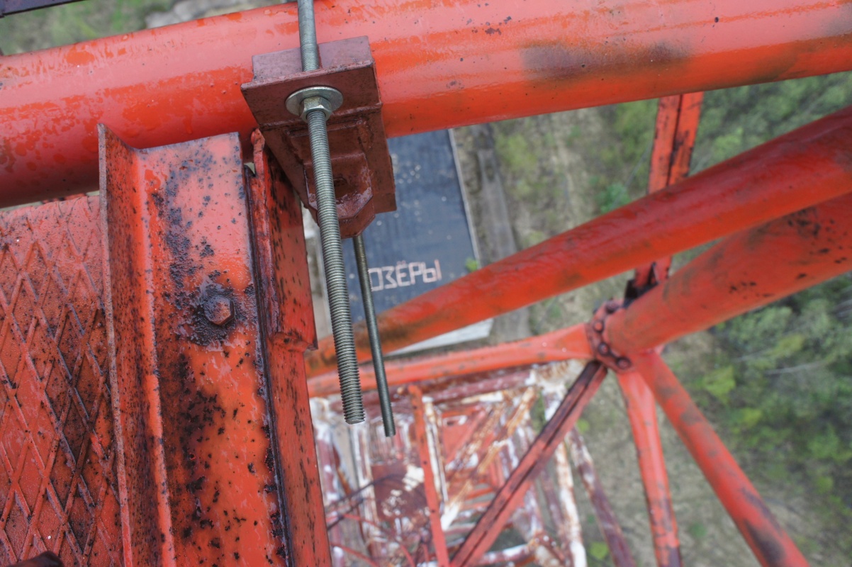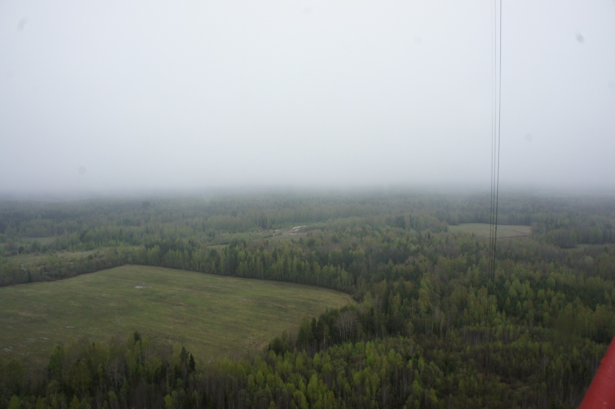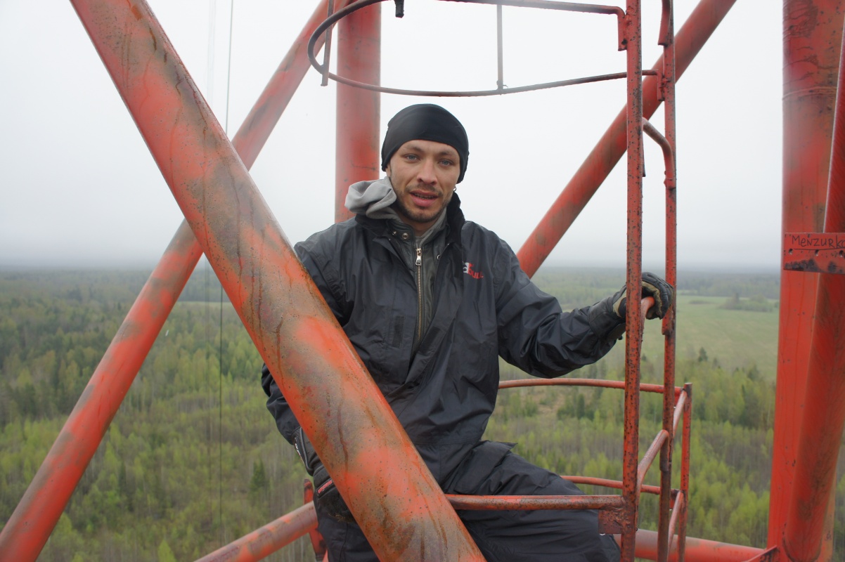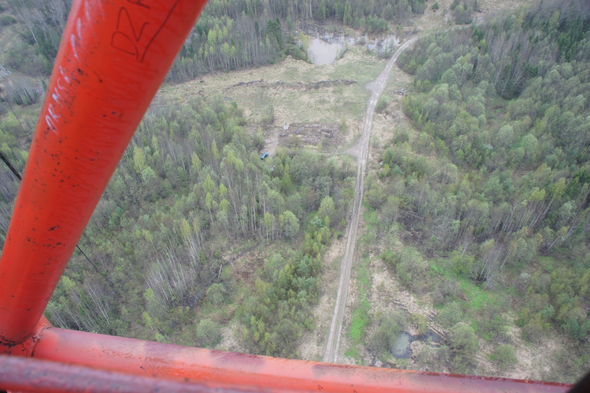 Наконец появилась первая круглая площадка, от которой еще 10-15 метров ползти в трубе, в которой сухо, но сильно качает, потому что последние тросы, которые держат вышку в вертикальном положении были закреплены до трубы. И вот мы наверху, не фига не видно, и георгиевскую ленточку забыли в машине, но мы забрались на небо! Немного подурачились, позвонили Паше, связь там работала, и с песнями полезли вниз. Подъем и спуск с перекурами, заняли около 3-4 часов.