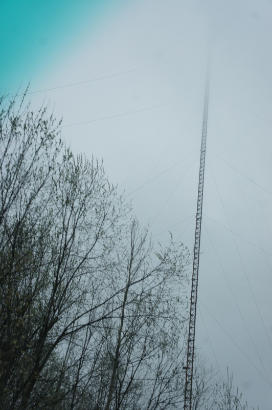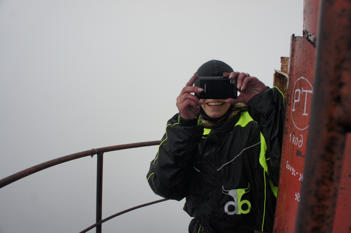 Восхождение все начали в бодром расположении духа, с целью забраться наверх, не взирая на сырость, ветер и холод . Внизу моросило, но чем выше поднимаешься капли становились все крупней, когда мы поднялись на высоту чуть большую 200 метров, я понял что формируется эта морось прямо здесь и сейчас, дождя тут уже нет, только густое облако, туман, влага конденсируется на конструкциях вышки, на мне, на Ирэн, и в момент, когда вес капли превышает силу поверхностного натяжения воды, она отрывается от поверхности и, разбиваясь в воздухе на две, потом четыре, восемь и так далее частей и долетает до земли мелкой моросью. Забавно наблюдать дождик сверху. Некоторые капли, которые видимо боятся высоты, норовят заползти в рукава, за шиворот и остаться там в тепле. Промокли перчатки, кроссовки, руки и ноги мерзли, но мы карабкались наверх, не могли мы сдаться в День Победы, Паша с Настей отстали и на полпути начали спускаться, я потом ни разу не припоминал это Паше. Чтобы как-то взбодриться, я пел патриотические песни, а когда патриотические закончились, пел рок-н-роллы, у Ирэн со слухом проблемы, поэтому она читала Бродского во весь голос. Молоко вокруг становилось все гуще, уже не видно земли, отметки с высотой и ободряющие надписи, сделанные краской теми ,кто поднимался ранее как-то разбавляли монотонность действия, я пел: