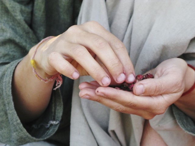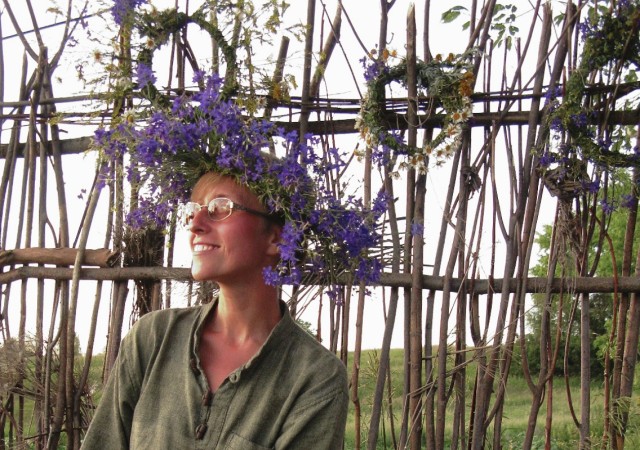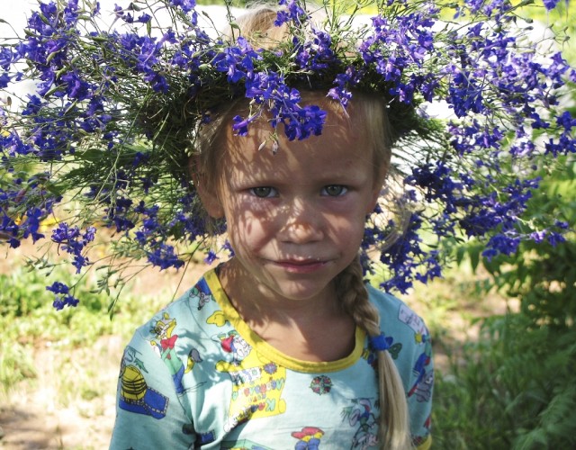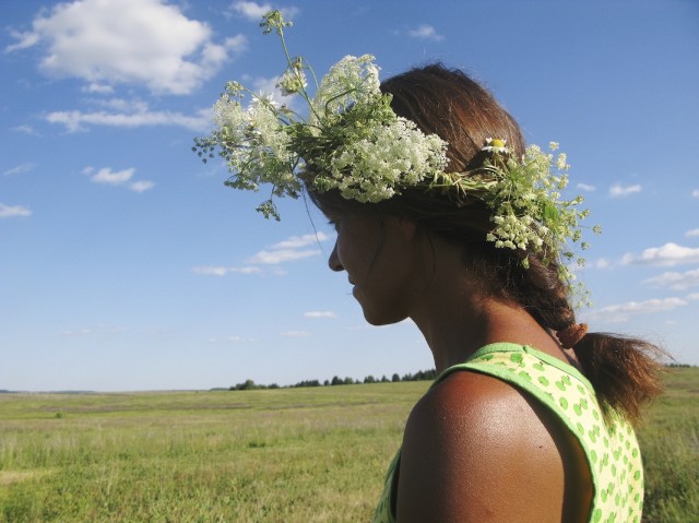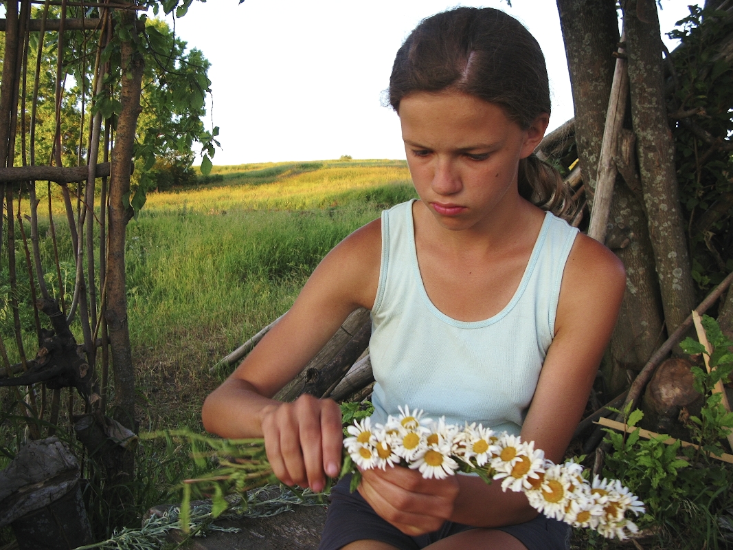 Как только мы приехали, то сразу отправились купаться, собирать клубнику и рвать полевые цветы для венков. Прошатались в полях весь день. Когда вернулись, меня с непривычки срубило на час, и правильно, потому что к празднику, который намечался в полночь, надо было быть бодрым. Вечер провели под черемухой с травяным чаем и бесконечной клубникой. Но главное - мы плели венки из ромашек, сухоцвета и других трав. Я с детства не плела венков. Но быстро вспомнила как это делается и наваяла три штуки.