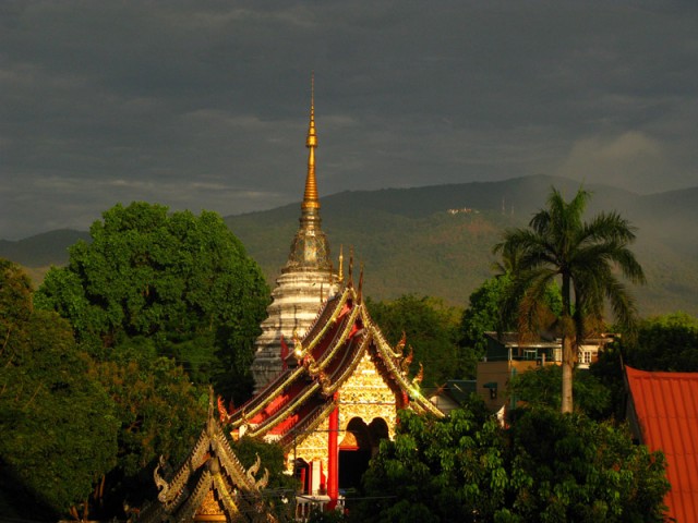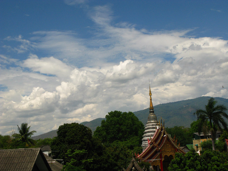 А пока из мечт о будущем вернемся в реальность. А реальность такая. Половину стены занимает вид на священную гору, на которой когда-то медитировал мудрец Судева. Гора называется Дои Сутеп (1650 м). Гора густо поросла джунглями и после дождя, когда воздух становится прохладным и прозрачным, зеленеет пушистой зеленью. Над горой плывут облака, за которыми можно наблюдать, слушая музыку Баха. Бах писал музыку для облаков. Или облака писали музыку для Баха? Но не будем отвлекаться на мысли, а будем пить зеленый чай со льдом и смотреть на шпиль монастыря под окном - как он отливает золотыми и синими чешуйками под палящим солнцем Таиланда, а потом переводить взгляд на облака, а потом опять на золотой шпиль монастыря...