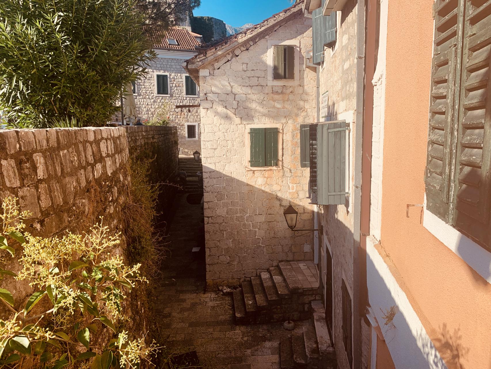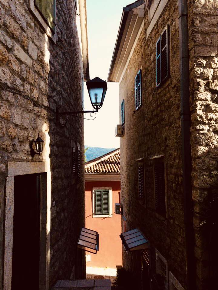 Все-таки волшебная страна Черногория. Районы старых городов — это ожившие сказки Андерсена, с мощёными узкими улочками, красной черепицей, цветущими садиками с розами, зелеными ставнями на окнах с занавесками и мостиками между белых каменных домов, точь-в-точь как в иллюстрациях из детства.