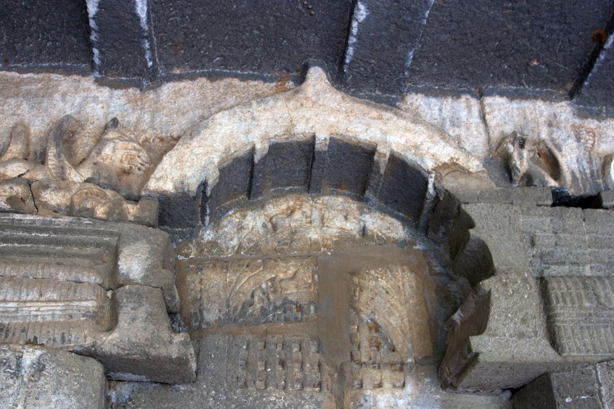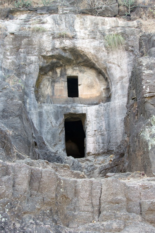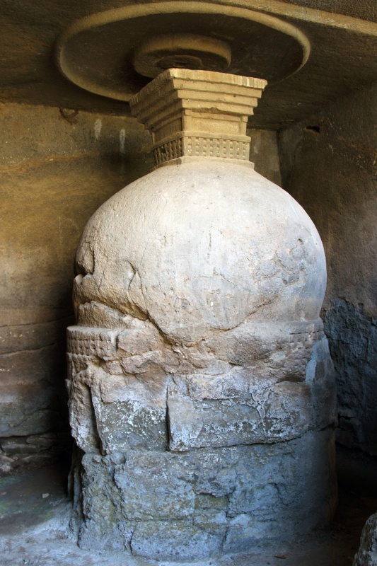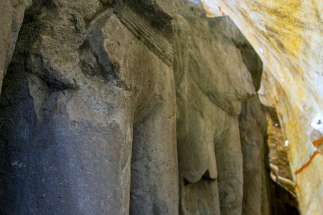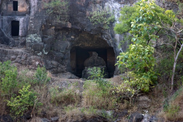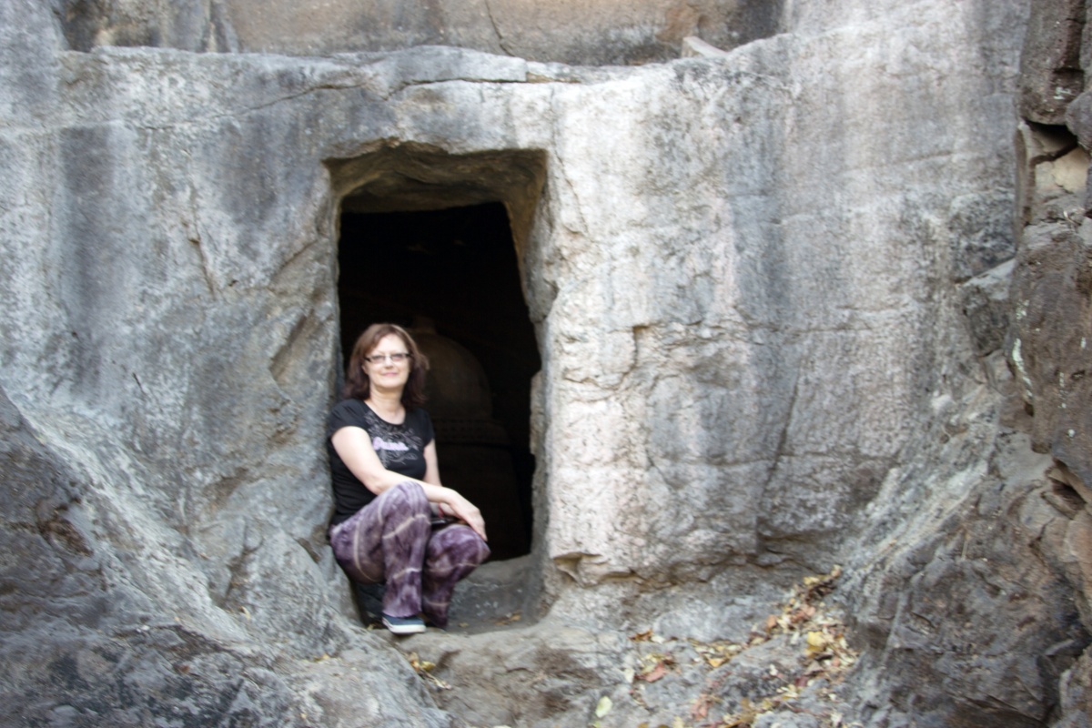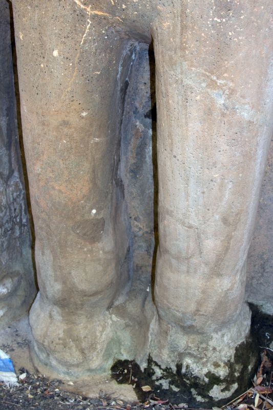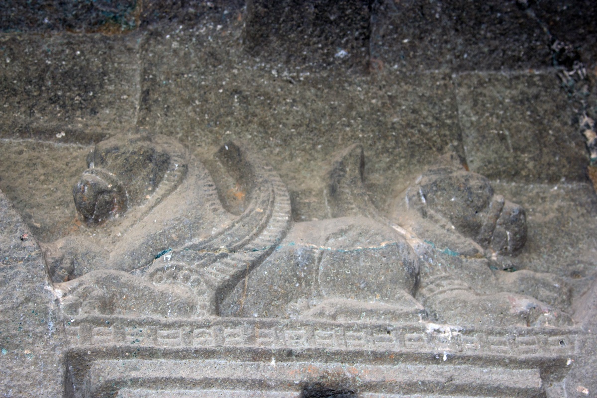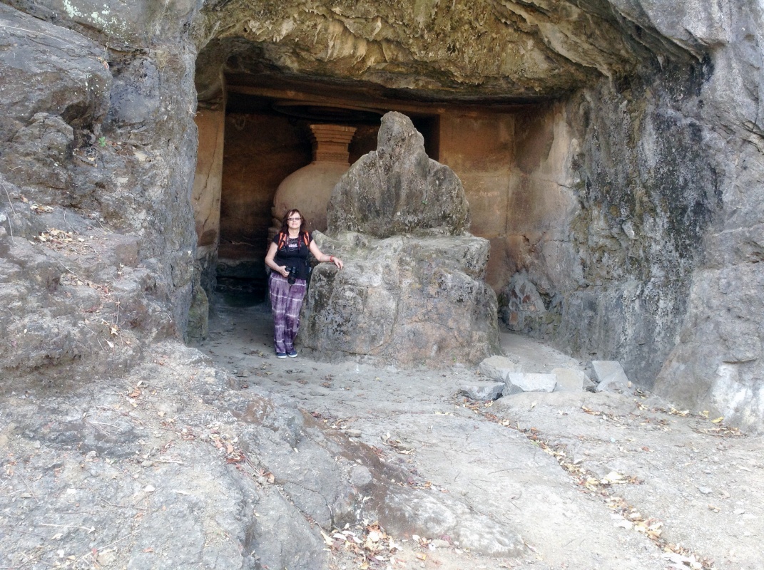 Во вторую по мощности пещеру ( № 4) можно войти через ворота, состоящие из широкой терассы, входной двери, защищенной нагами и стражниками . Опорой комплекса служит ряд резных Слонов. К сожалению, полностью рассмотреть слонов не получилось, я пролезла под закрывающую опоры ткань , чем вызвала удивление и смешок моего Секьюрити.