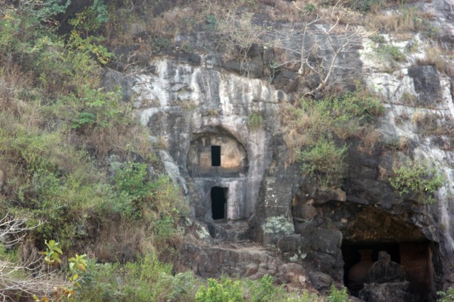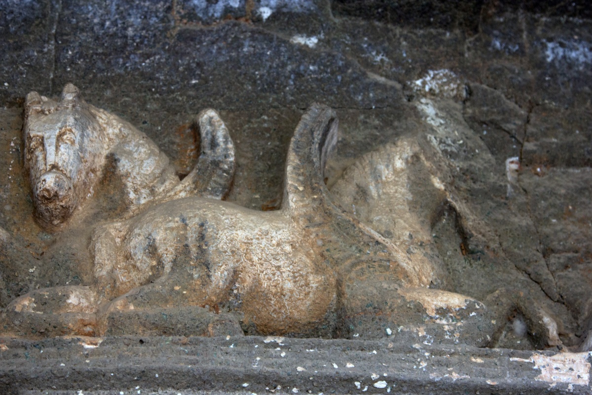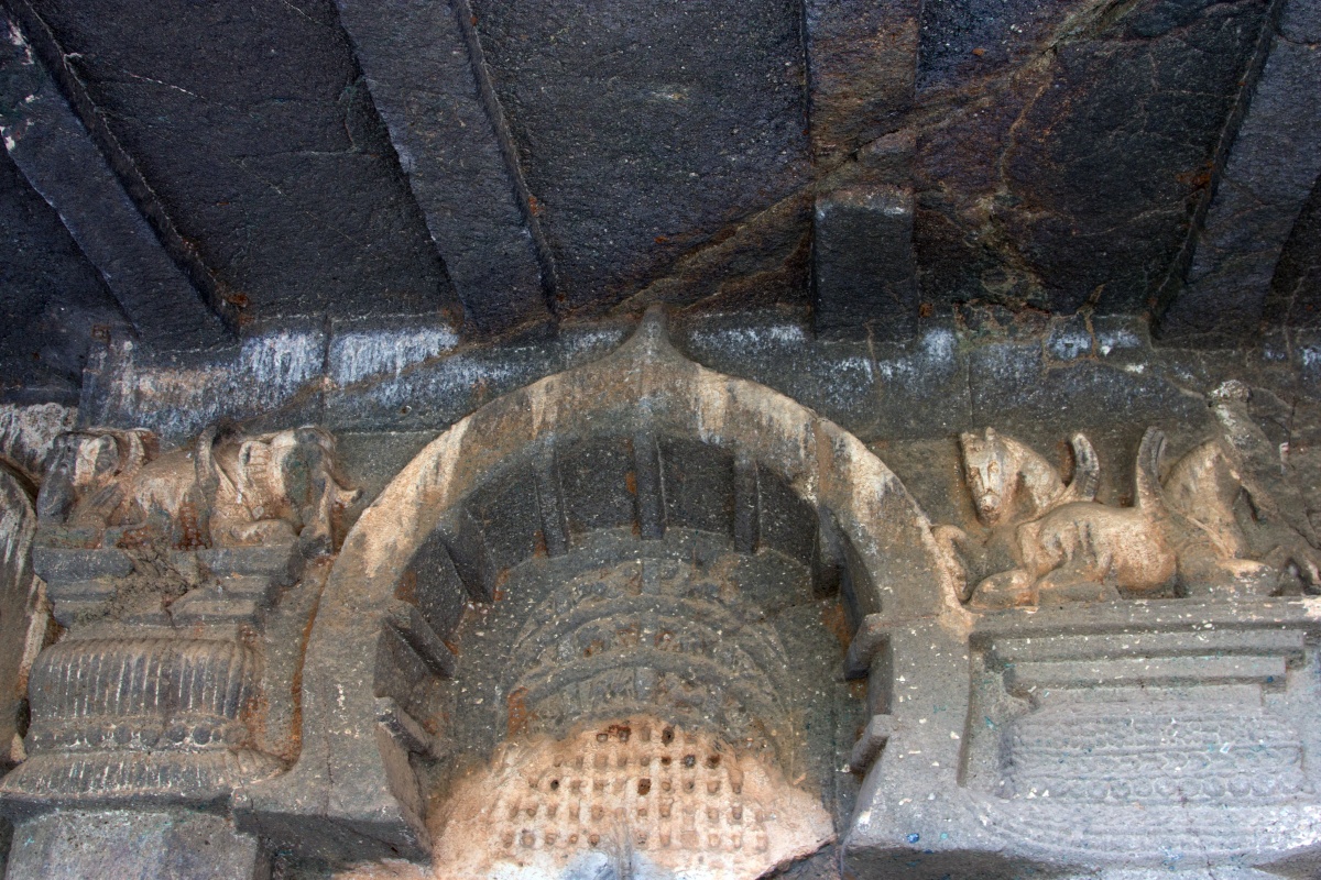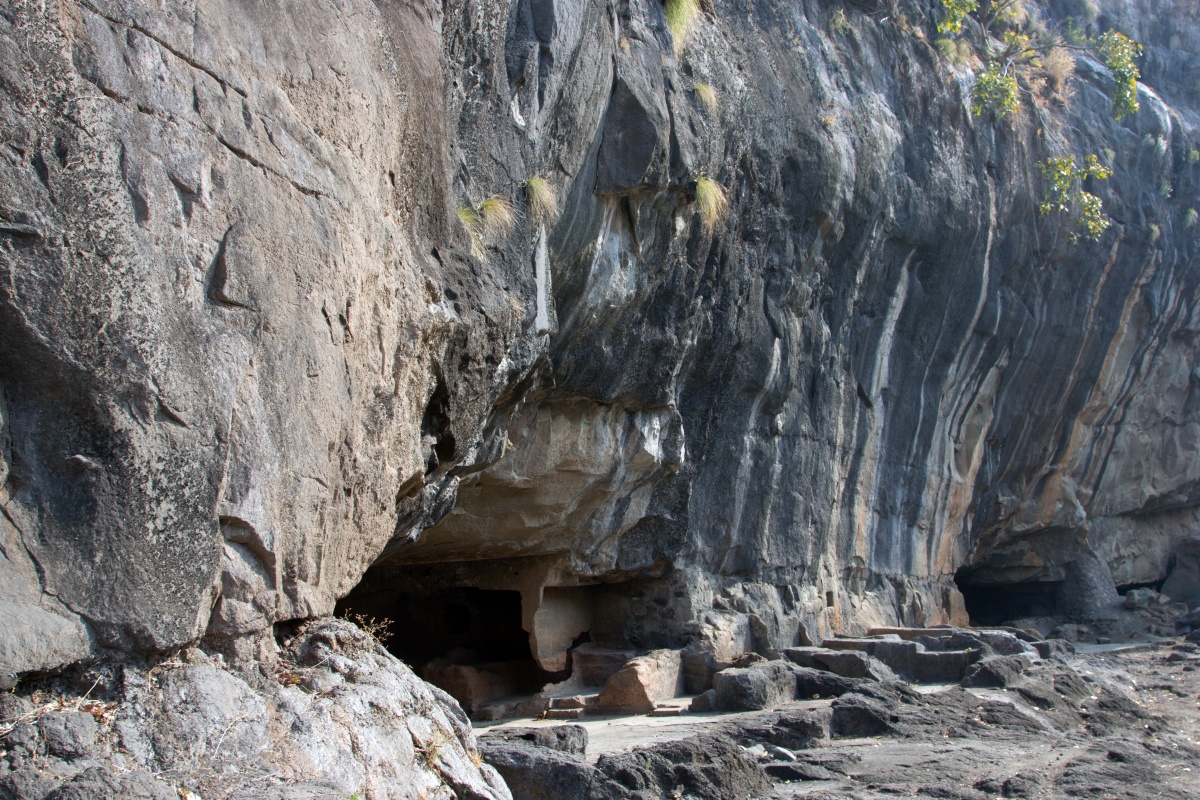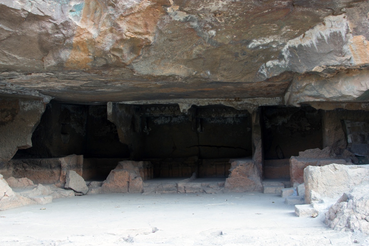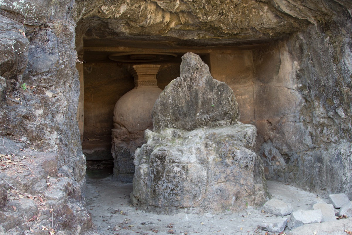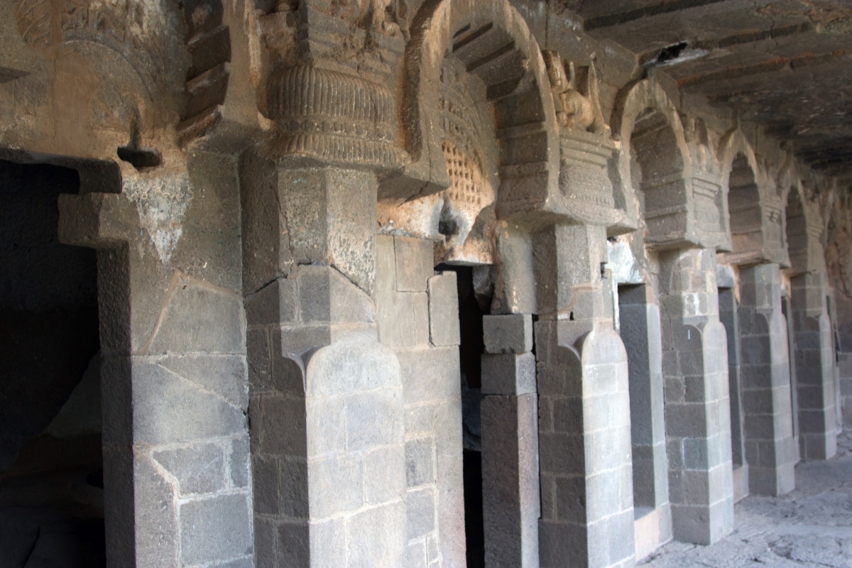 Во вторую по мощности пещеру ( № 4) можно войти через ворота, состоящие из широкой терассы, входной двери, защищенной нагами и стражниками . Опорой комплекса служит ряд резных Слонов. К сожалению, полностью рассмотреть слонов не получилось, я пролезла под закрывающую опоры ткань , чем вызвала удивление и смешок моего Секьюрити.