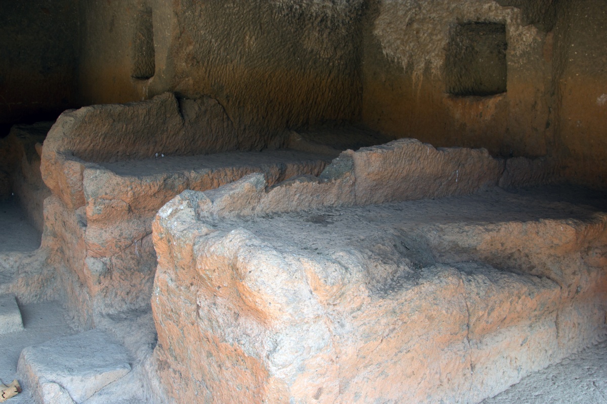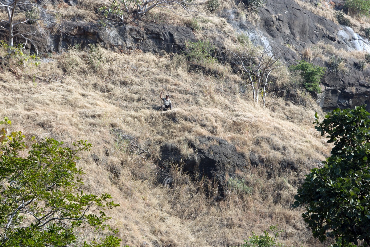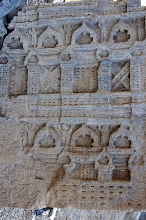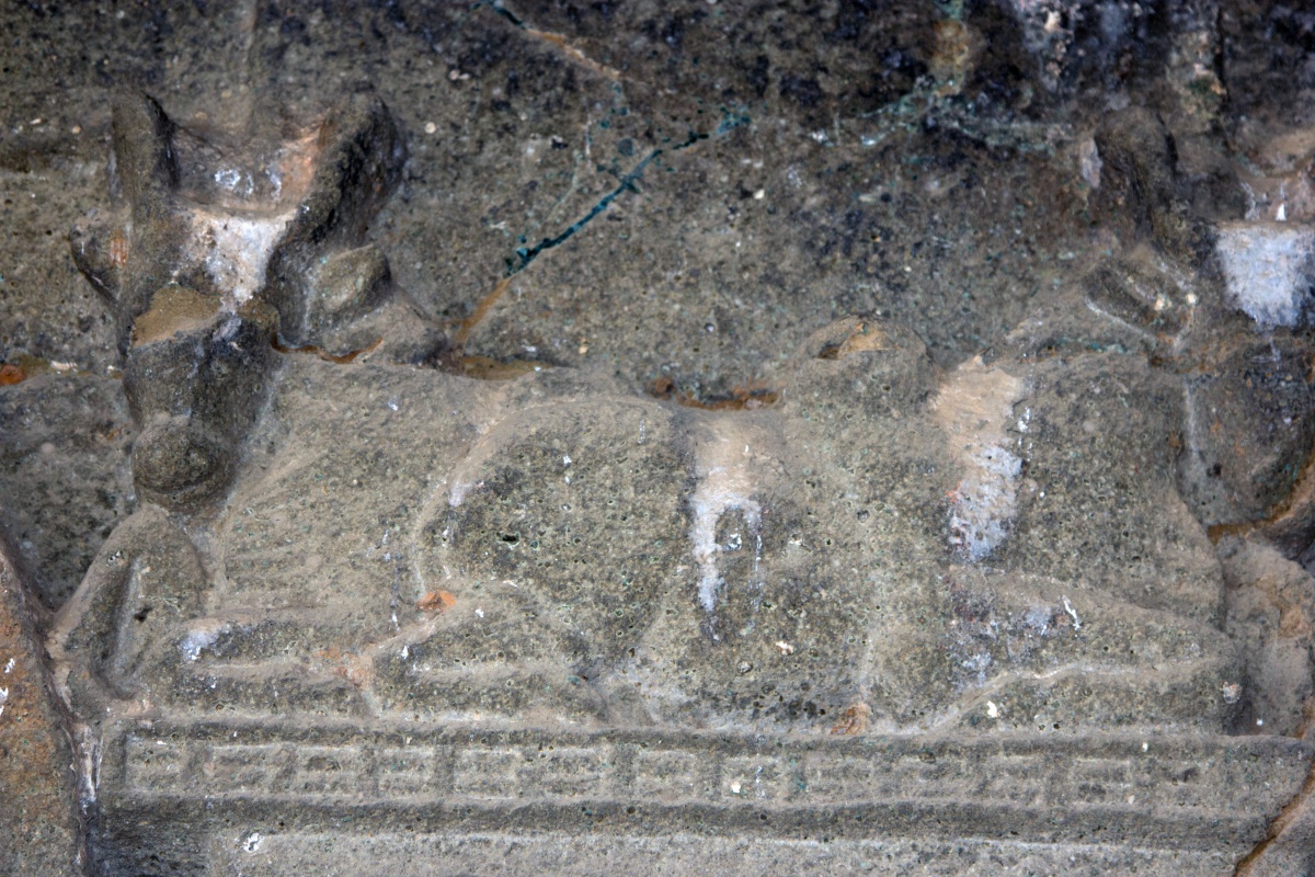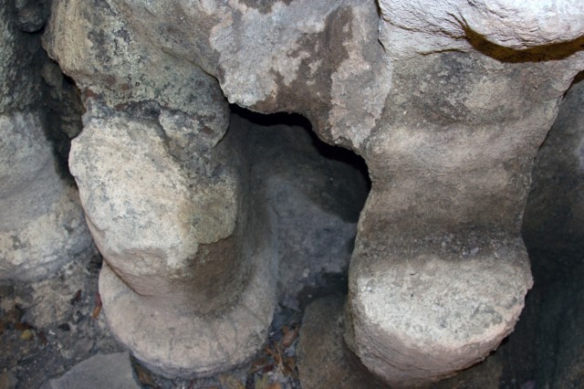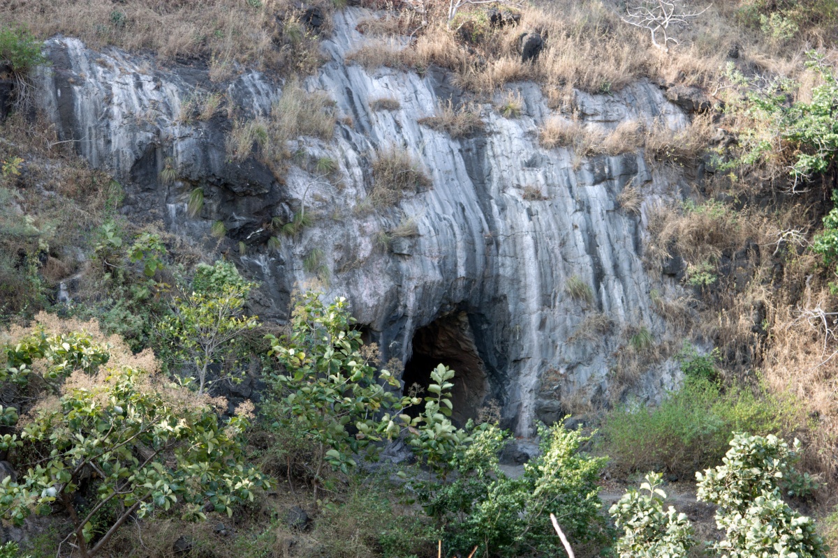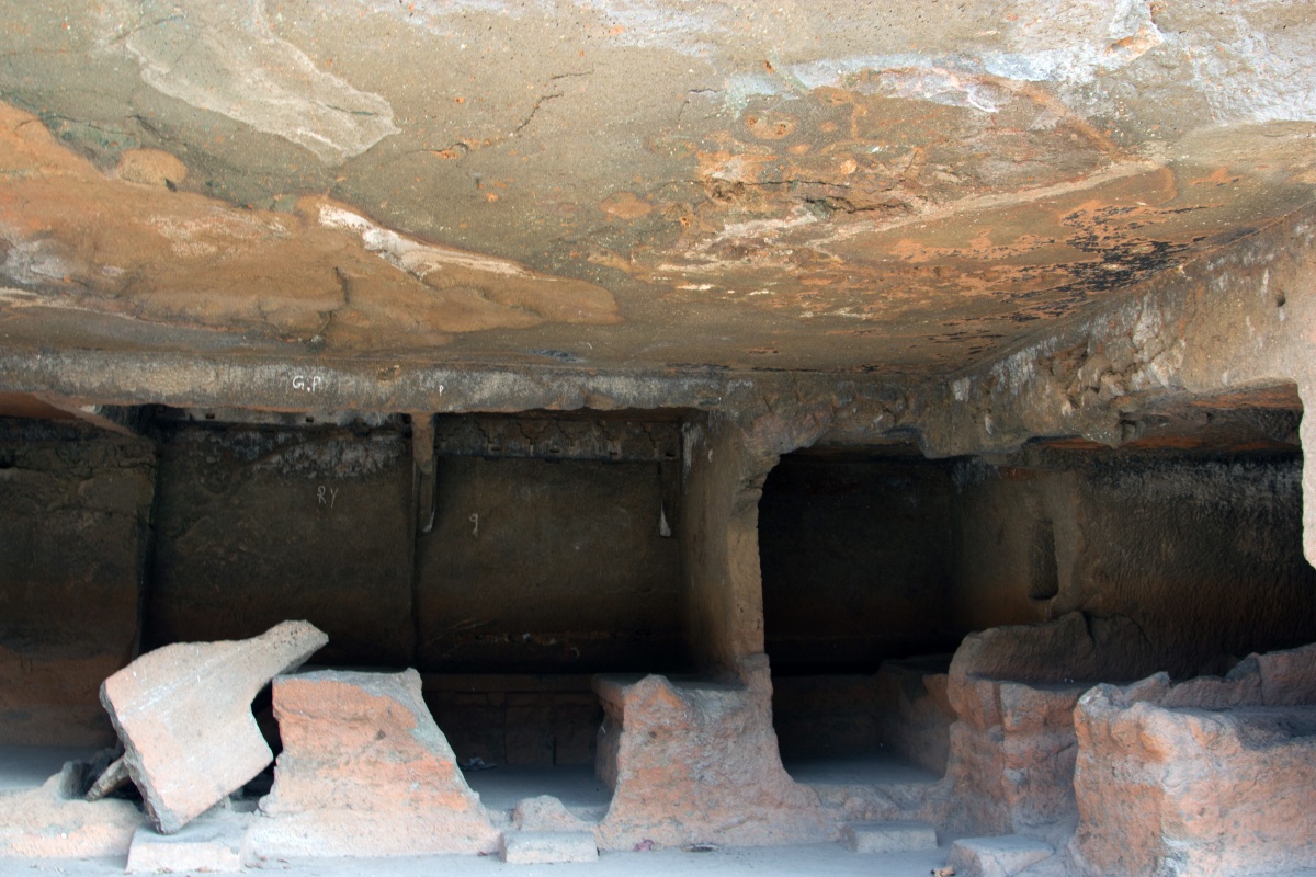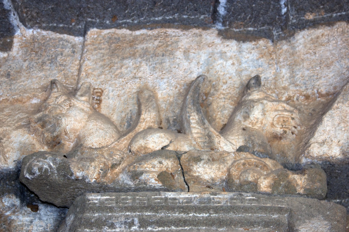 Во вторую по мощности пещеру ( № 4) можно войти через ворота, состоящие из широкой терассы, входной двери, защищенной нагами и стражниками . Опорой комплекса служит ряд резных Слонов. К сожалению, полностью рассмотреть слонов не получилось, я пролезла под закрывающую опоры ткань , чем вызвала удивление и смешок моего Секьюрити.