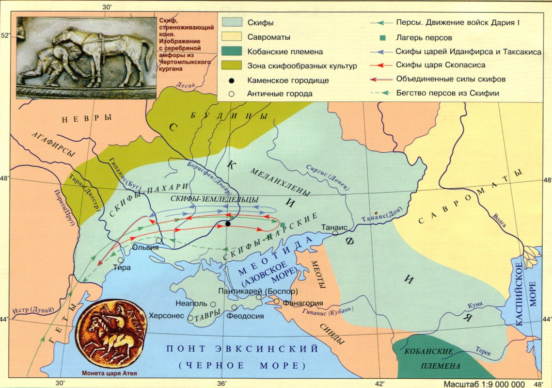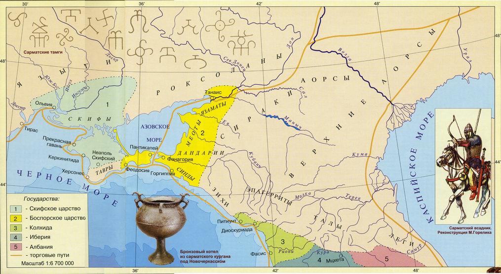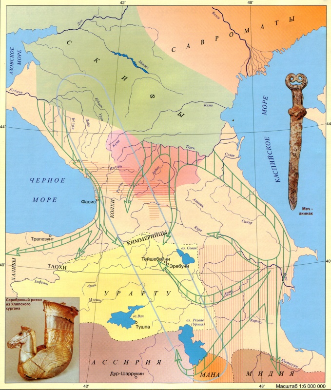 Предкавказскую степь скифы разделили с савроматами [сарматами] – своими родственниками и восточными соседями. Начиная завоевание новых территорий, скифы столкнулись с другим объединением иранских кочевников – киммерийцами. Проиграв скифам войну, киммерийцы уступили им причерноморские земли и отправились походом на юг – в Закавказье и Переднюю Азию. Следом за ними в 70-е гг. VII в. до н.э. в богатые страны Азии ворвались скифы. Разгромив Урарту, Ассирию, Мидию, они дошли до Сирии и Египта. «Скифское царство», созданное в Закавказье, служило базой для войн и набегов. Первым царем, который возглавил скифов в переднеазиатских походах, был Ишпака. Следующий грозный царь скифов – Партатуа. Его сын и наследник Мадий совершил последний грандиозный поход, завершившийся двадцативосьмилетним господством скифов в Азии.