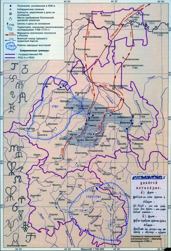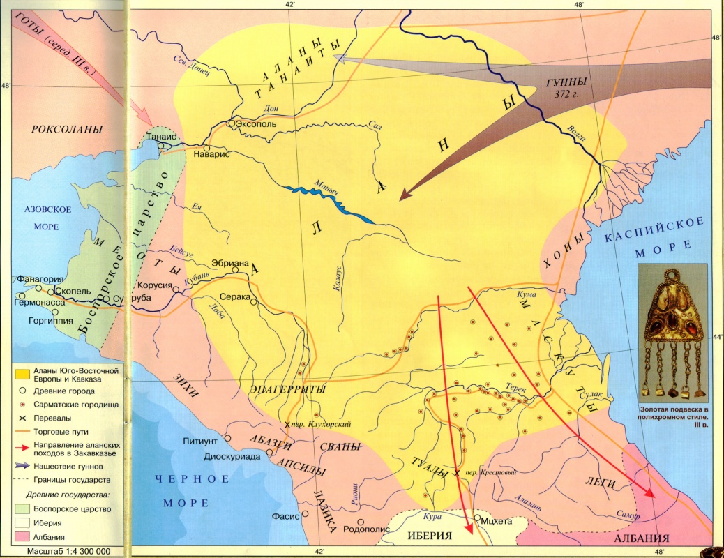Военные маршруты скифов пролегали по северокавказским и закавказским землям. Скифы двигались по перевальным дорогам и скоро освоили обе стороны Кавказского хребта. Приобретая политическое господство над местным населением, скифы оседали в среде носителей кобанской культуры [аборигенного населения Осетии]. Подтверждением тесного взаимодействия скифов и кобанцев является инвентарь кобанских могильников с VII в. до н.э. Известны изображения скифских воинов на бронзовом поясе из Тли, – глиняные фигурки бородатых скифов в типичных остроконечных шапках.