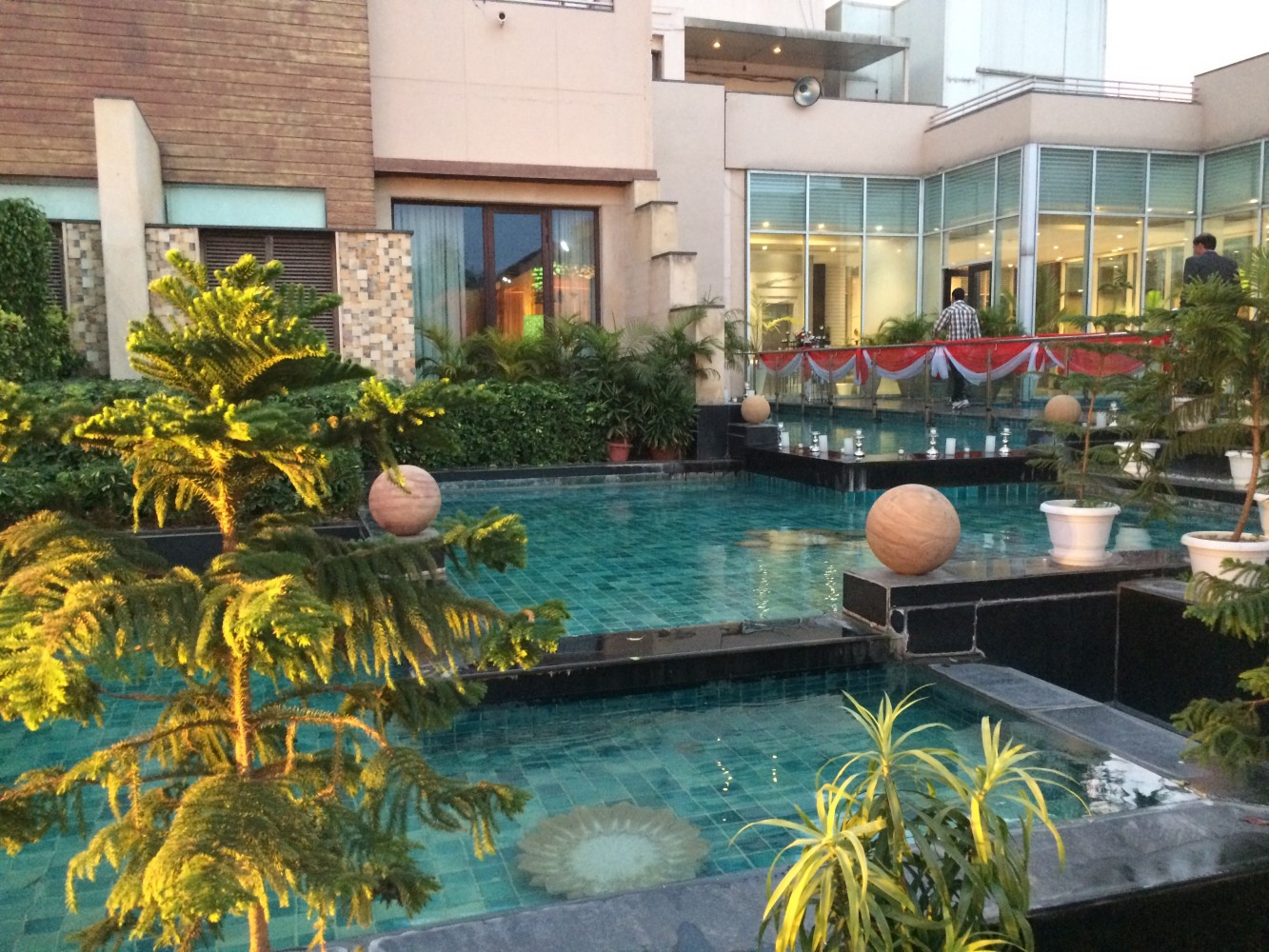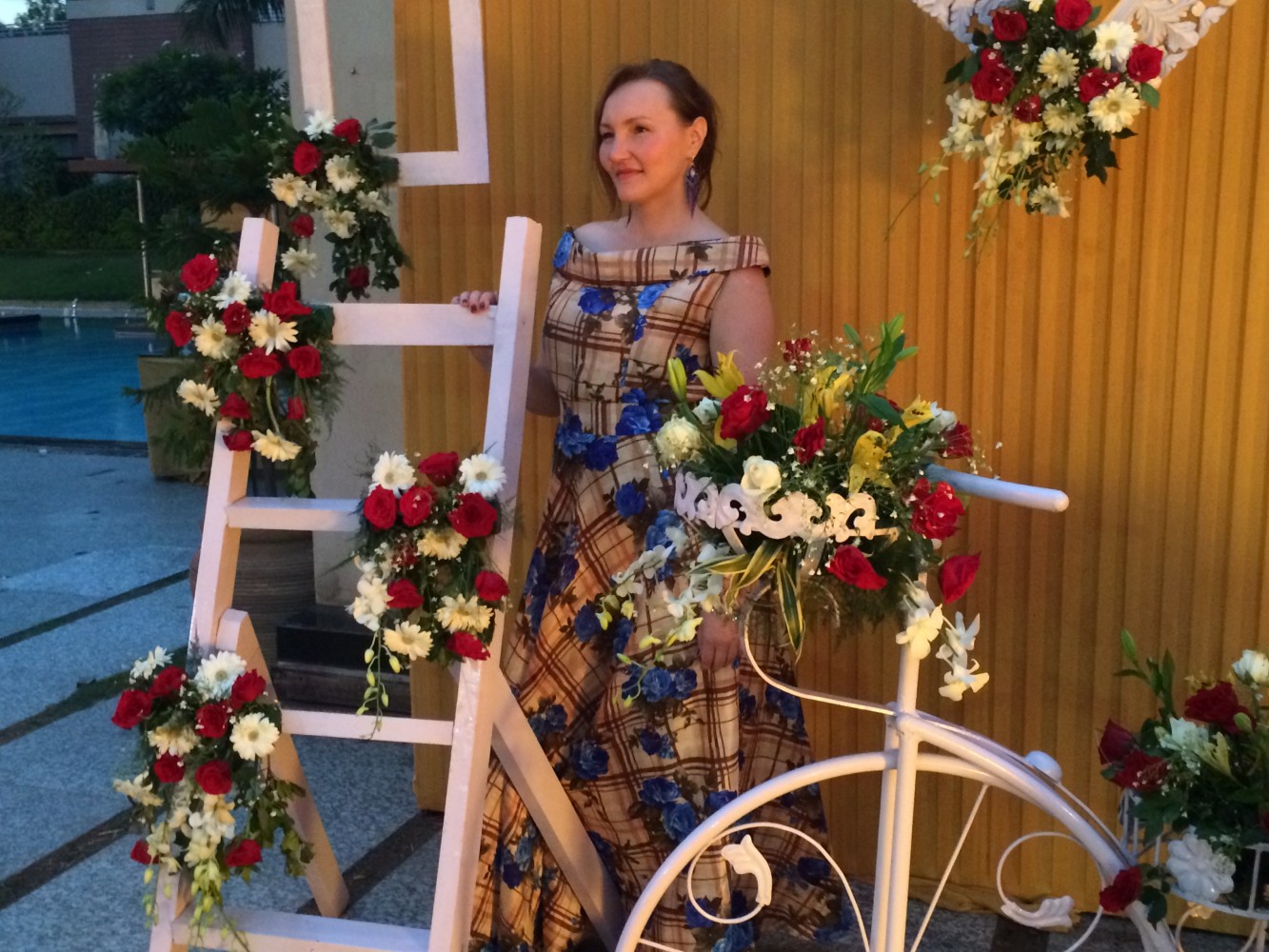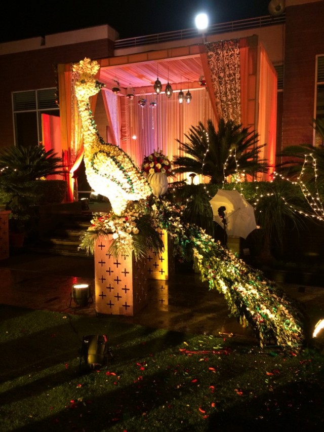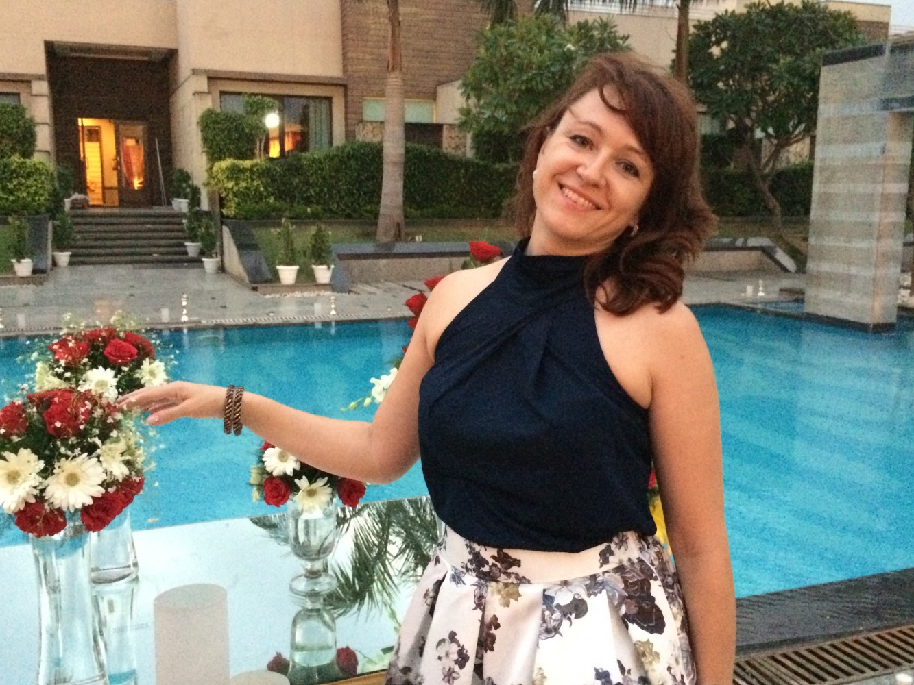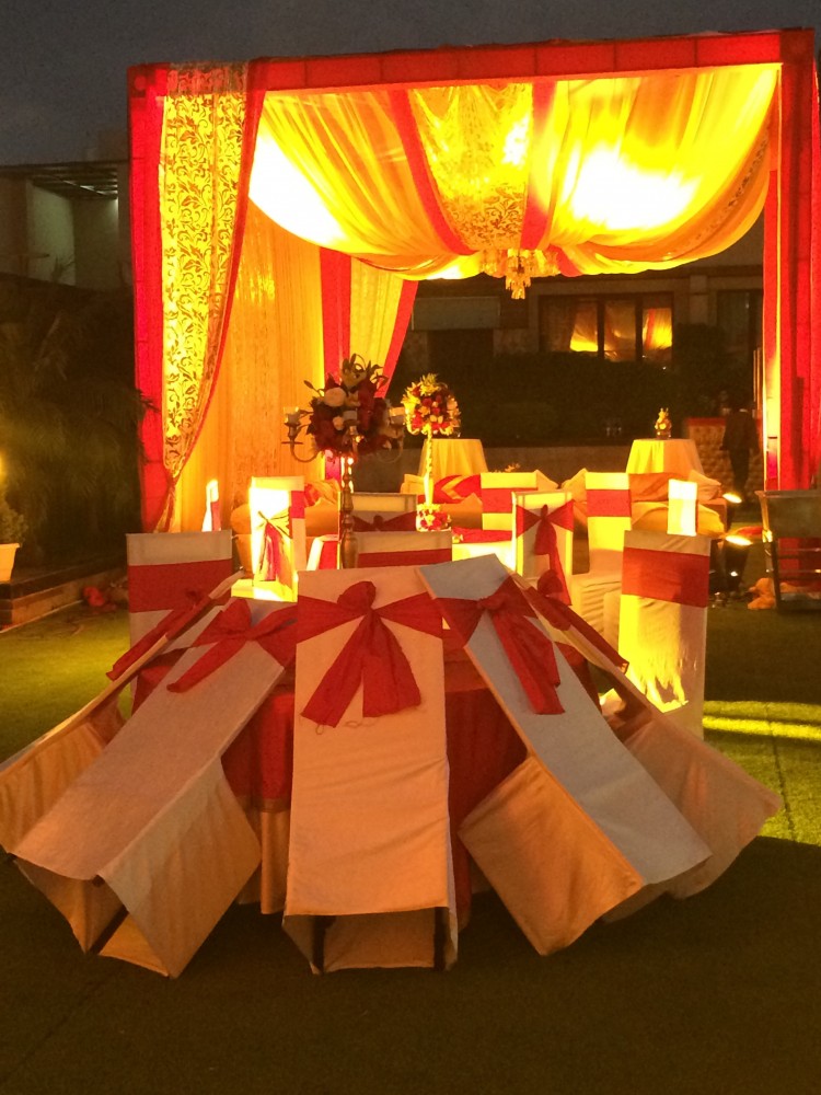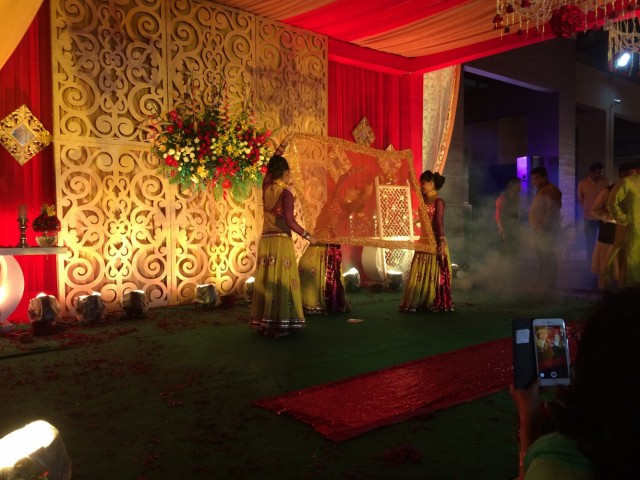 Гостями мы были седьмая вода на киселе, не знали ни жениха, ни невесту, и даже точно не были уверены с чьей стороны мы приглашены, предполагали что со стороны жениха. Знали только время начала церемонии и адрес: в 17:00, Oodles Hotel, Chattarpur. В этот раз решили пойти без подарков, собрались не спеша, Indian time, часам к шести приехали. Однако, когда мы подъезжали к отелю, позвонили друзья, которые нас пригласили, и сказали что церемония откладывается и начнётся после 20:00, но делать было нечего, мы уже прибыли. Час сидели наблюдали как собирают декорации для свадьбы, всё дорого, богато; фотографировались пока светло было, потом появилась Майори и стала нас развлекать разговорами, официанты с едой пошли, повеселее стало. Только мы расслабились и стали получать удовольствие от мероприятия, как хлынул ливень, пришлось нам срочно эвакуироваться внутрь помещения. Тут и остальные гости стали подтягиваться. Так как свадьба интернациональная: жених индиец, невеста казашка, а живут они давно в Лондоне, то и гости были соответствующие, родные и друзья из Казахстана и Великобритании. И практически все русскоговорящие. Здесь у меня случился сбой программы- я в Дели! На индийской свадьбе! И вокруг меня люди говорят по-русски!