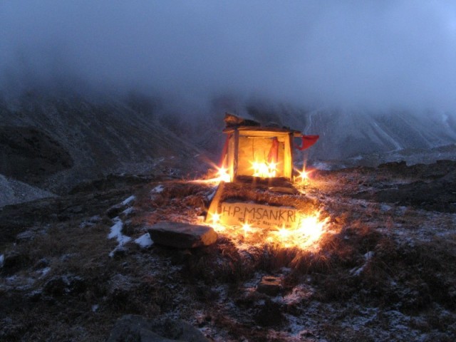 И, наконец, третий вечер я праздновал на стоянке Кедар Кхарак, на берегу реки Кедар Ганга на высоте 4350 метров. Пожалуй, это было самым ярким и одновременно тихим торжеством