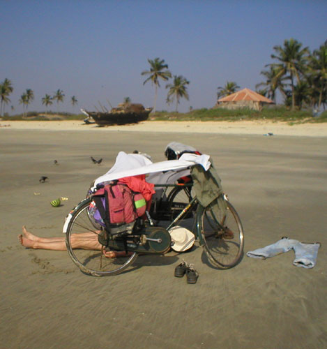 Как-то решили передОхнуть и натянуть простыню на велики в качестве тента от солнца. Задремали, а тут прилив начался. Ну и океанская волна под нас накатила промочив до нитки все что на нас было и вдобавок никогда не просыхающие джинсы сохнущие неподалеку. Мы ошалелые едва успели выскочить из под тента, как песок из-под колес великов вымылся и вся конструкция рухнула чуть нас мирно спящих не придавив. Сперва подумали,-Наконец-то цунами. А то ждешь ждешь.