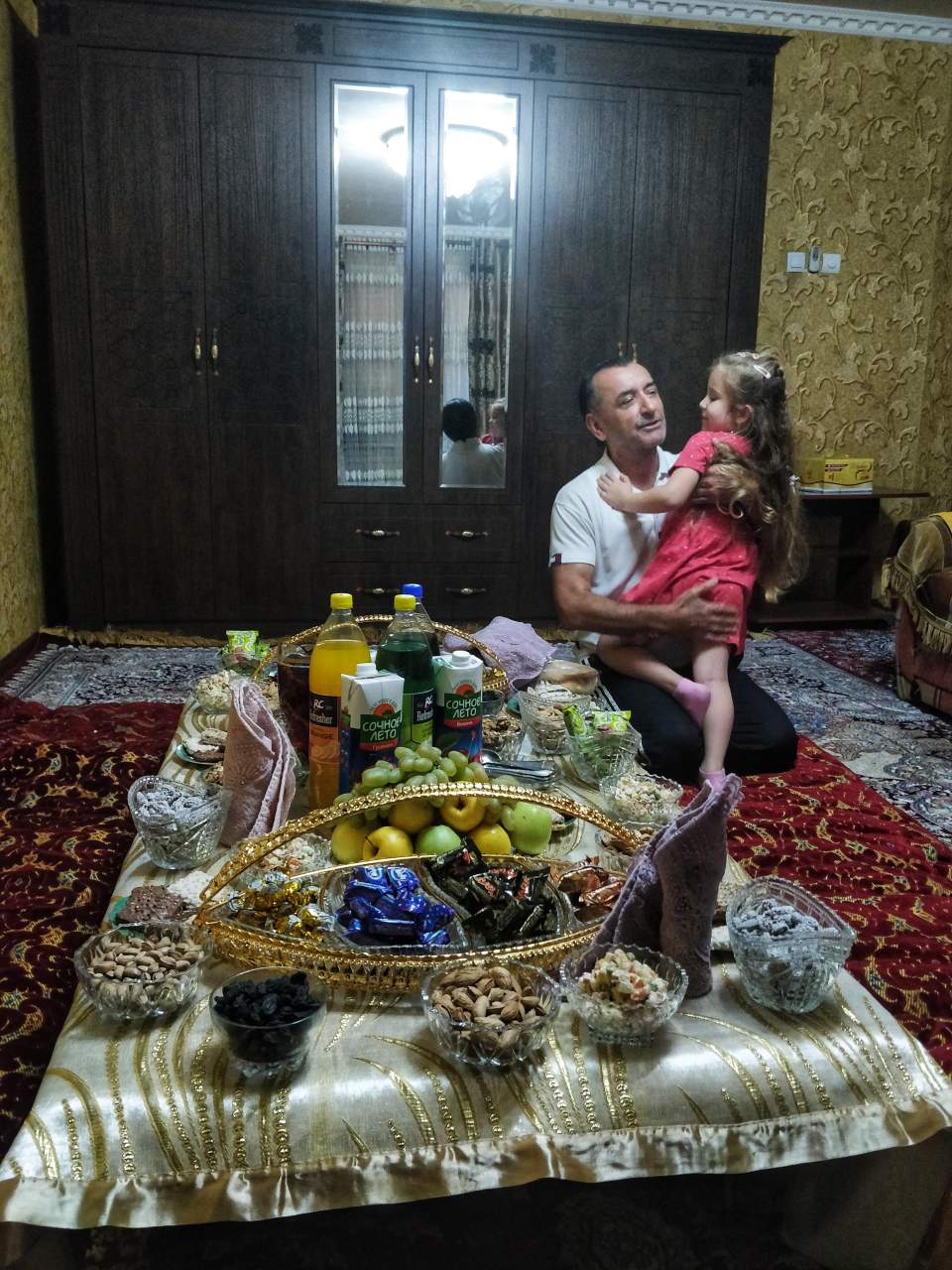 Авроре повезло больше, у нее оказался очень контактный дедушка и большая любвеобильная бабушка. С ней играли, кормили, целовали, обнимали и всячески восхищались, все это она обожает. Ещё бабушка обещала пойти с ней "на базар" и купить все, что внучка пожелает. Аврора очень прониклась и много раз заявляла, как она их всех любит. Поскольку мы в Душанбе сняли отдельную квартиру, Авроре настойчиво предлагали остаться ночевать в гостях, и на ее категорический отказ даже немного пытались манипулировать, дескать, раз ты нас любишь, то должна остаться. Сошлись на том, что она ещё не раз придет в гости, пока мы здесь, но надеюсь уже вдвоем с папой. Сижу на кухне с холодильником, набитым гостинцами от свекрови и снимаю стресс узбекским 🍷)