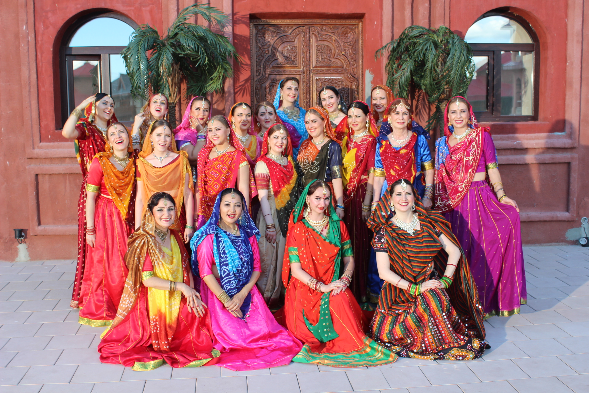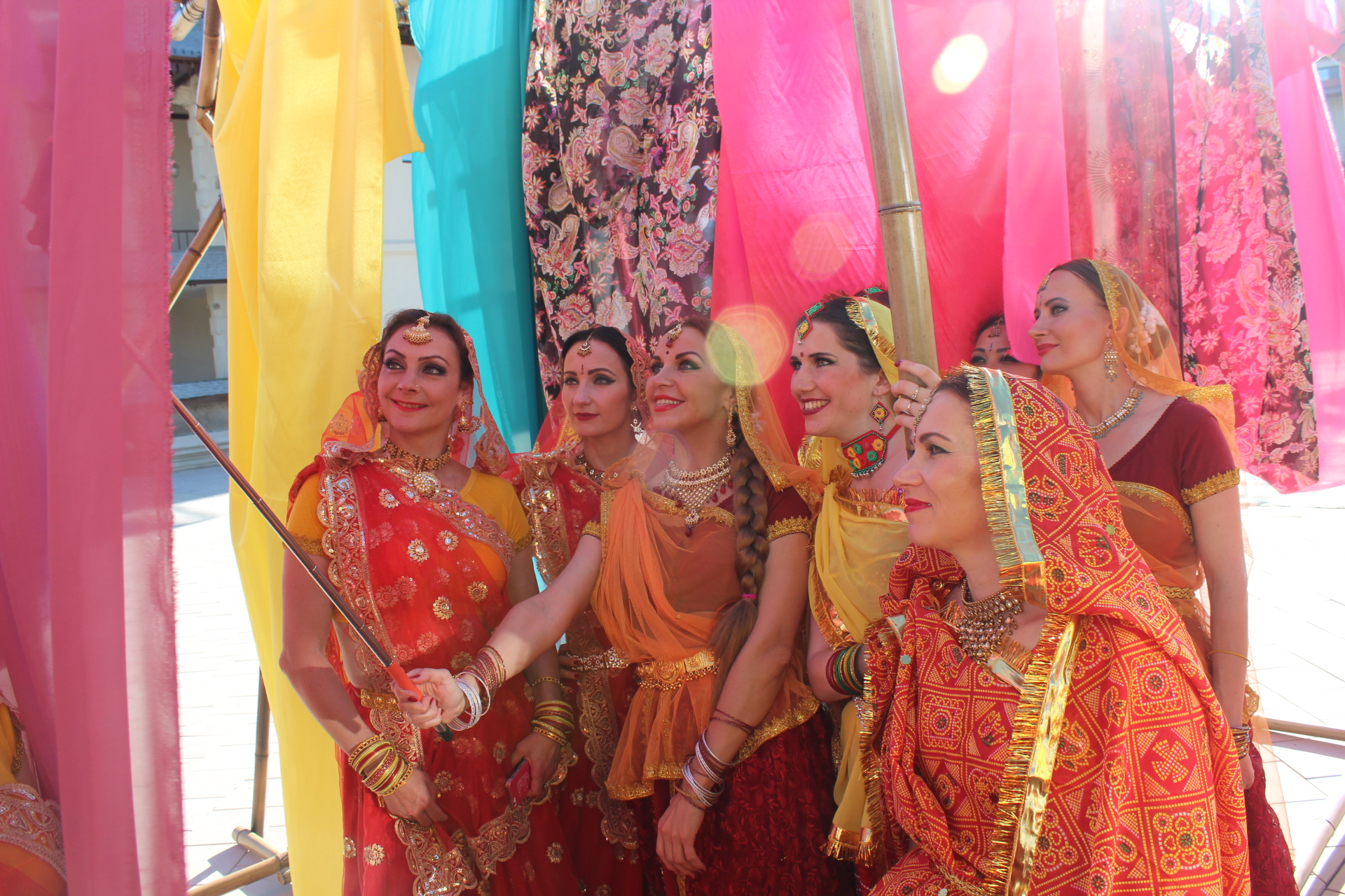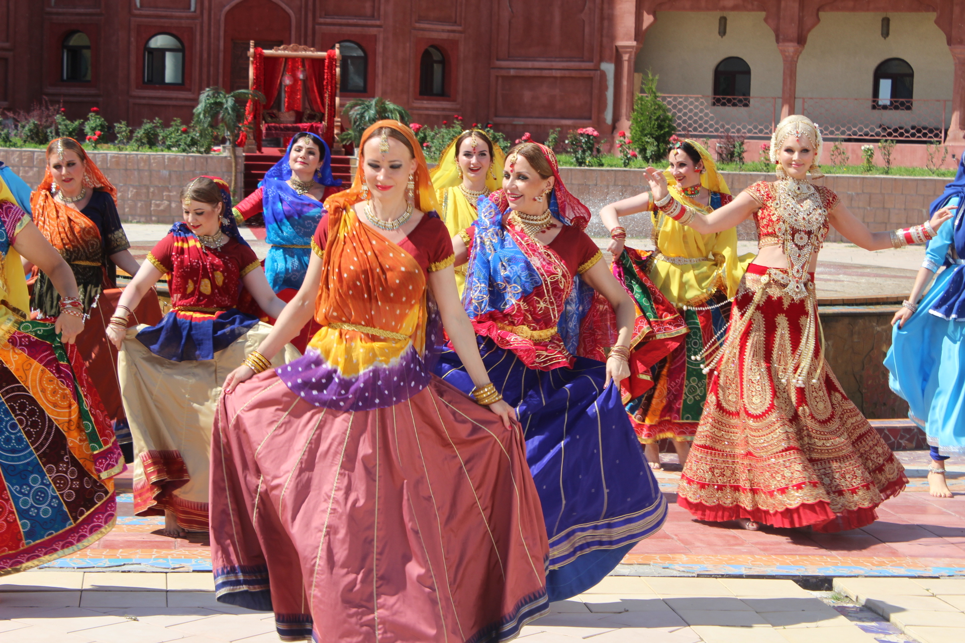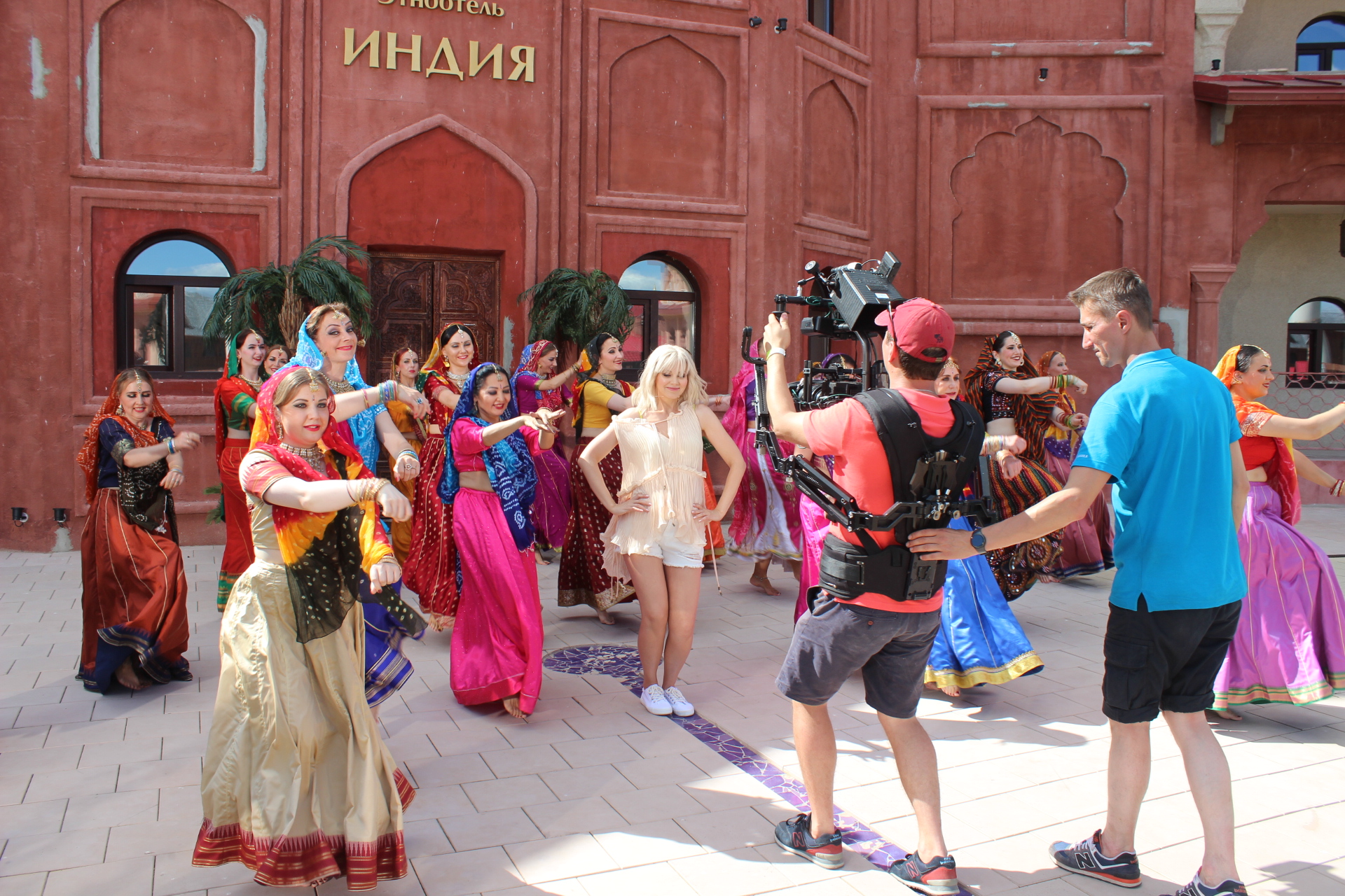 Мы все заехали накануне, потому что график съемки был довольно плотным. В 9 утра мы позавтракали, а потом сразу начали одеваться и гримироваться. В 11 утра у нас был час на репетиции, а потом сразу съемки. Мы были очень рады, что наши танцевальные заготовки понравились режиссеру. Сначала мы много раз репетировали, чтобы и Натали смогла танцевать с нами, а потом снимали много дублей. В общем, это все было несложно, но очень-очень утомительно, и совсем не танцами, а тем, что постоянно нужно ждать - то когда солнце выйдет из-за тучи, то когда на камере поменяют линзу. После обеда у нас было свободное время, во время которого мы много фотографировались - все при параде, да в индийских интерьерах. Во второй половине дня нам надо было переодеться в другие костюмы, но загрузка была совсем небольшая - нужно было фоном стоять, пока Натали гуляла по базару. К шести вечера наша часть съемок завершилась и мы пошли на ужин. И казалось, что вечером уже можно расслабится и отдохнуть, но не тут-то было. В половине десятого вечера мы все собрались на репетицию и ещё час в холле гостиницы отрабатывали движения на следующий день.