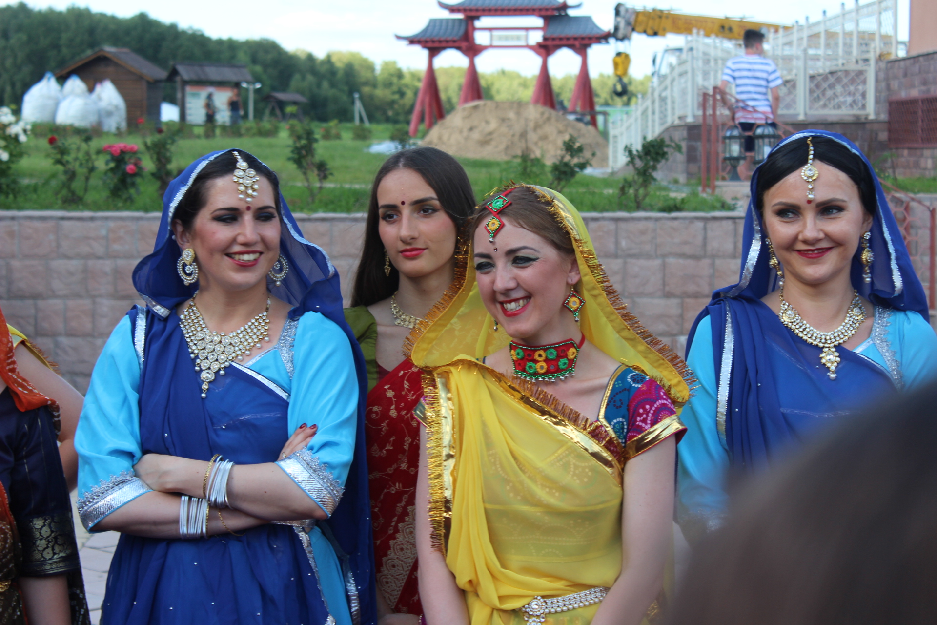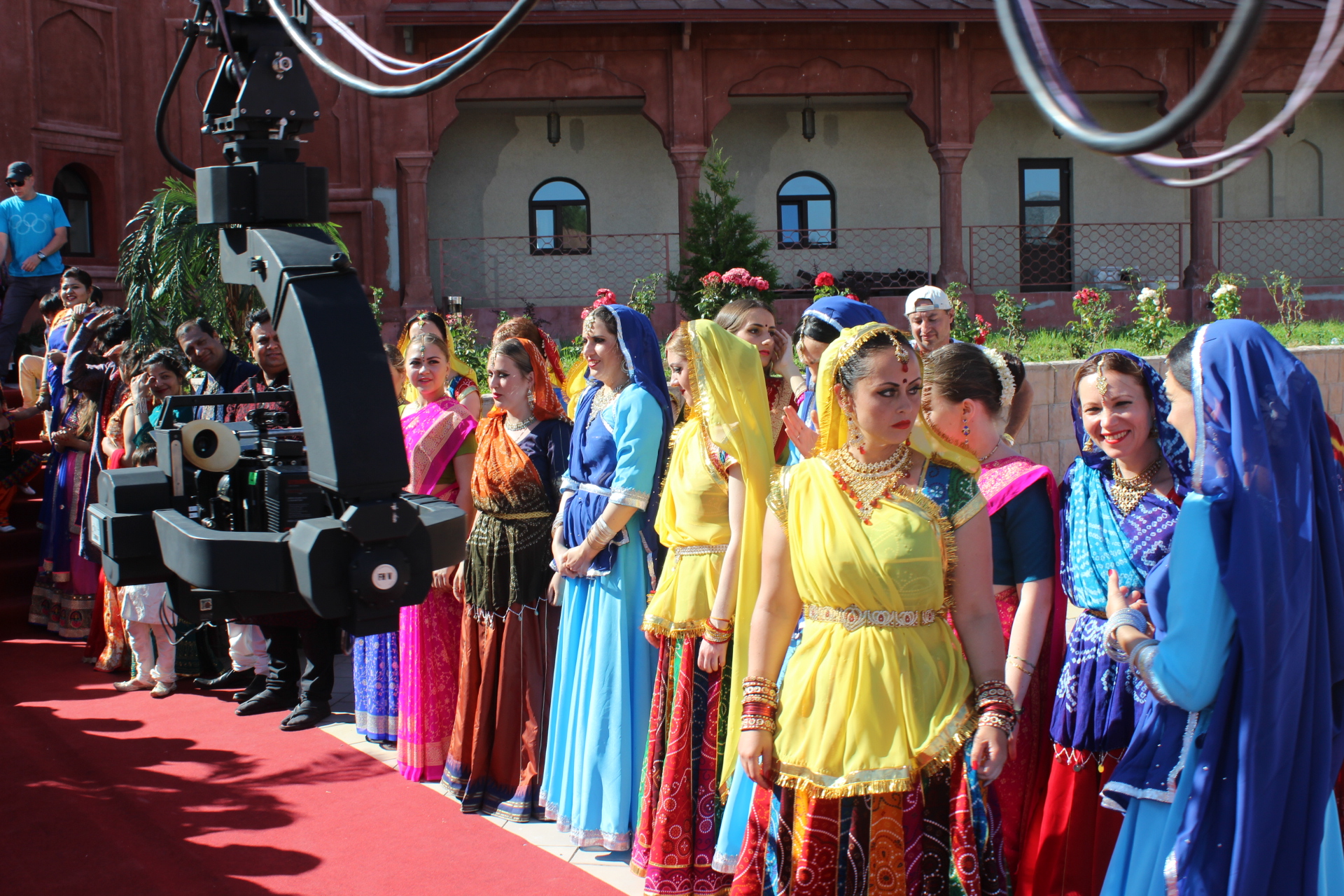 Подъем на второй день был в 7:00. Потому что съемки начинались уже в 9:30. А это означало, что на завтрак в 9:00 мы уже все должны прийти накрашенные и полностью одетые. А это занимает не меньше двух часов. Когда мы вышли на съемочную площадку нас ждал неприятный сюрприз. Оказалось, что наши красные костюмы оказались слишком похожими на красные свадебную лехенга-чоли Натали и нам нужно срочно переодеться. К счастью мы все предусмотрительно взяли запасные голубые костюмы, которые шились к апрельскому концерту. Но было обидно, что тут же надо идти снимать с себя все украшения и костюмы и надевать всё заново - это заняло ещё час.