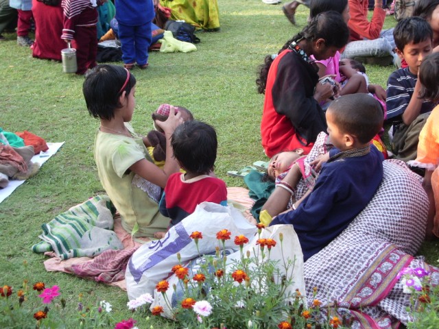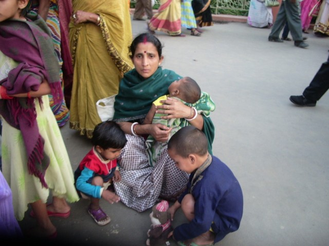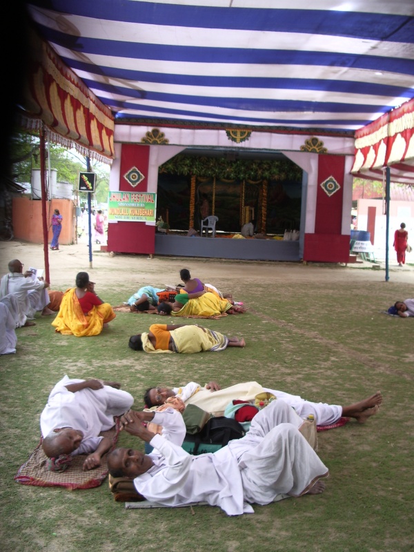 5 последних фотографий дают представление об общей атмосфере праздника и состоянии людей, приехавших сюда почтить своего святого Шри Чайтаньи . Весь газон заполнен людьми, уже обессиленными от избытка обрушившихся на них впечатлений. Недалеко от меня группка детей томилась возле спящей усталой матери. Я незаметно бросила в их кучу плюшевую мартышку, та свалилась на них «с неба», и они были обескуражены , никак не могли понять: откуда и как это взялось? Я была вне подозрений- они вообще не видели меня.
