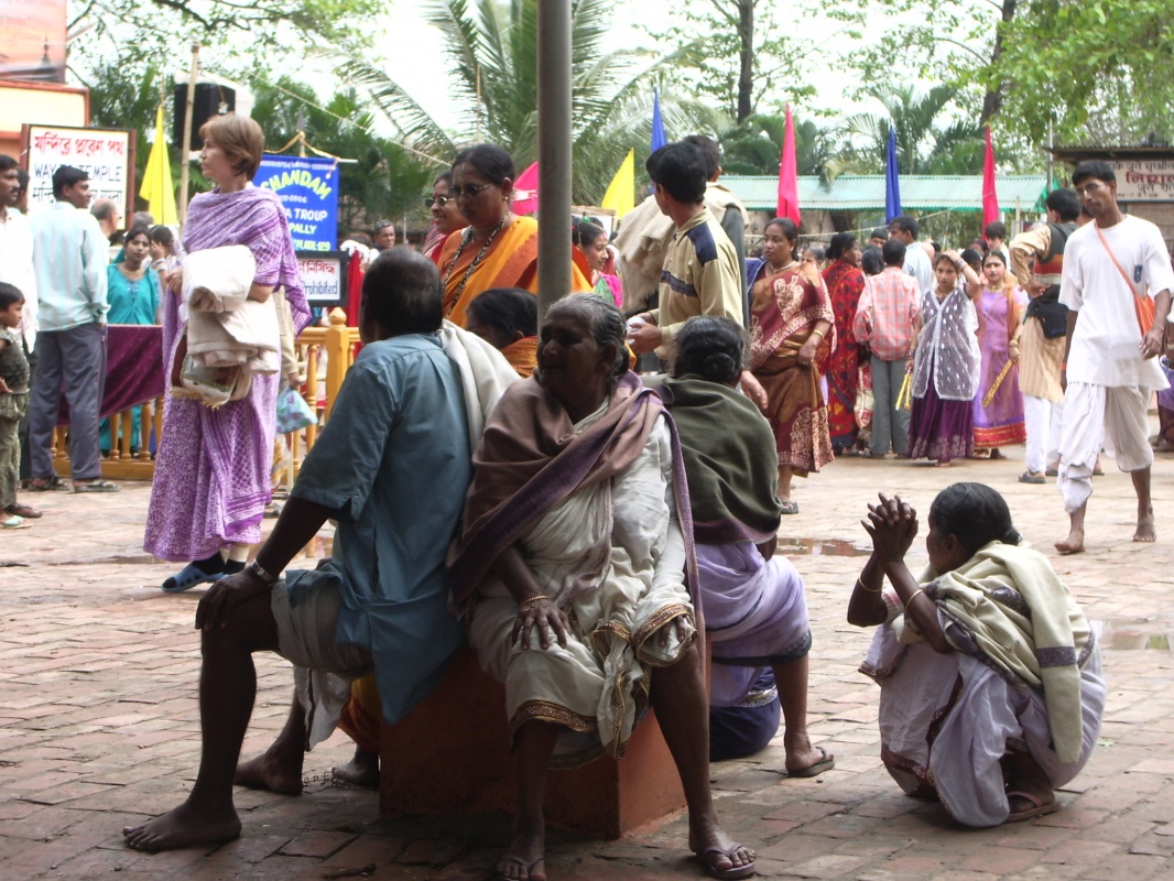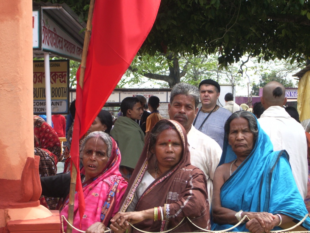 Из огромной массы людей я уже могла выделить тех, кто мне особенно симпатичен и интересен или заинтриговал какой-то особой экстровагантностью, на которую нельзя было не обратить внимание. Мой английский не позволял мне вступать в осмысленный, неформальный разговор с иностранными кришнаитами. Но не могу забыть «наших бывших»...73 летнюю женщину из Казахстана со сломанной рукой в гипсе. Доктор химических наук, приветливая, милая, она рассказала мне, что уже второй раз участвует в парикраме и страшно переживала, сломав руку, что не сможет вновь оказаться в Майяпуре, и как счастлива, что несмотря ни на что, она опять здесь, пусть и в гипсе.