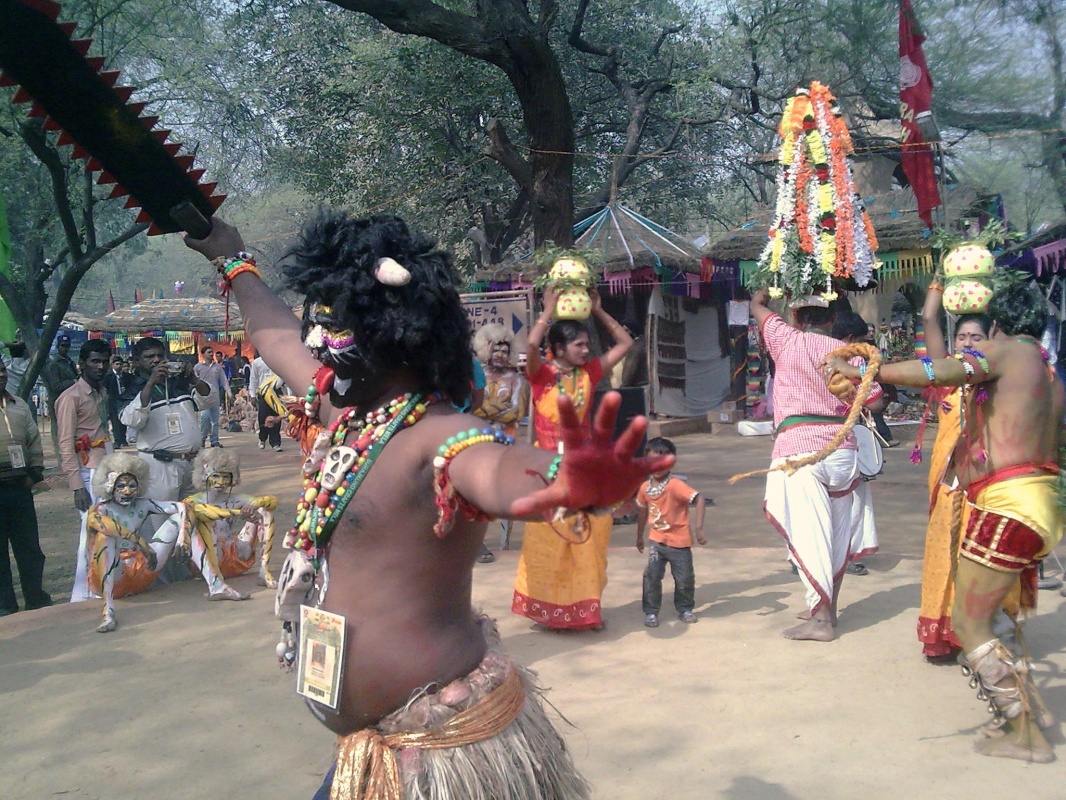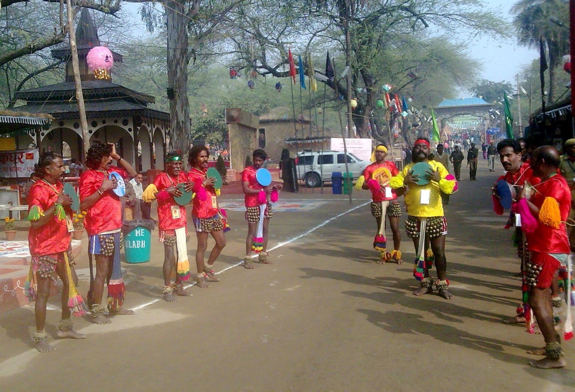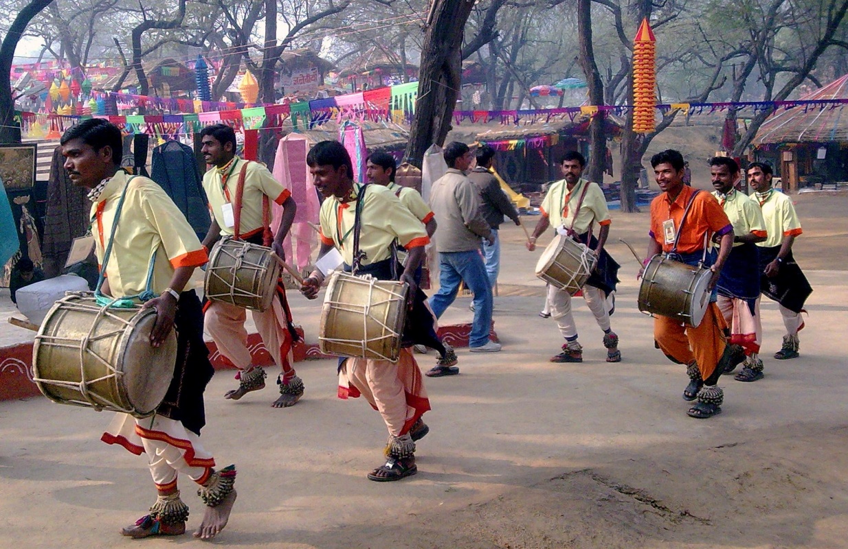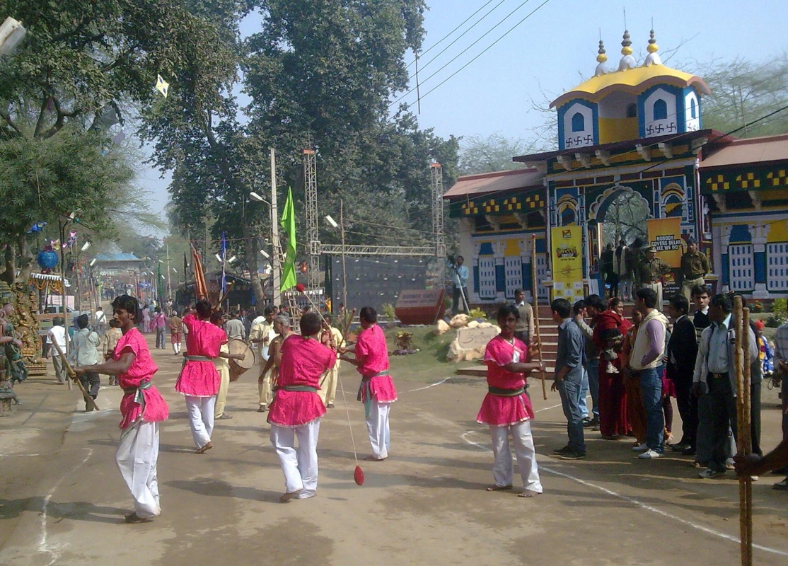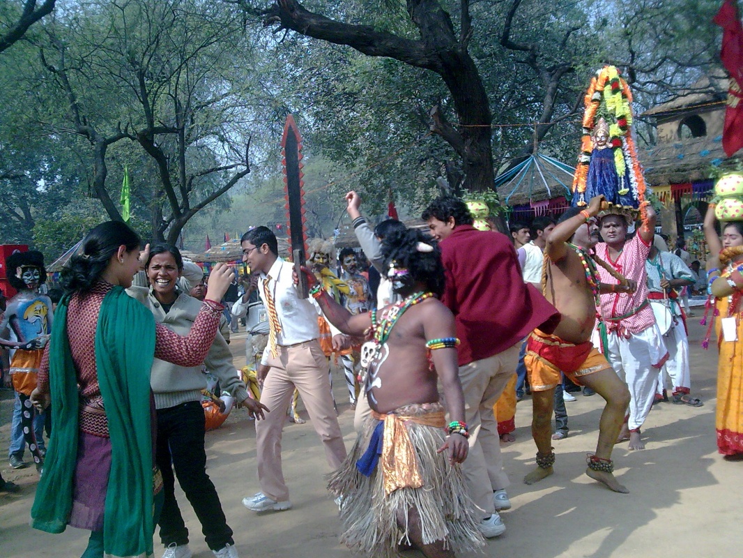 Но главное на Сураджкунд Мела это большое количество самодеятельных танцевальных групп из различных уголков Индии, выступления лучших из которых проходят на основной сцене под открытым небом (на одной их фото здесь сикский танец с бамбуковыми палками и мечами).