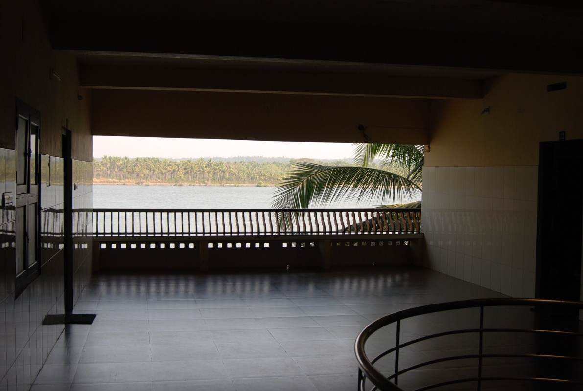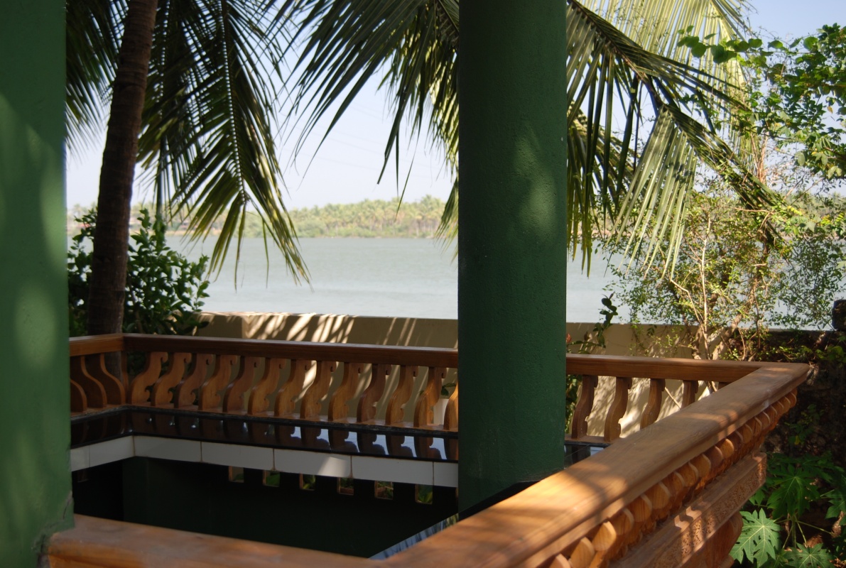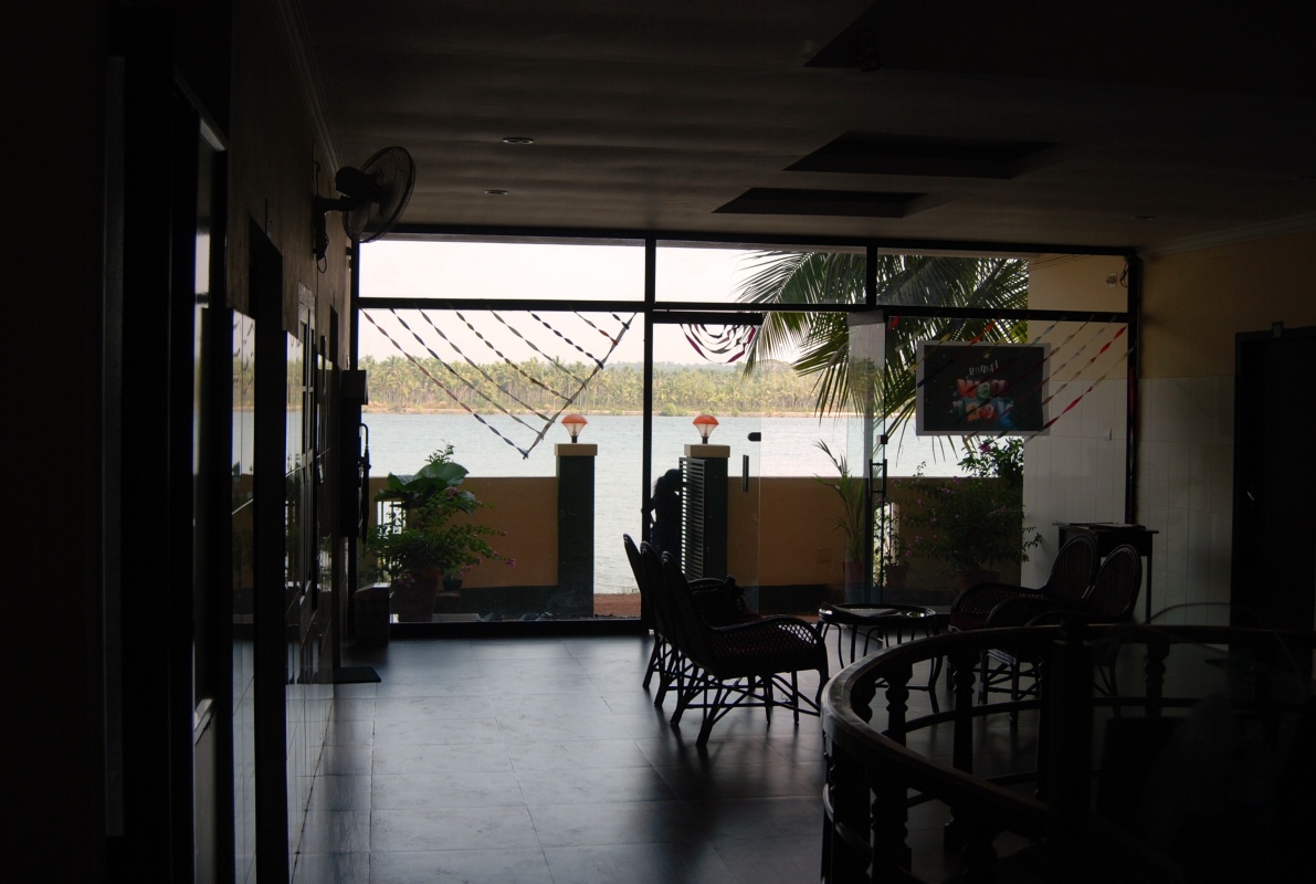 Место это я заприметил ещё в ноябре. Прежде всего, оно выгодно отличается от других своим расположением. На отшибе пригородной деревушки, прямо на берегу бэквотэр'а, фасадом на рассвет, панорамный вид... (см. фото) Кстати, фотки на их сайте совсем не передают всех этих выгодных сторон и очень зря. Подобные панорамы можно выхватить только на дорогих южных резортах, а тут цены вполне себе при сходном антураже. Прогуляться вечерком есть куда, закат посмотреть, рощицы, бережок и всё недалеко, народу никого особо: пара-тройка рыбаков проплывёт на закате штрихом к пейзажу, да мальчонка, раскрыв рот, прозвенит на велике... Красота, короче. Вдалеке, впрочем, всё же присутствует шоссе на мосту, но оно прилично так далеко и его не слышно совсем, оно даже как бы подчёркивает дистанцию и удалённость от всей внешней индийской суеты.
