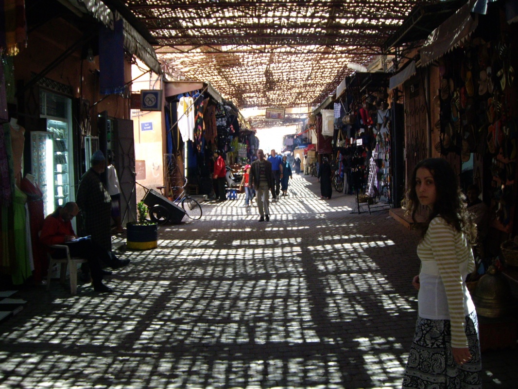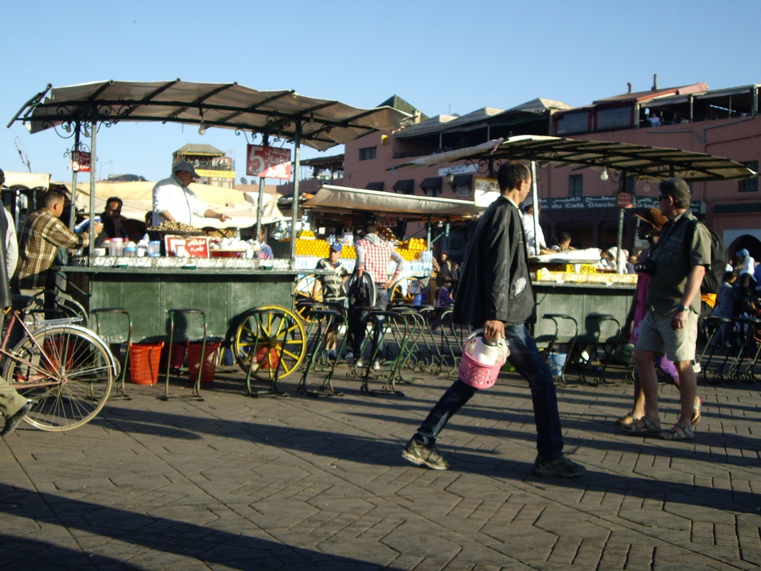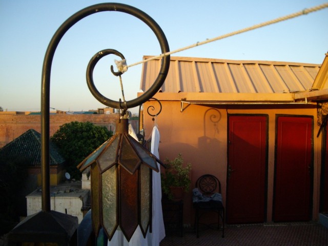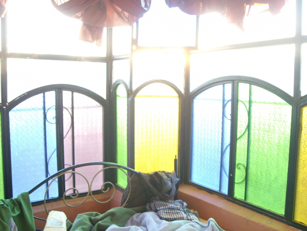 Должны были выехать в Марракеш в 7,но автобус сломался и его чинили,сказали на 9 поедет.Пошли есть в медину.Яичница в пончике-5Dh,чай 8.В начале 10 автобус и правда поехал,все местные) ехали 10 часов с остановками.Познакомились с местной девочкой,которой не нравится арабский и вообще её страна.Хочет в Америку)).Приехали на остановку недалеко от медины,дошли до неё пешком с помощью очередного местного паренька.Марракеш вечером забавный,пошире чем до этого в городах улицы медины. Заселились в одном из переулков,рядом с отелем Эссуэйра,там несколько подряд.Сняли комнату на крыше,с полупрозрачными разноцветными стенами) Слышимость улицы близка к 100%,но ощущения от этого не негативные.100Dh\сутки,душ и туалет на крыше и даже мини-кухня.После размещения пошли погуляли по улице,зашли в кафешку поесть.Кус-кус опять же) 30Dh и чайник чая за 16.Познакомились с русским мальчиком Ромой,немного прогулялись с ним.Местные,которые учились в РФ,часто тут с русскими попадаются,говорят и шутят при этом на ура)