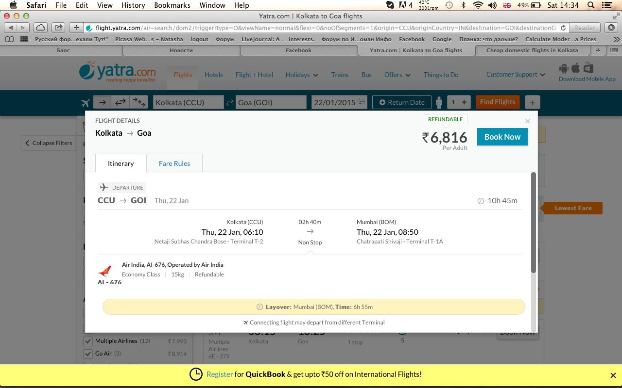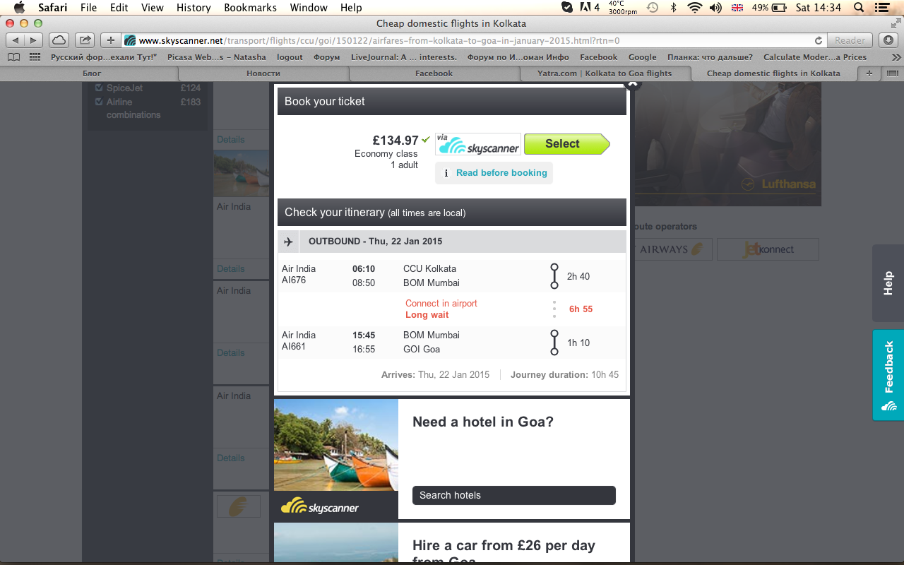 Например самый дешевый билет Калькутта-Гоа на 22 января стоит на ятре 6800 рупий (70 фунтов стерлингов), а на скае этот же билет уже 135.