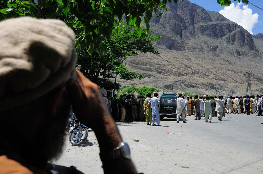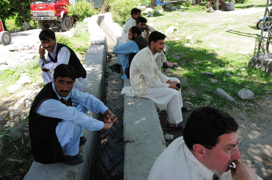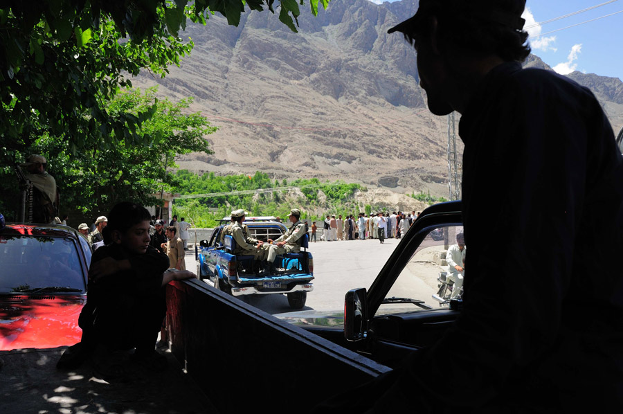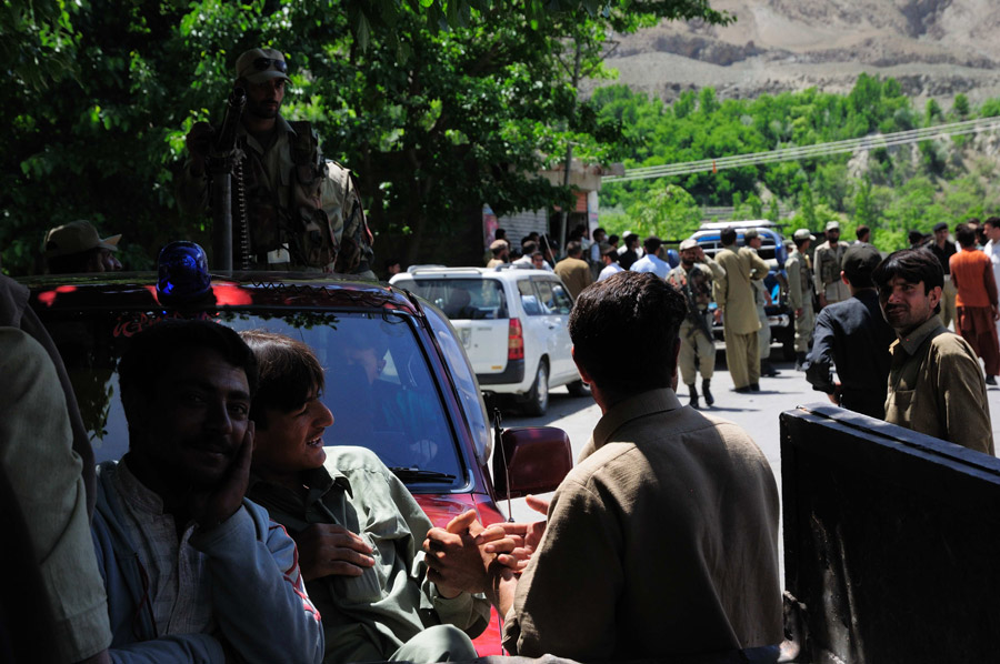 Выехав из Гилгита, мы обнаружили, что дорога в нужную сторону полностью перекрыта забастовщиками. Они заблокировали мост еще с 8 утра. Вся дорога была забарикодирована автобусами, машинами и грузовиками, а также людьми, которые не могли попасть на другую сторону. Кое-кто высказывался, что, мол, все должно закончиться через полчаса, однако все говорило о том, что забастовщики закрепились тут надолго.