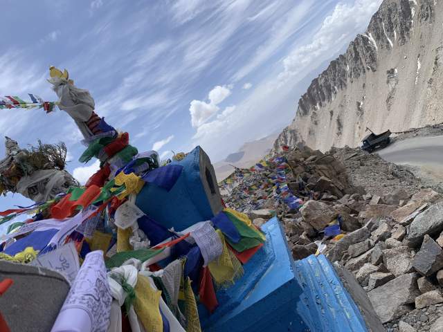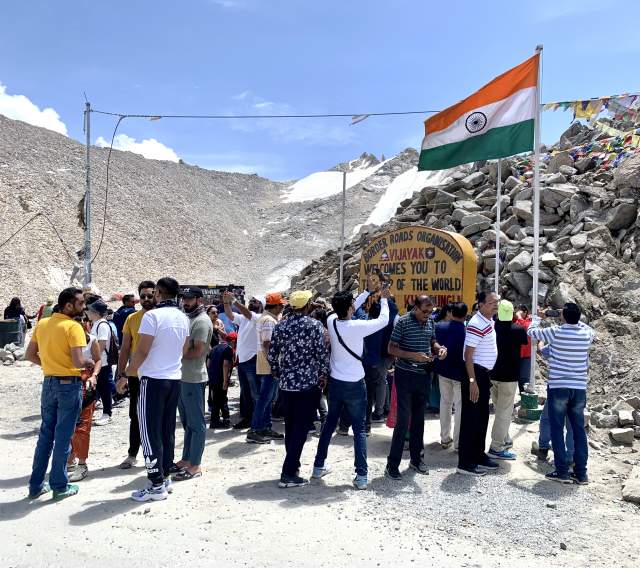 Наверху ажиотаж из индийских туристов. Тут тебе и байкеры в тяжелом экипе, и пассажиры автобусов в шлепках и мини юбках. И индийские бабушки дедушки и редкие белые туристы. Все мечутся между обманчивыми надписями про самый высокогорный в мире перевал и кафешками.