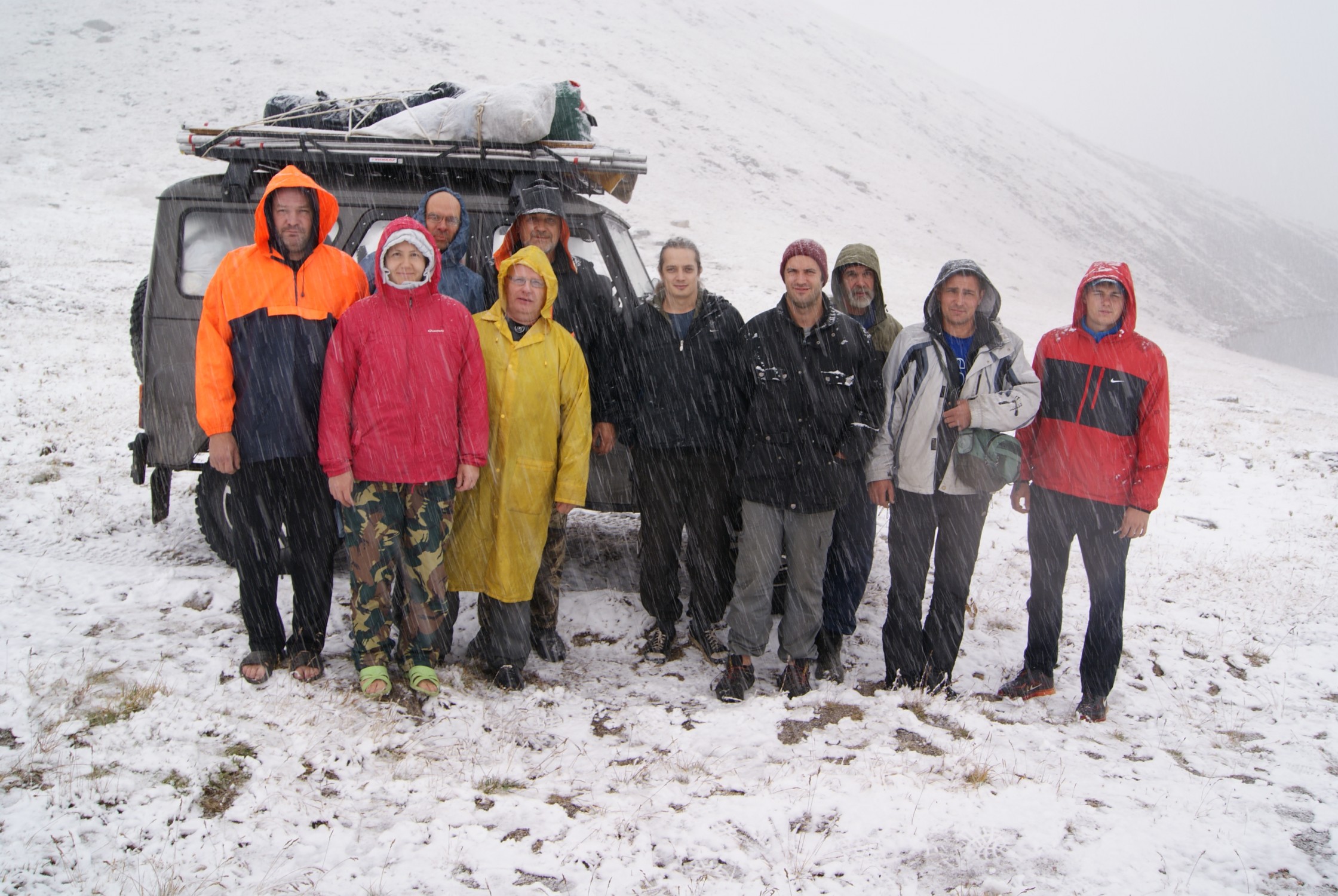 Через 3 часа, уже к темноте, машины подъехали. Точнее, машина. Из нее почти выпал второй водитель, старик алтаец. Наверно, это был промысел божий, что он уже засадил свою машину в дерево (сбоку). Вдесятером (и 15 рюкзаков. Йо-хо-хо, и пузырь самогона!) в «буханке» - не сахар, меня плотно прижали к дверце. Температура быстро ушла в минус, и меня спасла куртка (еще раз спасибо жене!) и плотная пенка на бедре.