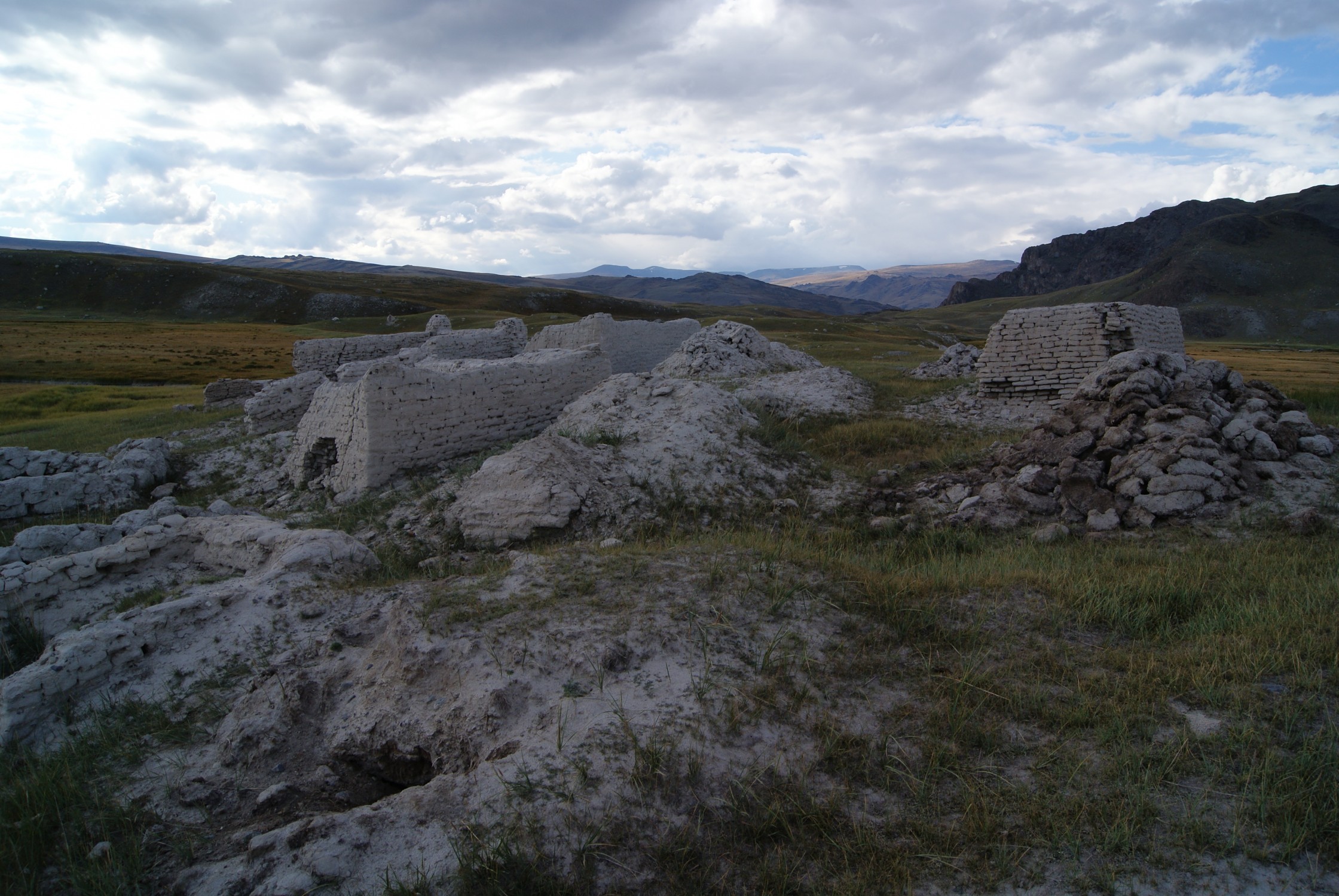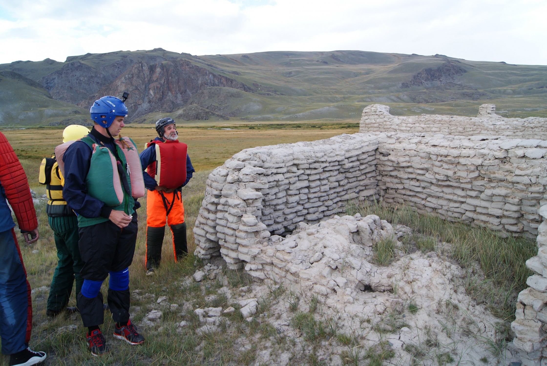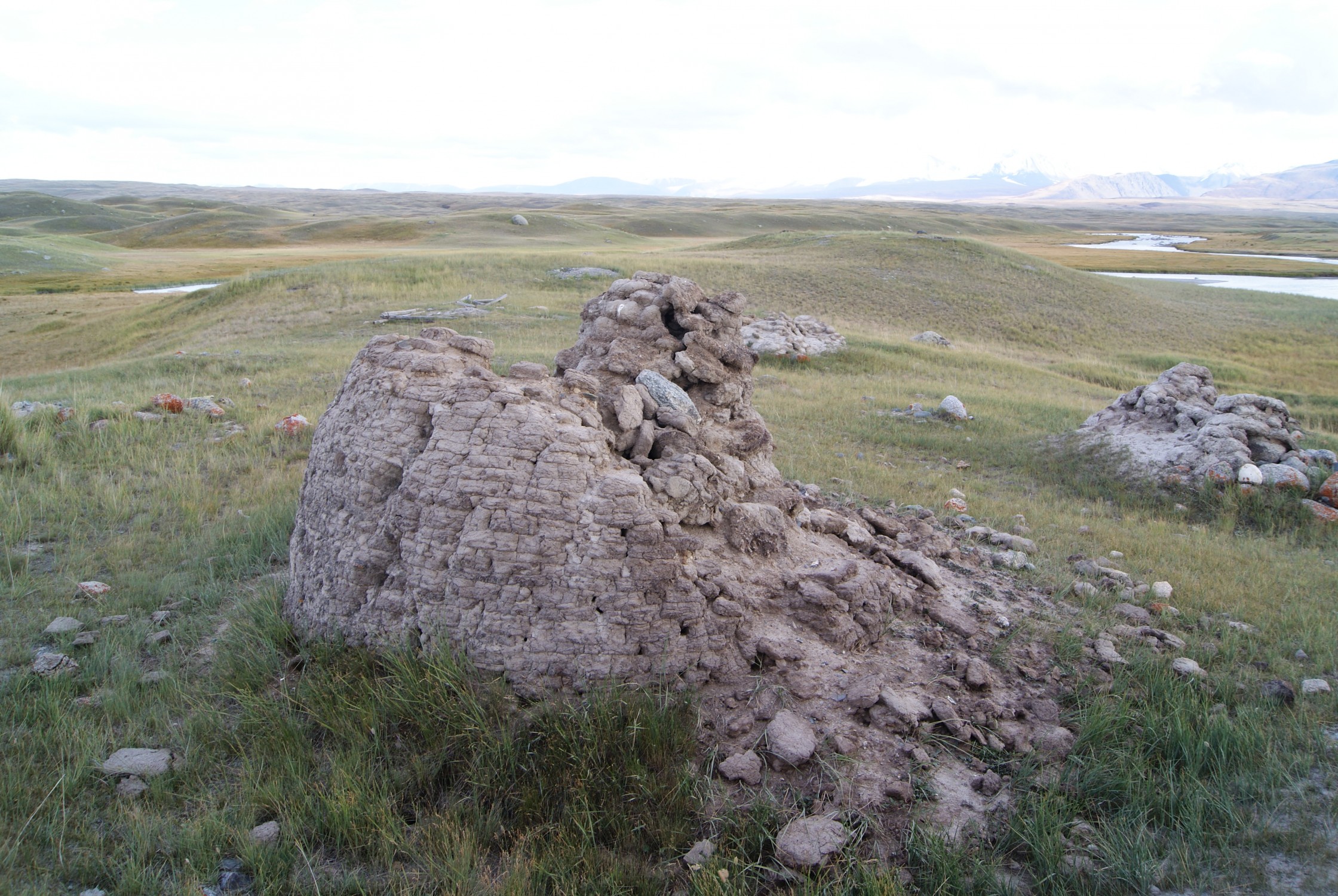 Но в целом знаменитое плато Укок сильно разочаровало. Кто сказал, что здесь было сильное государство? Простите дилетанта, но на мой взгляд здесь разве что сусликов разводить. Место захоронения "алтайской принцессы" тоже тянуло на кладбище - и не более. И второе место, к которому мы подплыли, лишь поначалу казалось поселением. Михалыч сразу ткнул в особенность строений из саманного*** кирпича: дверей не было. Задача стен -не прикрывать живых от непогоды, а удержать неживого. И - как и на захоронении " принцессы"- кучи камней. И все.