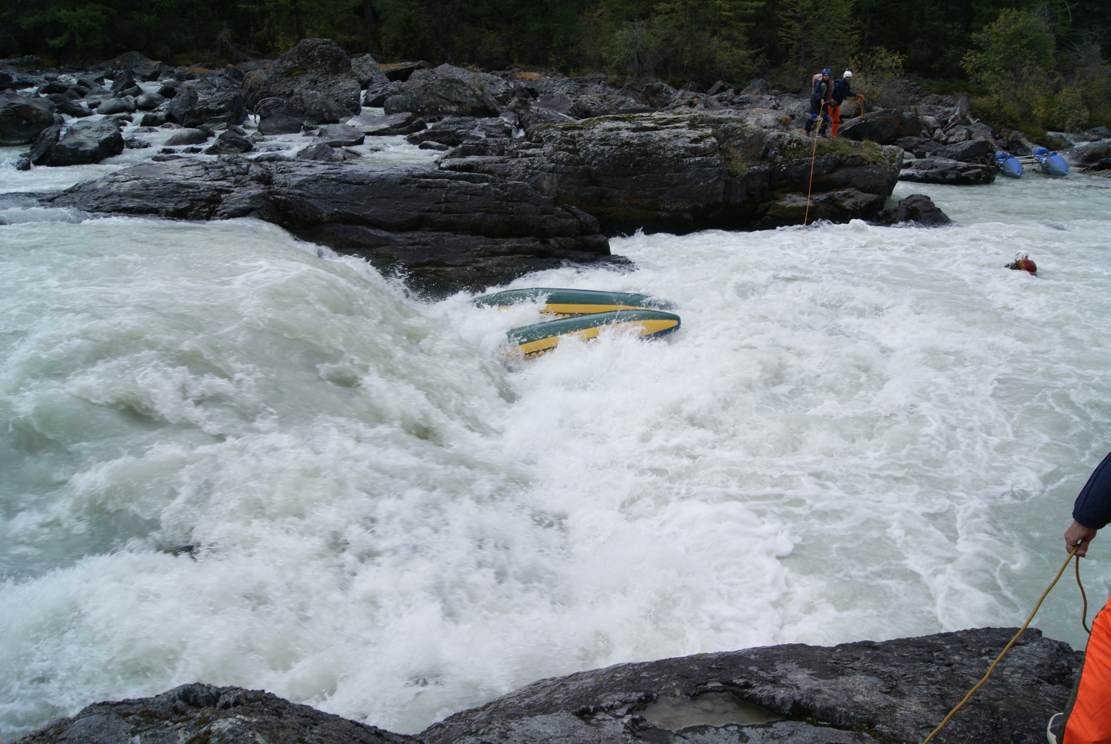 Их швыряет, крутит, весла, засунутые по самую рукоять, ничего не дают, моркву ловят со 2-го раза. Но тянуть неоткуда. Дальше расширение, скал нет. По воде не побегаешь.