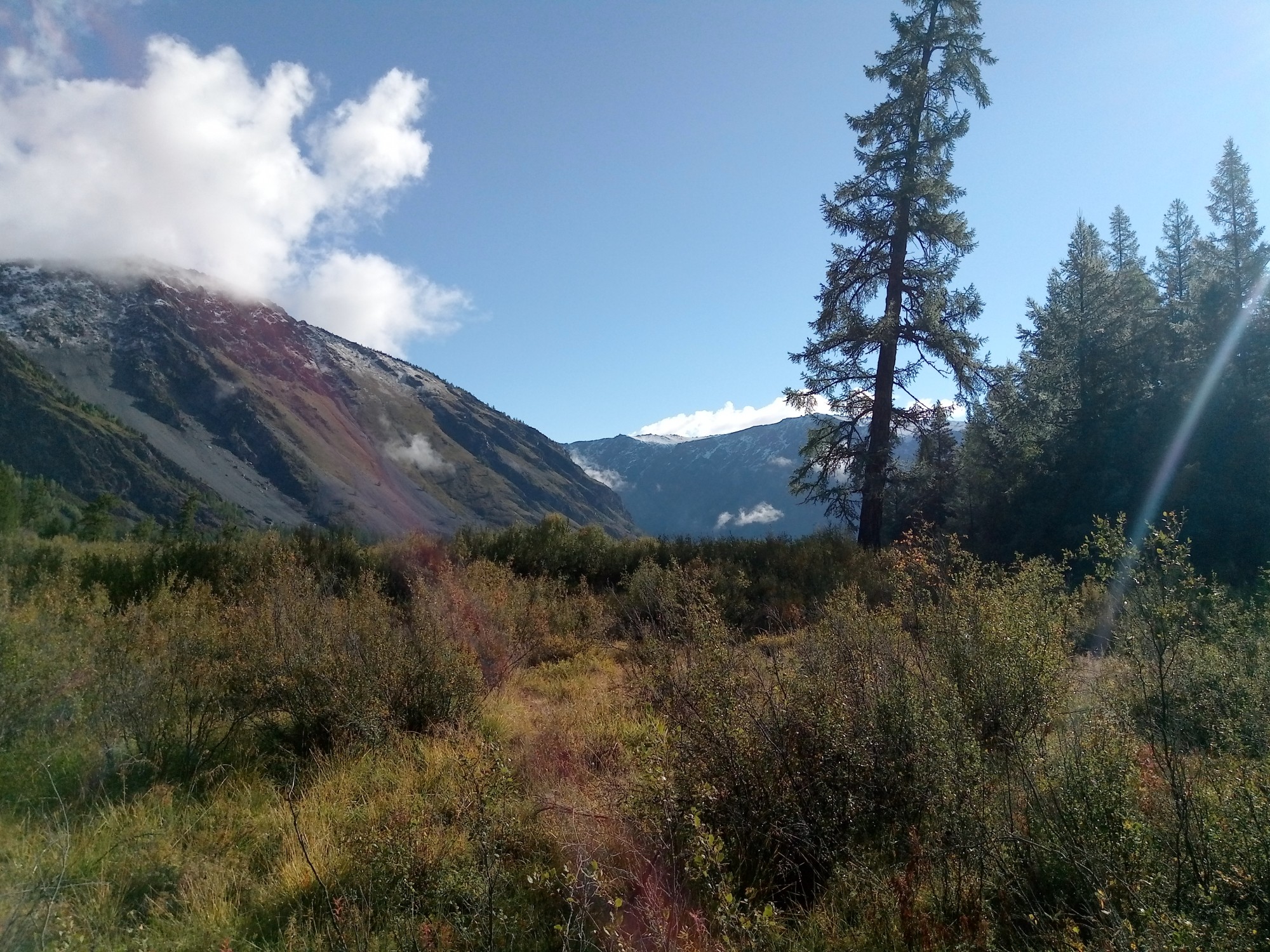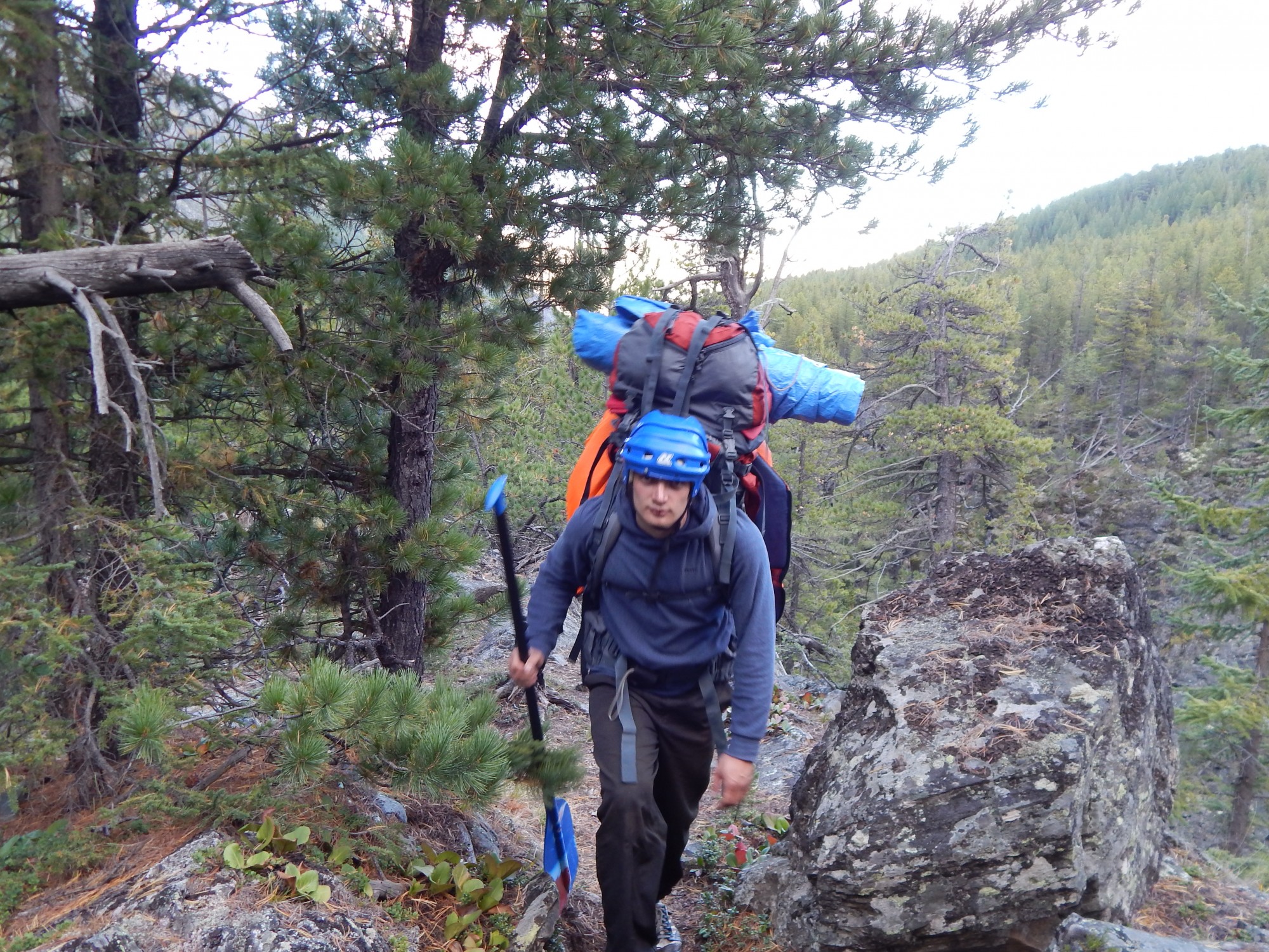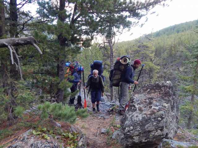 Разбираем каты, часть вещей (жаль, что не ремнабор. 5 кг, а использовался он чуть-чуть) прячем. Сначала тащим вещи. Тащим долго – сначала вверх, через отрог хребта, потом вдоль реки, и через болотистый луг. Хорошо, что тропа! В одном месте потеряли, влетели в метровые кочки. Потом, слава богу, увидели – тропа справа, по осыпи. Да, лучше камни, чем кочки.