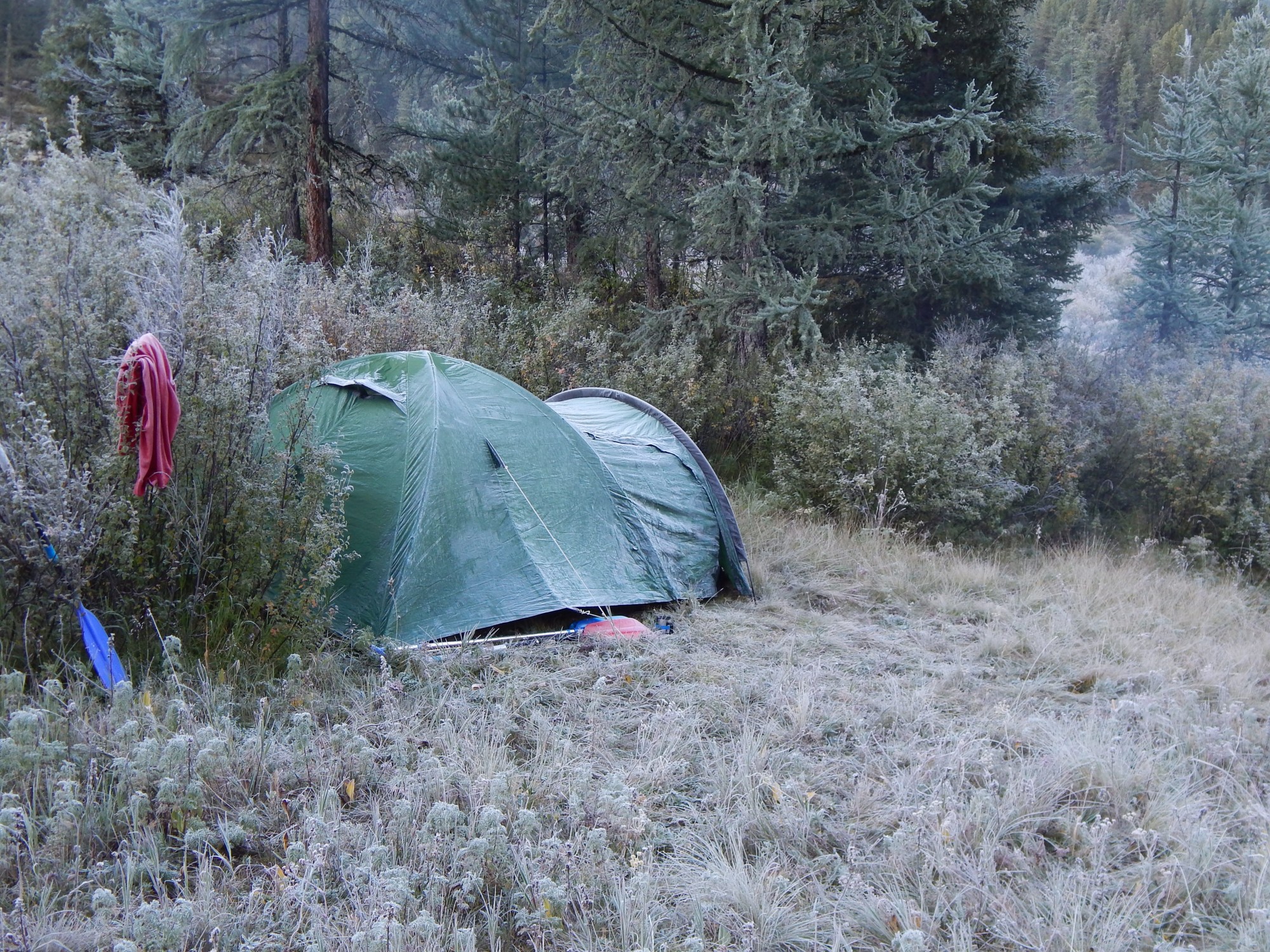 Встал, как всегда, с дежурными (долбаная ТЭЦ! За 23 года крепко врезался ее график – полшестого на работу) Брусника на солнечных местах спелая. Гребу горстями. Ночью был мороз, палатки прихватило уже в 23. Сейчас все в инее.