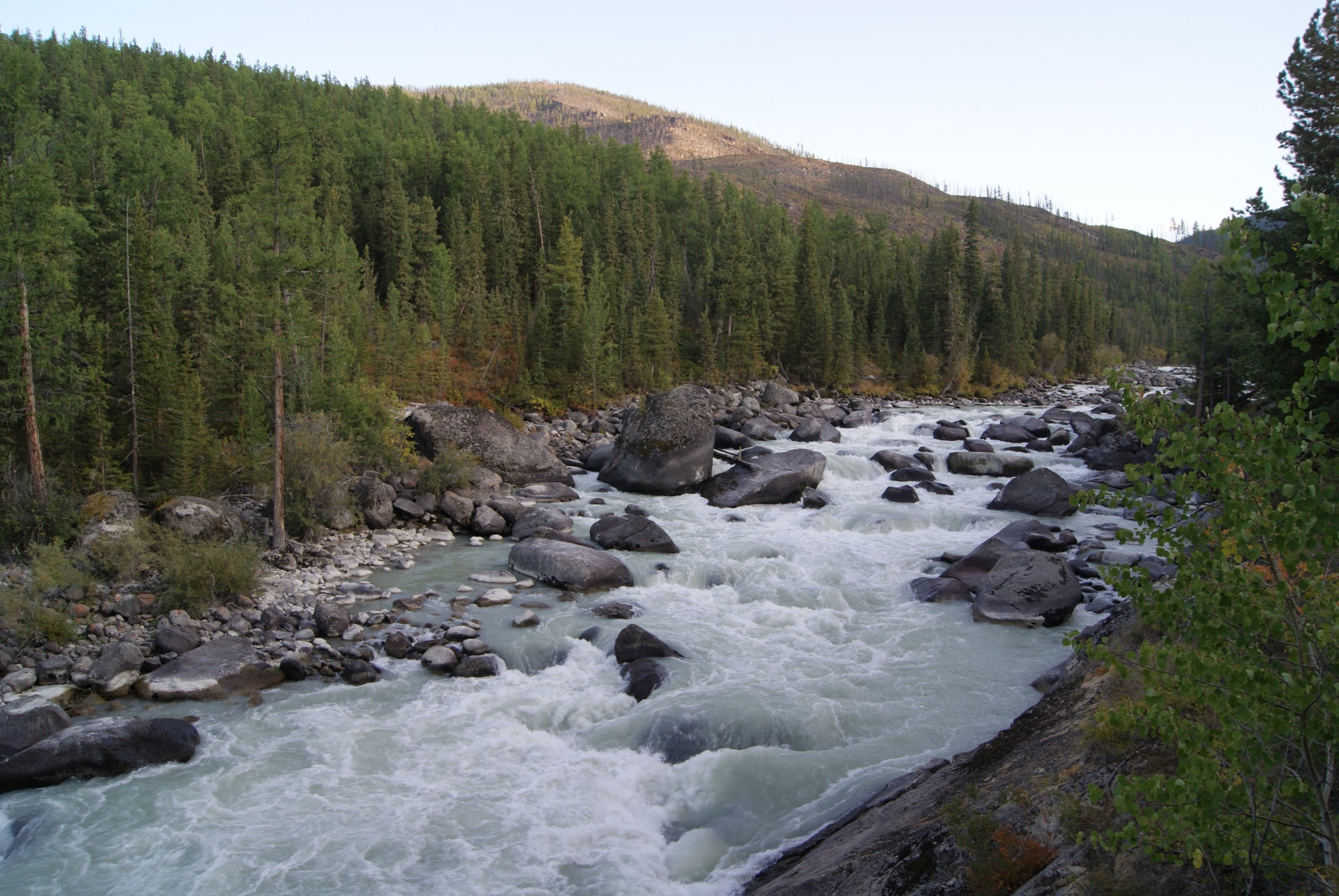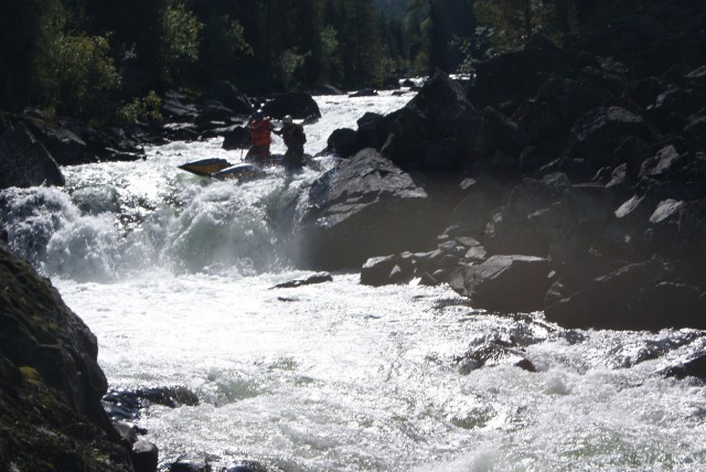 А на следующий день были последние пороги. В т.ч. Туз, на котором тоже хватило приключений. Опять далеко, очень неудобно обносить – по камням в воде. Костя с Димой прошли хорошо, пару раз, правда, сели. И у меня сразу подкатил комок к горлу. Там дальше были буруны, через которые «на одной ноге» не проскочишь. А еще навал на выходе.