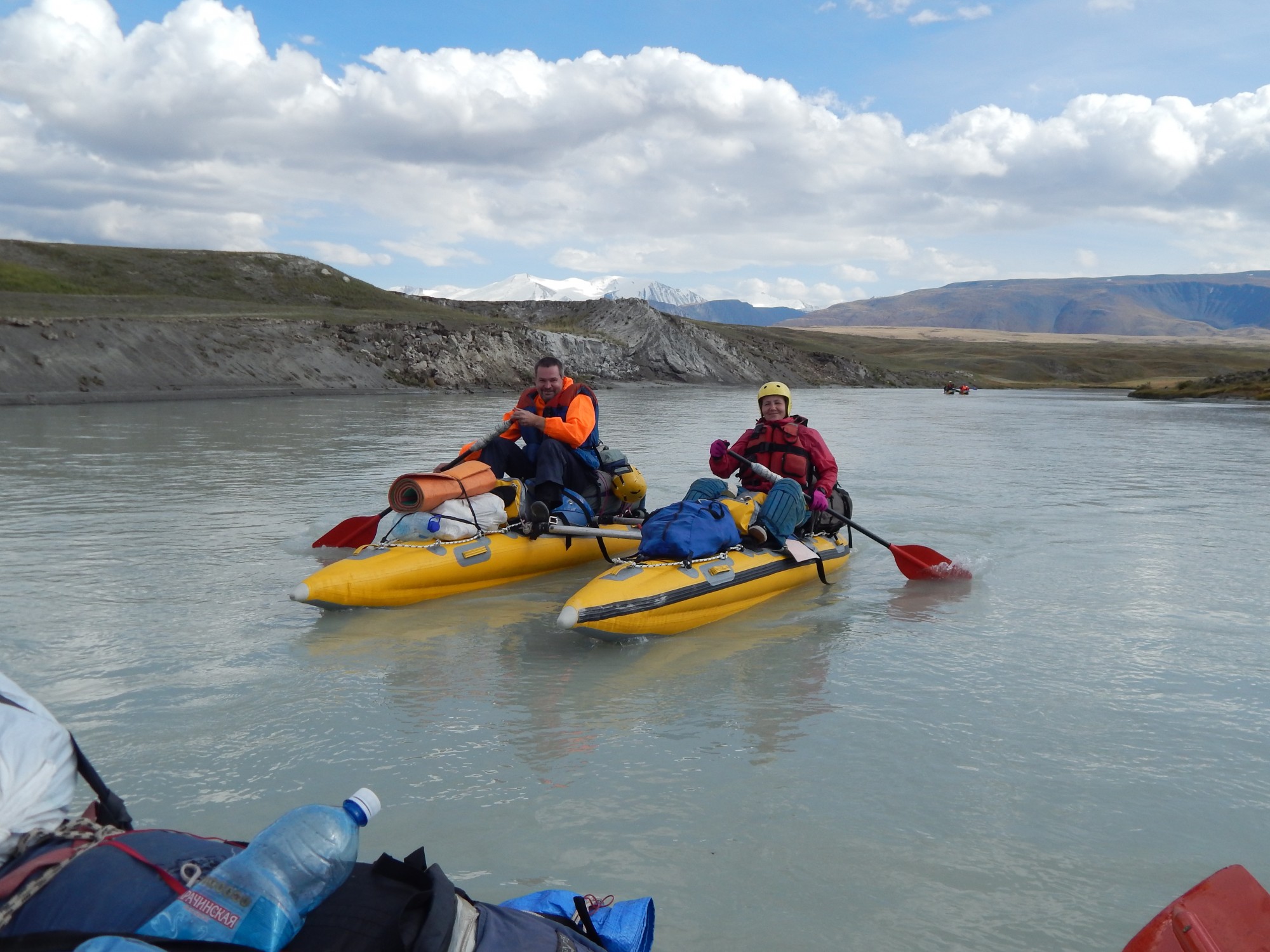 Да, с капризами и у этой...Встречный ветер на плато - семечки. В белесой от суперлегкой глины воде камней было не видно, надо было угадывать по волне за ними. Но она тоже сливалась с фоном - белое на белом. И первый же порог в сужении дал понять: все серьезно. Напоминало Урсул в большую воду этого года: уклон, крупные камни в струе, куча обливнух. Я, грешным делом, спихнул капитанство на Леху. И не пожалел: он шел лучше меня. Лучше видел струю и камни, меньше боялся. Мы шли большей частью по струе, лишь на короткое время врубаясь по полной там, где нужно было перейти в другую.