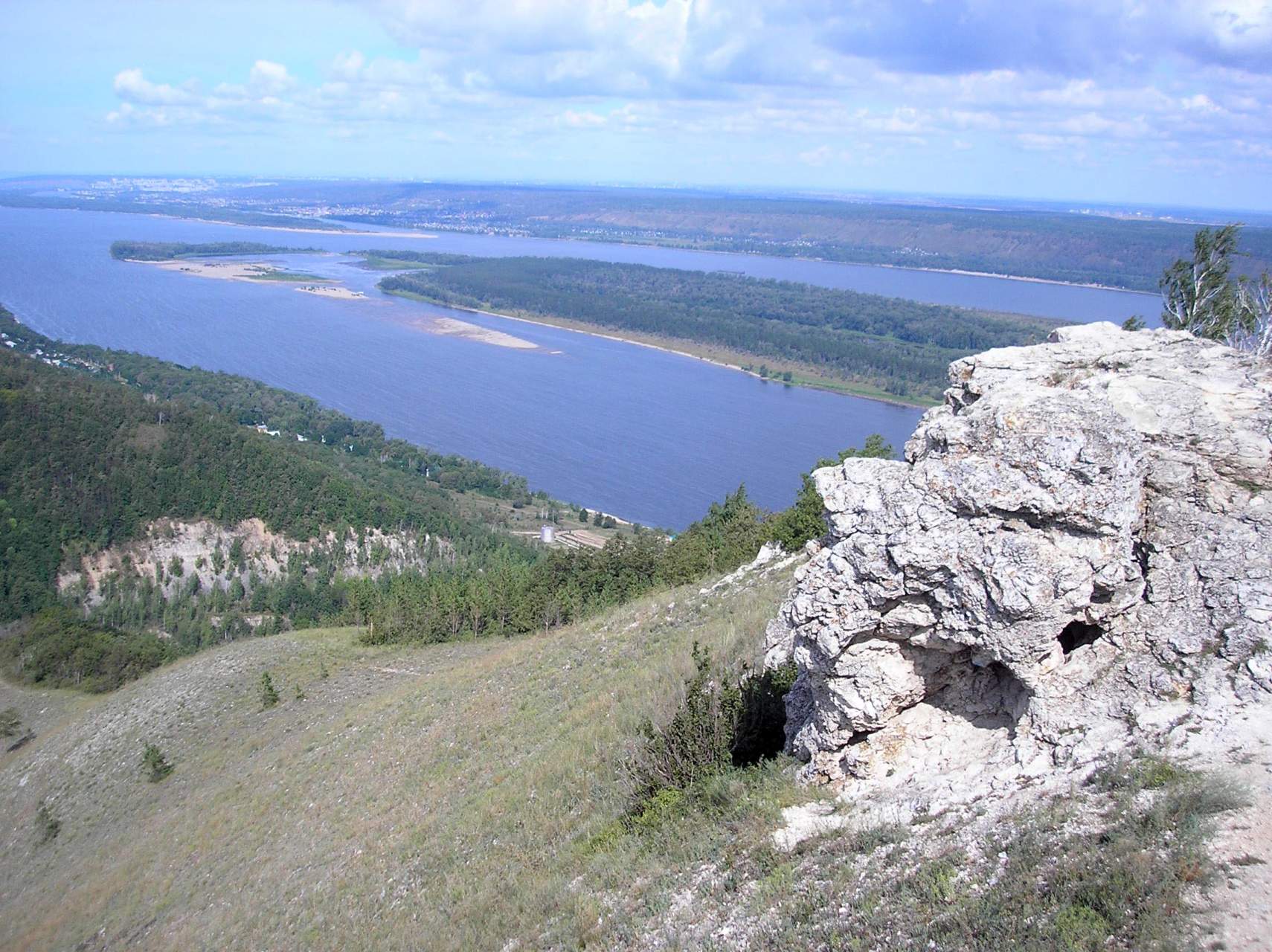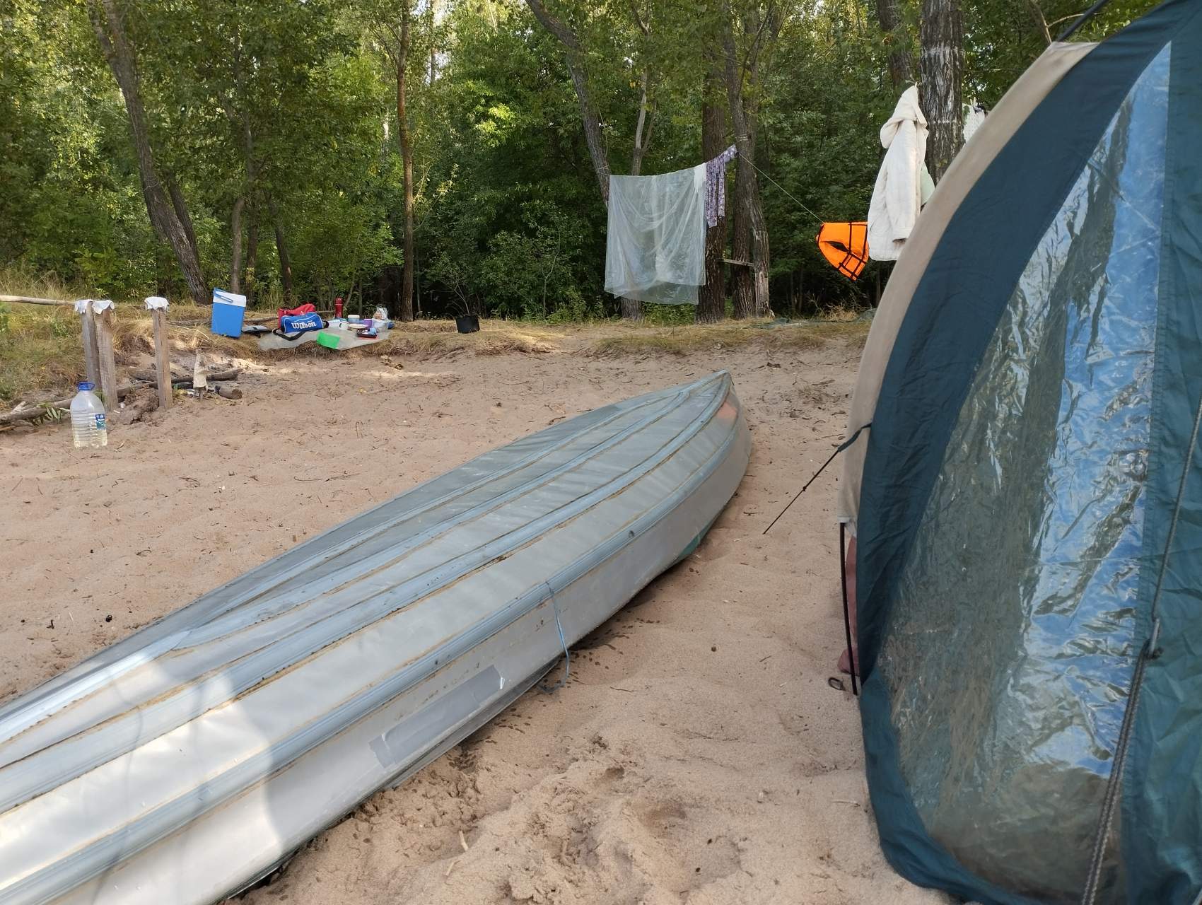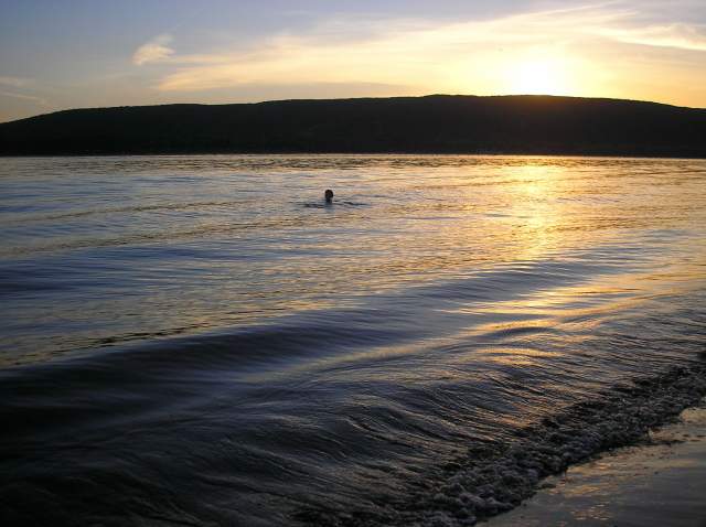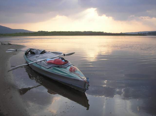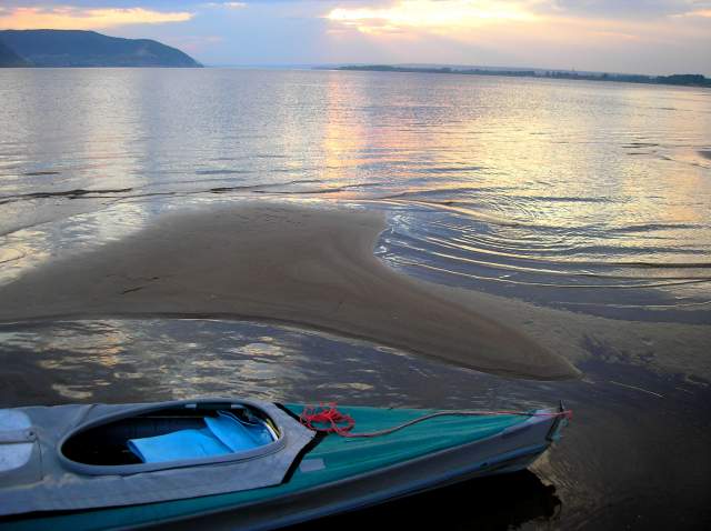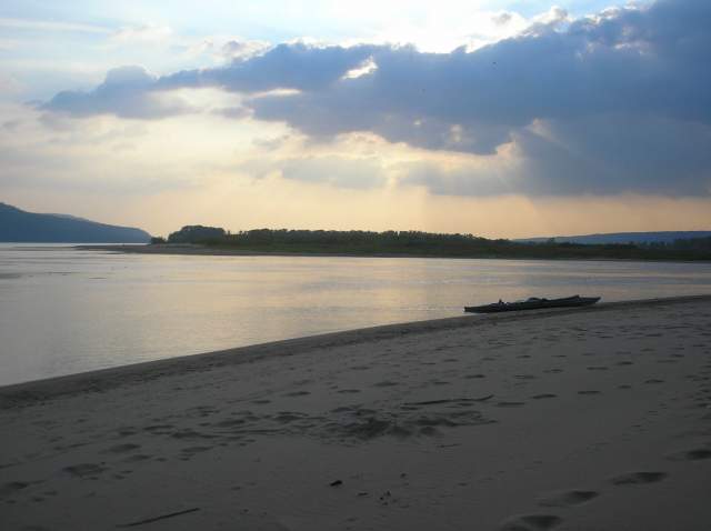 Мы плаваем в наши Великие Заплывы, чтоб побыть наедине с природой, с Волгой, подальше от людей, стоянки устраиваем в уединенных безлюдных местах на песчаных островах, с этой целью к вечеру мы обычно переплываем Волгу, чтоб остановиться на каком-нибудь острове. И обычно нам это удается (за долгие годы плаваний мы стали профи в выборе стоянок для ночлега). Но в предпоследний вечер нашего Заплыва сильный ветер и надвигающаяся ночь загнали нас в неправильное место. Мы издали увидели песчаную оконечность острова и ломанулись туда, чтоб поставить палатку где-нибудь на песочке. Да, мы видели домики на пригорке, но решили, что они пустые и нам не помешают. Но не тут-то было. Вслед за нами к нашему берегу причалила моторка, за ней еще одна... До нас дошло, что сегодня вечер пятницы (!), но было уже поздно: мы уже разгрузили байдарку, затащили ее наверх и перетащили туда все вещи. И тут началось: "Девочки, вы положили байдарку у нас на пути, к нам завтра приедут гости, будут через вас ходить, и палатку здесь не ставьте, а ставьте вон там, и с дровами здесь напряженка, обращайтесь к нам, у нас газ", и всё в этом духе. Боооже, как мы от этого отвыкли на своих душевных безлюдных стояночках...