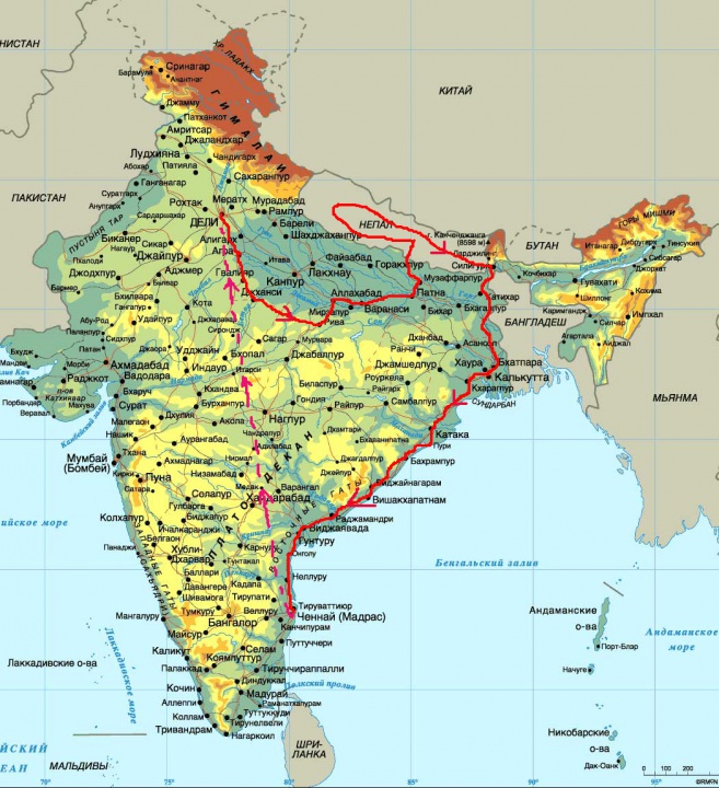 На карте не видно, но из Варанаси хотим еще захватить Бодгайю, а верхней точкой по Индии хотим сделать Манали (насколько нам известно дальше дороги могут быть закрыты). Соответственно вниз спускаться через Нагар. В Непале же оставить где-то моцыки и попробовать на несколько дней подняться в горы с проводником или без (трекинг).