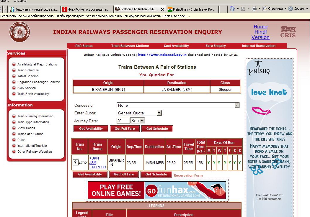 Прикидываю свой маршрут по Раджастану. Начинать собираюсь с Биканера. Добираюсь туда поездом. А дальше начинаются траблы. Следующей остановкой для себя хотел бы видеть Джайсалмер. Однако сайт индийских ж/д www.indianrail.gov.in на мой запрос отвечает: