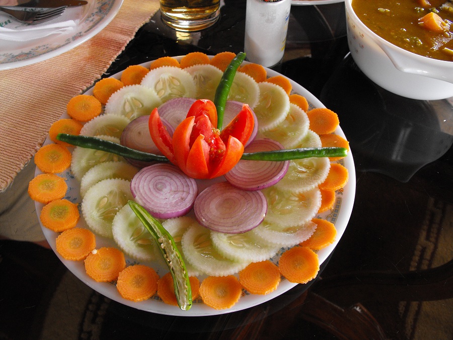 4) Вот, к примеру, салат крупным планом. Дефицит овощей? На самом, что ни на есть, южном юге? Результат тридцатилетнего правления коммунистов? Экономия на туристах? Вроде, на огурцах-морковке не наэкономишь, вон кок только что ананасу нарубал и еще обещал... Лучше бы риса поменьше расходовали... Или подали самое экзотическое? Такая, понимаешь, «икра заморская, баклажановая»... Но с каким старанием нарезано! Не поешь – обидишь смертельно!
