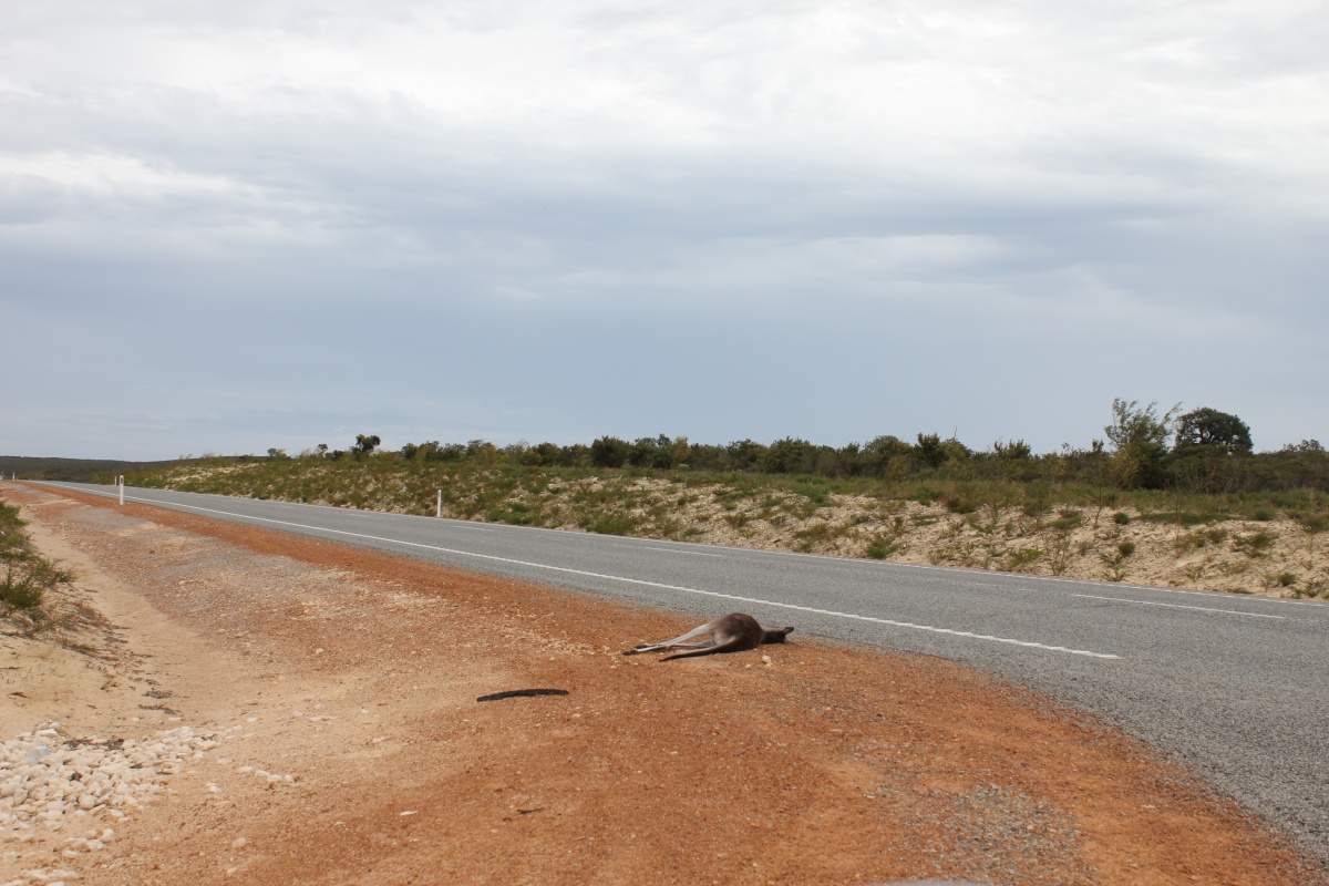 Рано утром мы выехали из Пертха в направлении к Шарк-бэй. Здесь на тридцатой широте происходит резкая смена ландшафтов. И без того невысокие деревья вскоре перестали встречаться вовсе, уступив место полянам диких цветов и редколесью среди коричневатых песчаных почв пустыни. Gps показал самый краткий путь к Индиан оушен драйв, который, в конечном счете, оказался узкой проселочной дорогой среди зарослей кустарников. Путь этот привел нас тупик, но к моей огромной радости нам впервые повстречались парочка здоровенных рыжих кенгуру , самых крупных сумчатых на планете, невозмутимо пропрыгавших перед машиной. Бедные животные совершенно лишены осторожности и выскакивают на дорогу прямо перед мчащимися автомобилями, являть главной причиной аварий в стране. По пути нам то и дело встречались мертвые туши, валяющиеся на дороге. Ночью их ослепляет свет фар от Road Train, грузовиков – поездов популярных на западе, длина которых может достигать 53 метров. Чтобы защититься от многочисленных страусов и кенгуру, австралийцы между прочим и придумали "kangaroo bar".
