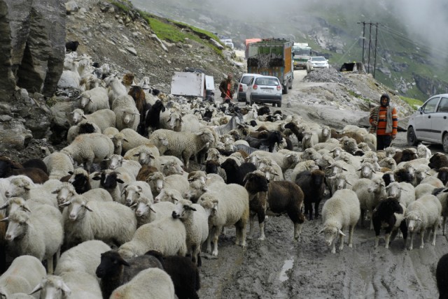 На Ротанге снега не было и не было индийских туристов, не было развлечений, были дхабы и стада овец. Конец августа, конец сезона. Проснувшийся молодой индииц из Дубаи, недоуменно осведомилсь, а где же перевал, а снег. Перевал был, снега не было, я и сама толком не поняла, а где же был перевал. Когда спускаешьсь с Ротанга, попадаешь в другой мир, в другие горы, другие Гималаи, защелкали фотоаппараты и послышались восхищенные вздохи. Мы в Ладаке. В царстве старых разноцветных гор, пустыни из камня и песка.