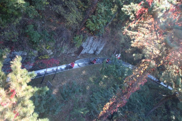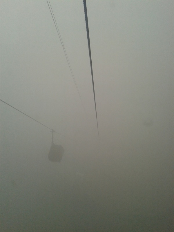 Погода не радует - туман такой, что не видно, с какой стороны гора, того и гляди пойдет дождь. У хостела оказалось очень удачное расположение - совсем рядом автобусная станция, железнодорожный вокзал и терминал канатной дороги. Канатку найти легко, она проходит прямо над городом и далее уходит к самой вершине горы, так что надо просто двигаться по направлению возвращающихся кабинок (Y248 туда-обратно). Длина пути - 8 километров, это самая длинная канатная дорога в мире и совершенно точно одна из самых красивых.