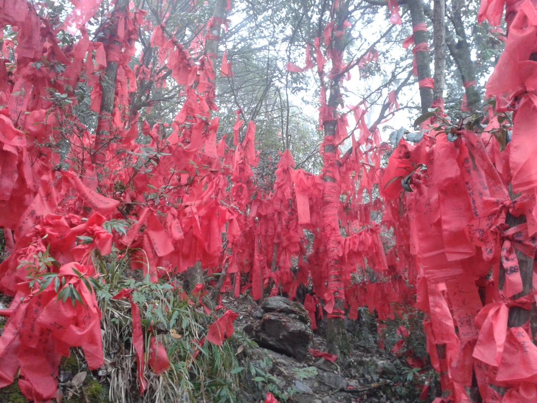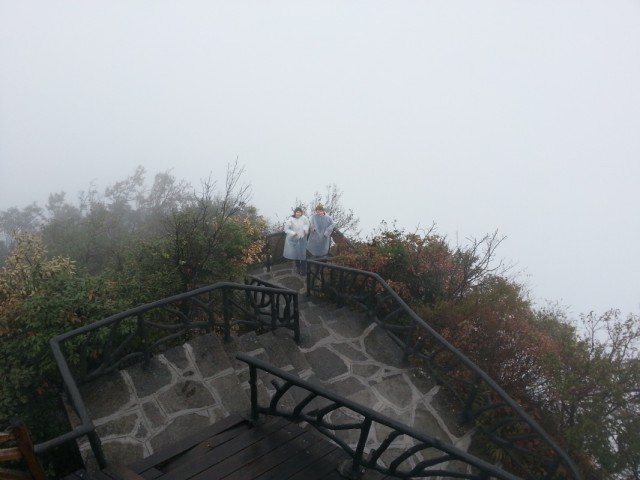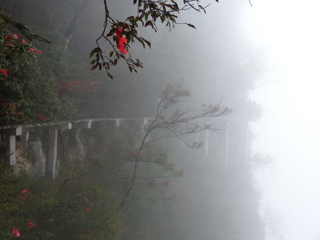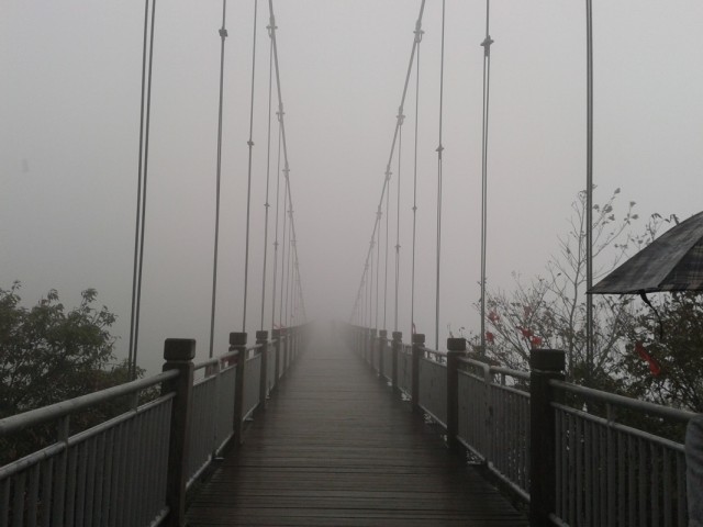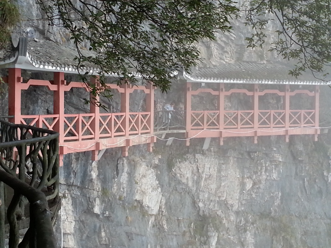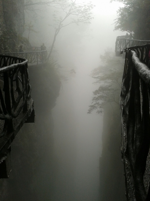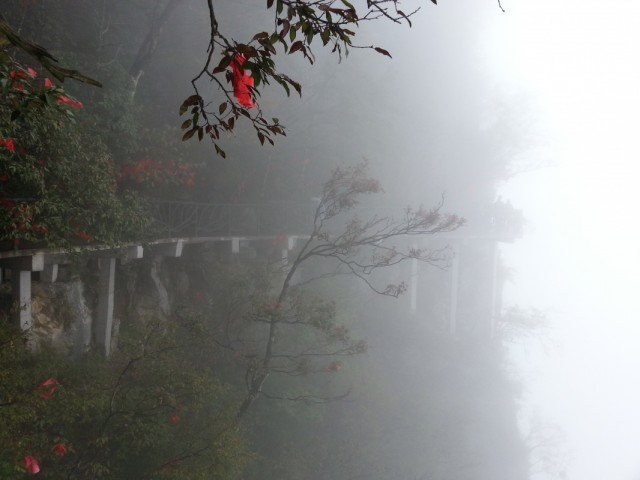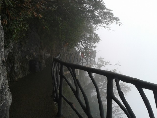 Скалу опоясывает тропинка, плюс есть несколько дорожек к центру плато и даже вторая канатная дорога на самую вершину. Тропинка то идет через леса, то превращается в узкую дорожку, проложенную на вбитых в отвесную скалу балках - идешь буквально по воздуху! Один участок тропы со стеклянным полом, в ясную погоду должно быть очень страшно (вход туда Y10, из них 5 - депозит за специальные нескользящие тапки). Тут и там появляются смотровые площадки со смешными названиями вроде "Love Between Trees and Rocks", иногда, когда облако чуть расходится, с них видны очертания соседних гор. В ясную погоду, наверное, невероятно красиво.