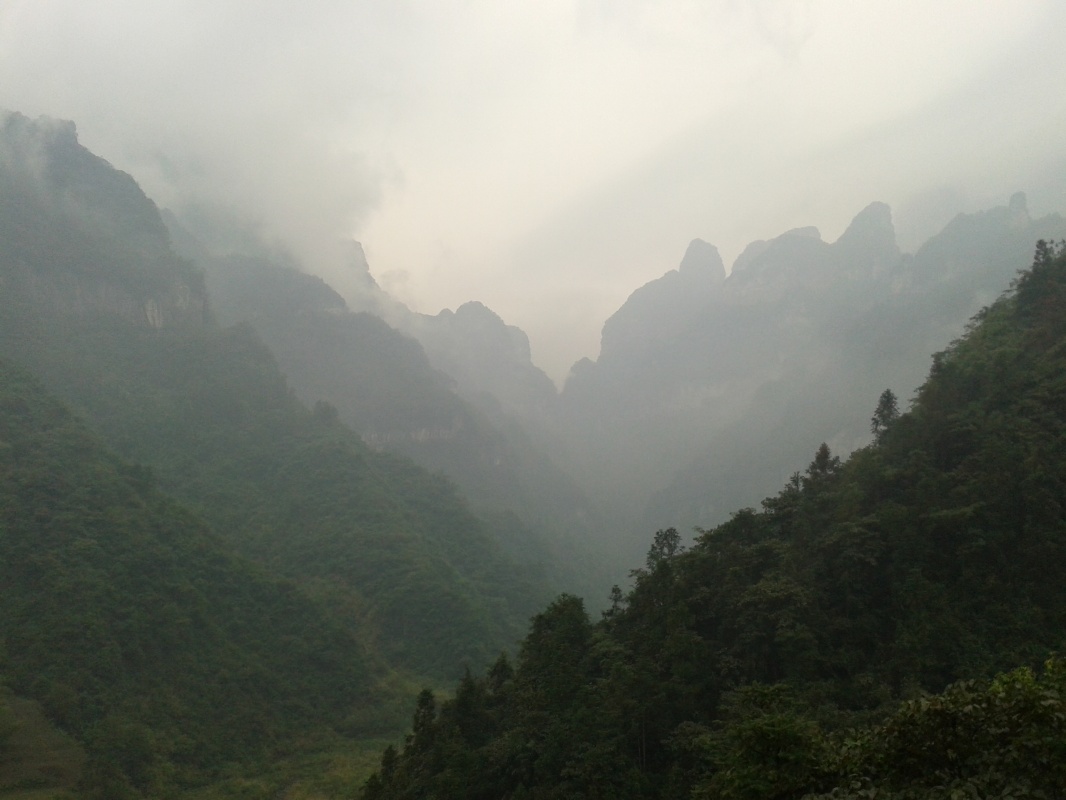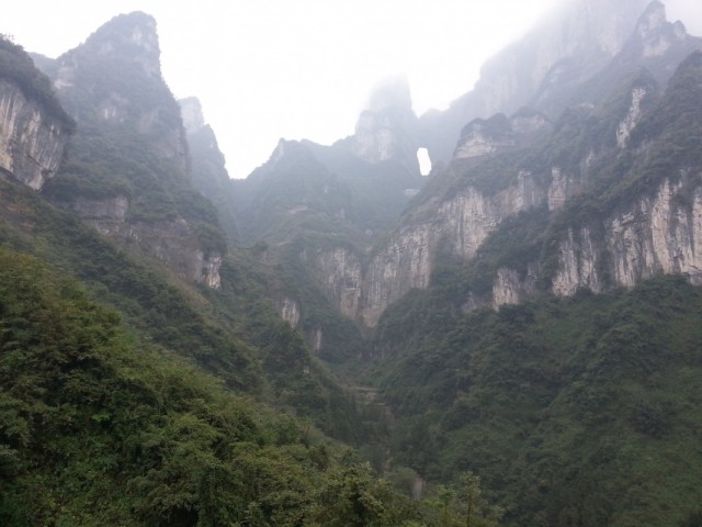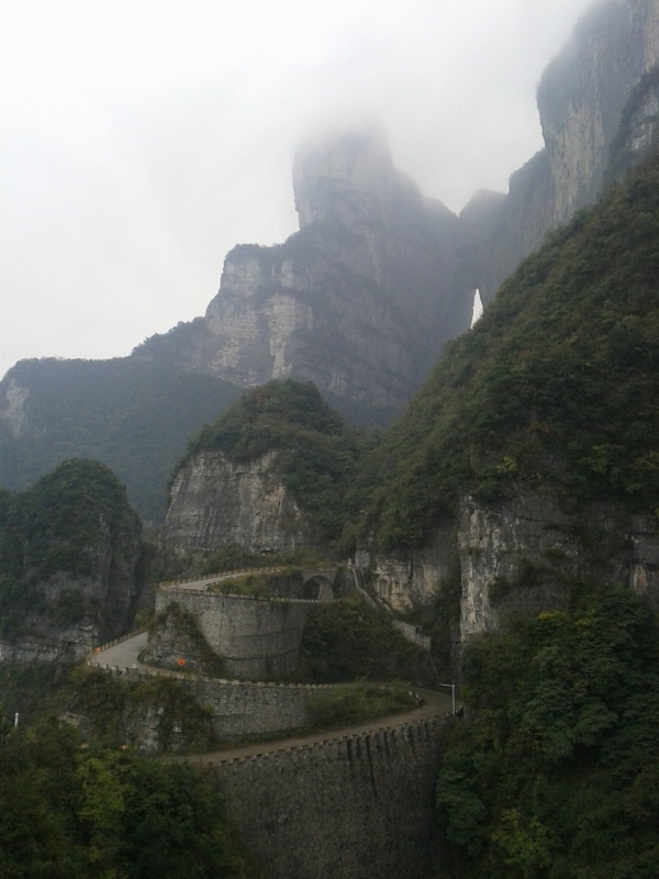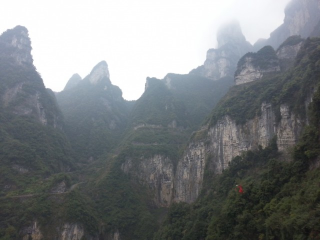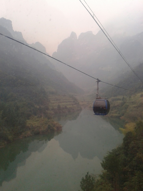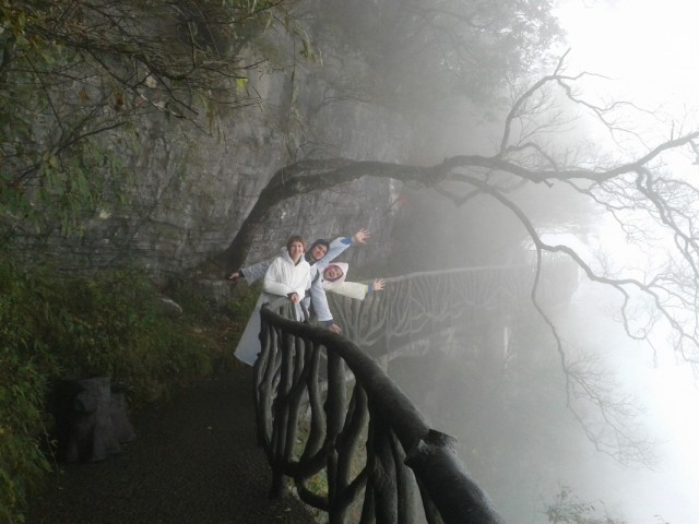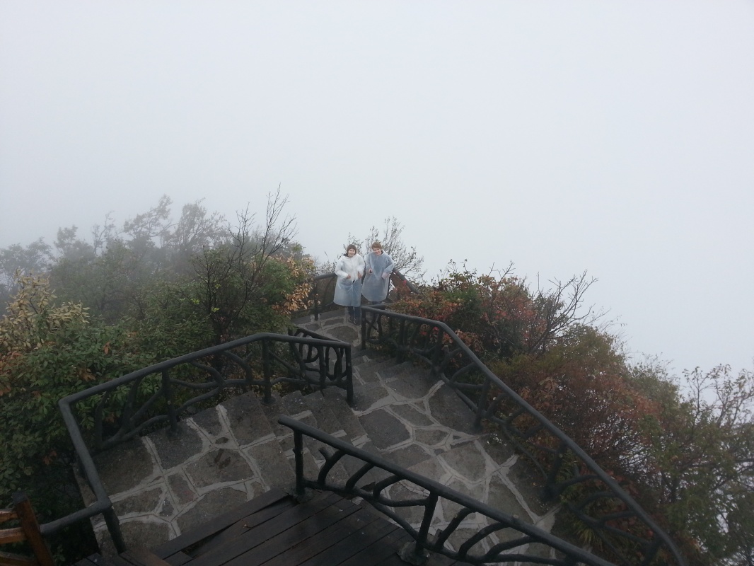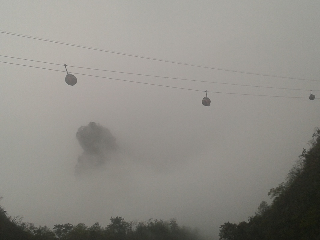 Первая часть пути проходит над городом. Чжанцзяцзе - город строек! Такого количества строительных кранов и незавершенных многоэтажек мы не видели нигде. Далее проезжаем над невысоким перевалом и едем над долиной с крошечной деревушкой, вершина Тиань Мень теряется в облаках. Потом начинается резкий подъем, въезжаем в облако, да такое густое, что его можно кусать. Да уж, с погодой нам не повезло - мы то ли в облаке, то ли в тумане, видимость - метров 20. Мне сразу вспомнилось, как недавно, летя в самолете через белые облака, я мечтала о том, как было бы здорово прожить денек в облаке, таком влажном и белом, и чтобы оно было таким плотным, что его можно было бы ощущать кожей. Ох, ребята, будте осторожны с мечтами! Да еще и дождь. В купленных еще внизу белых полиэтиленовых дождевиках мы выглядим как группа молодых врачей.