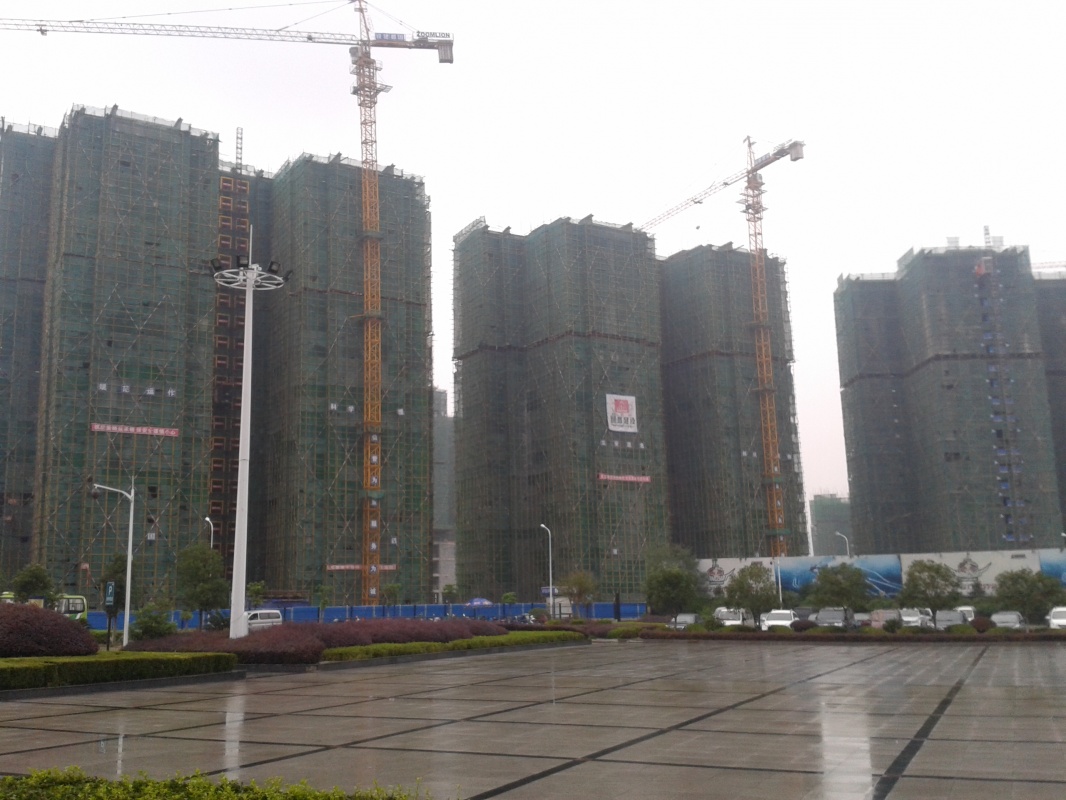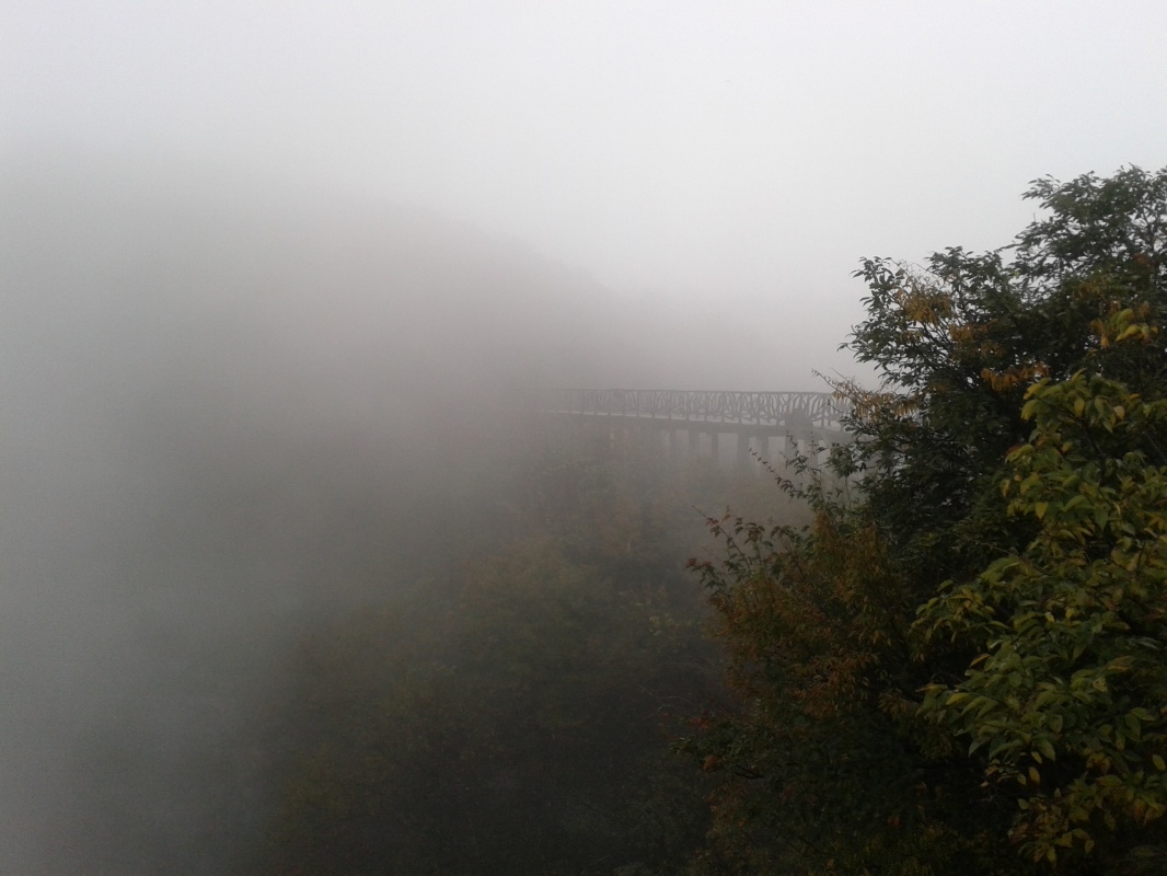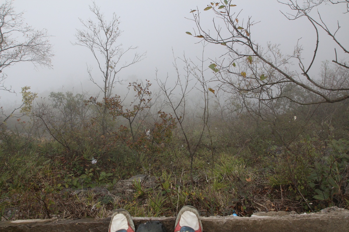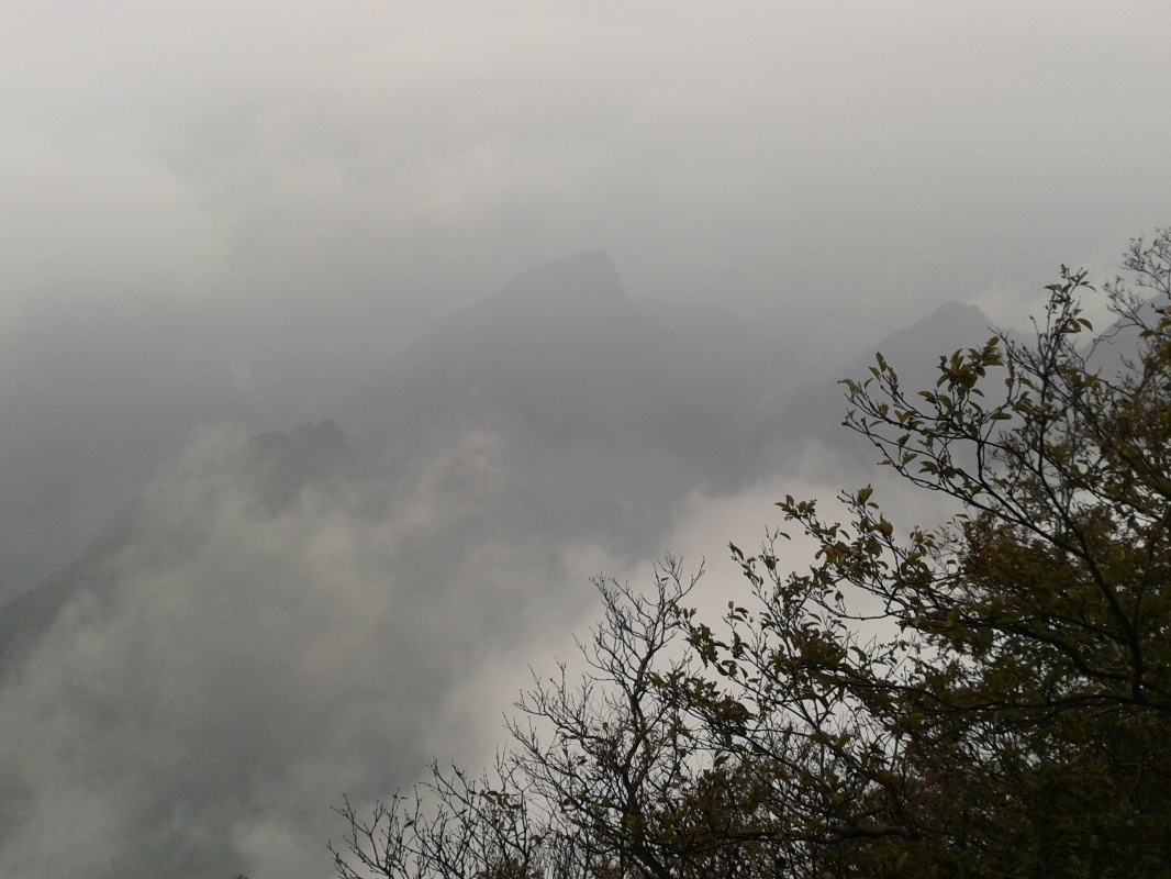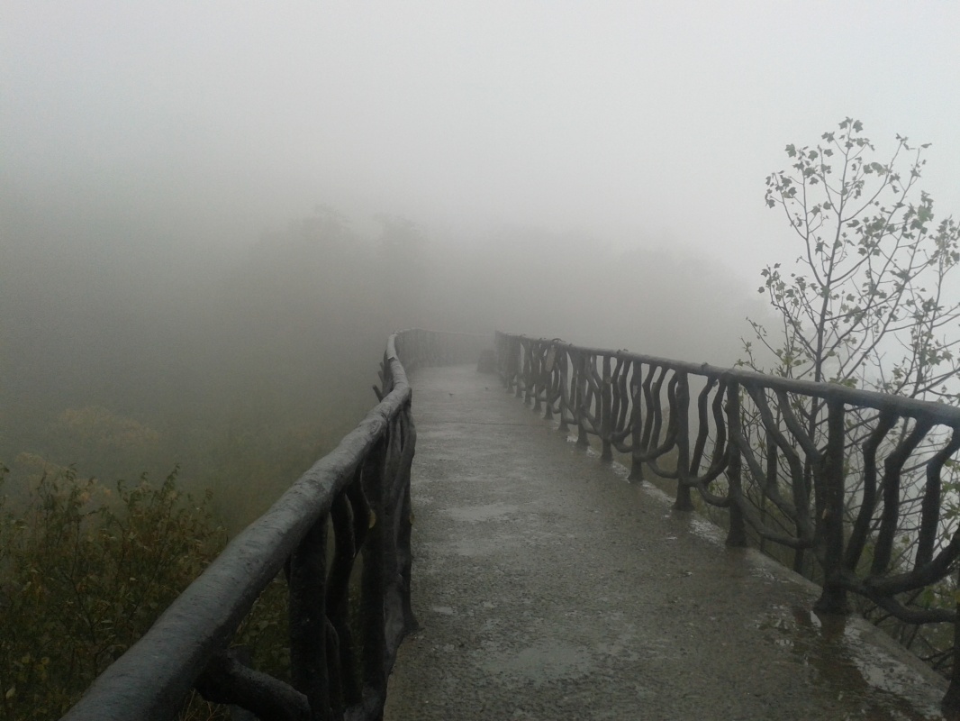 Первая часть пути проходит над городом. Чжанцзяцзе - город строек! Такого количества строительных кранов и незавершенных многоэтажек мы не видели нигде. Далее проезжаем над невысоким перевалом и едем над долиной с крошечной деревушкой, вершина Тиань Мень теряется в облаках. Потом начинается резкий подъем, въезжаем в облако, да такое густое, что его можно кусать. Да уж, с погодой нам не повезло - мы то ли в облаке, то ли в тумане, видимость - метров 20. Мне сразу вспомнилось, как недавно, летя в самолете через белые облака, я мечтала о том, как было бы здорово прожить денек в облаке, таком влажном и белом, и чтобы оно было таким плотным, что его можно было бы ощущать кожей. Ох, ребята, будте осторожны с мечтами! Да еще и дождь. В купленных еще внизу белых полиэтиленовых дождевиках мы выглядим как группа молодых врачей.
