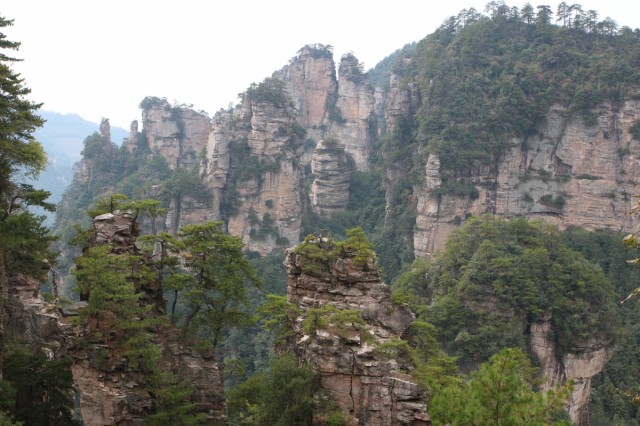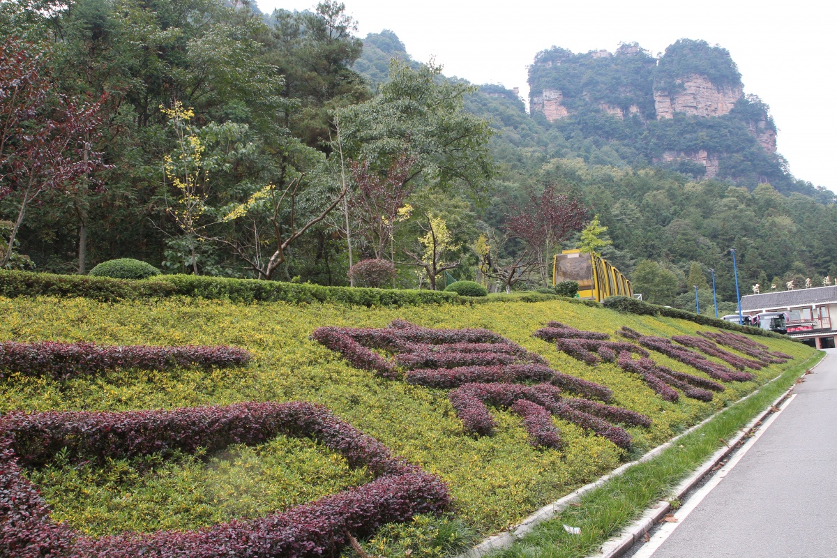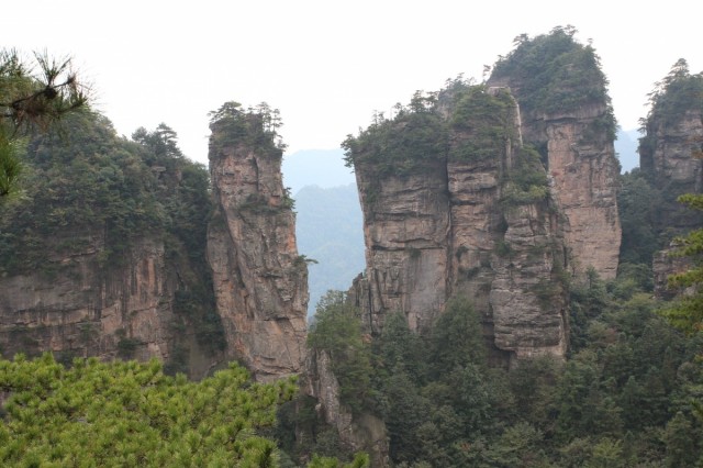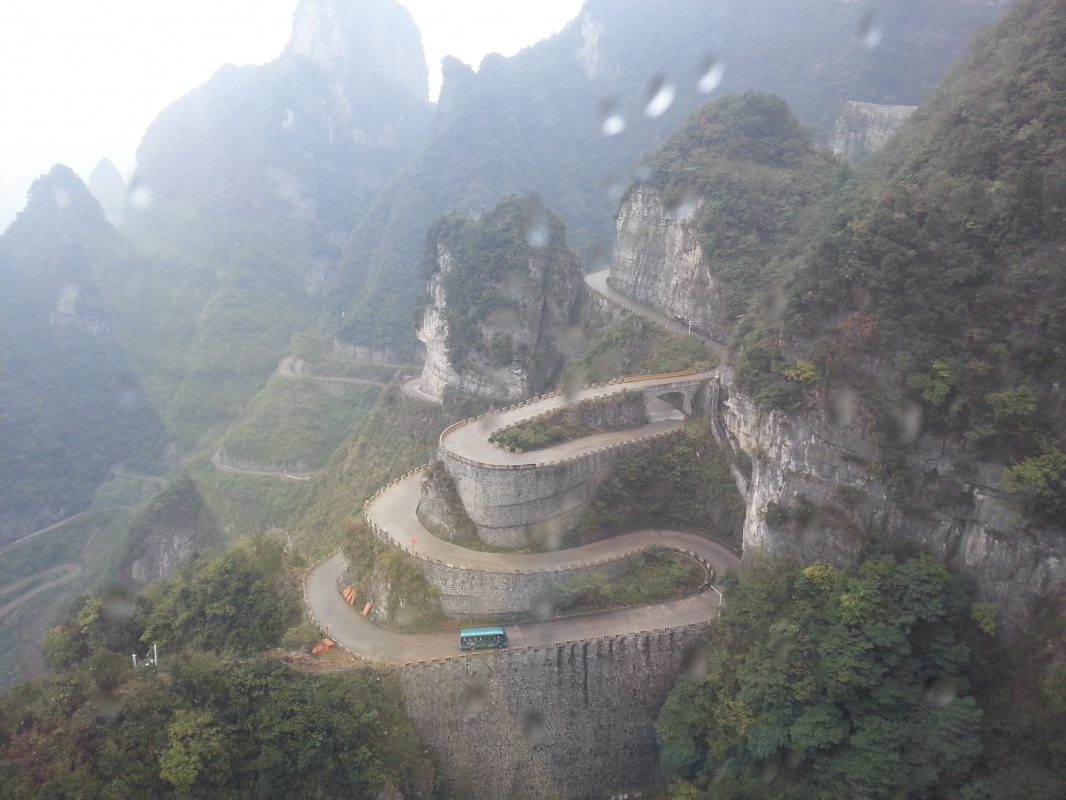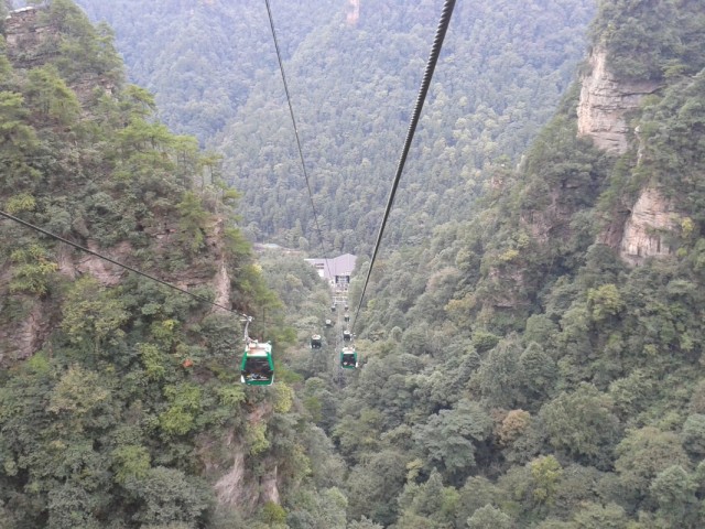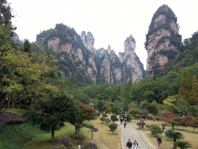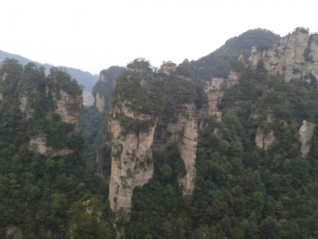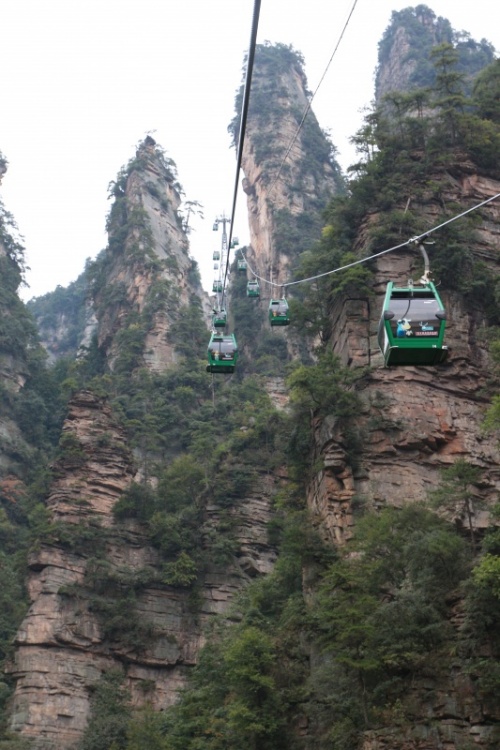 С самого утра яркое солнце и почти безоблачно, вот бы и вчера так было. Садимся в автобус до деревни Чжанцзяцзе (Y12), в которой расположен один из входов в огромный национальный парк. Территория парка - как три Москвы! Трехдневный билет стоит Y248, в него включен проезд на автобусах внутри парка. Сегодня предстоит трудная задача - пройтись по парку с рюкзаками, подняться по канатной дороге на скалу и добраться до деревни посреди парка для ночлега.