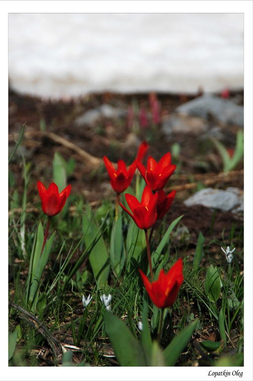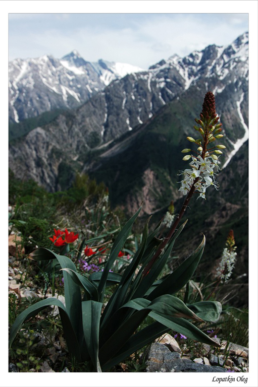 В первый день пути погода была замечательной, хотя жара сильно осложняла подъем с тяжелыми рюкзаками. Мы вышли в Гулькамские теснины, перешли через перевал «Песочный» (1832 м над .у.м), на перевале решили сделать привал и вдвоем с одним из моих напарников я поднялся на Малый Чимган… Как красивы горы в это время года ! Везде на склонах по соседству с еще не растаявшим снегом пробивались первоцветом крокусы и тюльпаны, маленьким подобием экзотических агав то там то тут возвышались цветущие эримурусы.