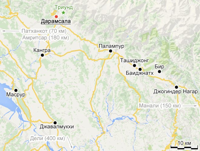 Джогиндер Нагар (Joginder Nagar, карта) в 65 км к северо-западу от Манди и в 15 км к востоку от Бира - совершенно ничем не примечательный городок, состоящий из двух улиц и довольно хаотической автостанции. Единственная причина, чтобы здесь остановиться - именно в Джогиндер Нагаре находится начальная (или конечная) станция Узкоколейки Долины Кангра, откуда можно доехать до Кангры и Патханкота.