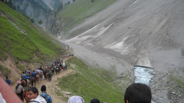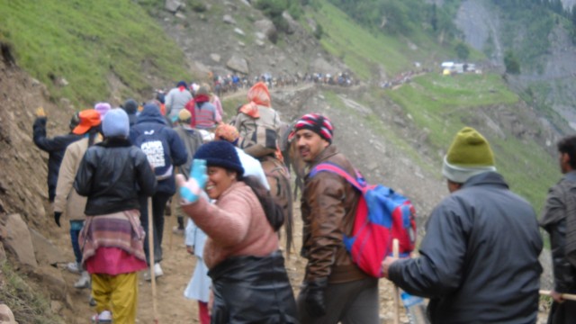 Первые три километра преодолеваем играючи. Тропа идет вдоль речки. Паломники с посохами в руках радостно приветствуют друг друга: "Бам-бам були' !" У дороги стоят домики, сложенные из камня. Их обитатели все при деле: взрослые пасут скот, дети "пасут" паломников, выпрашивая бакшиш. Hо вот "курорт" кончается: дорога поворачивает влево и, превращаясь в тропу, резко уходит вверх. Тут же небольшой памятный знак с надписью. Оказывается, этот второй, короткий путь к Амарнатху проложен местным "стройбатом" в 1984 году. Так вот почему армейцы здесь всем заправляют! С введением в "эксплуатацию" второй тропы число паломников в Амарнатх резко возросло. Так, если в 1977 г. в "ятре" приняло участие 25 тысяч человек, то сейчас счет идет на сотни тысяч. Возросло и число жертв: в 1970 г. на пути к Амарнатху из-за стужи и обвалов погибли 18 паломников, а в 1996 г. эта цифра увеличилась более чем в 10 раз...