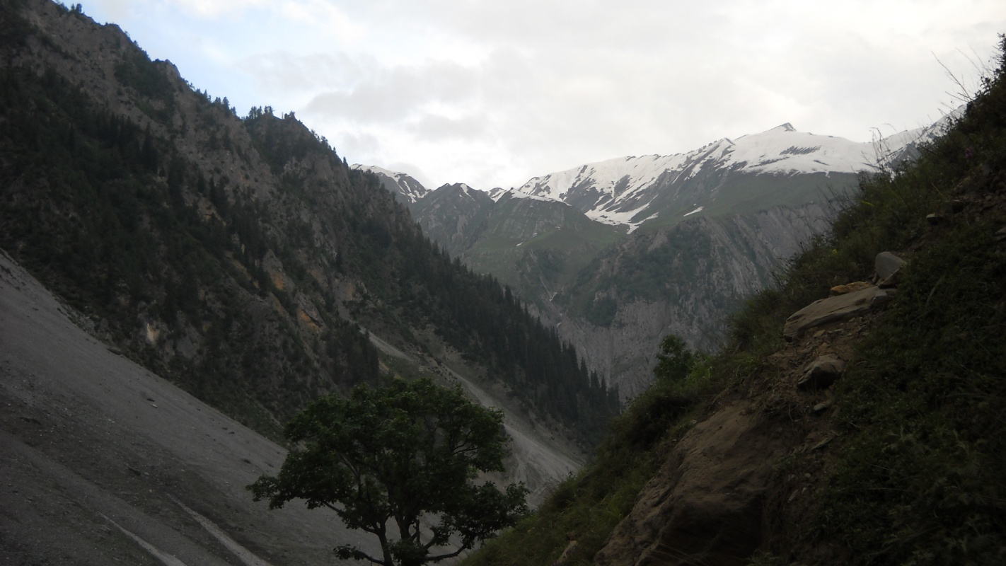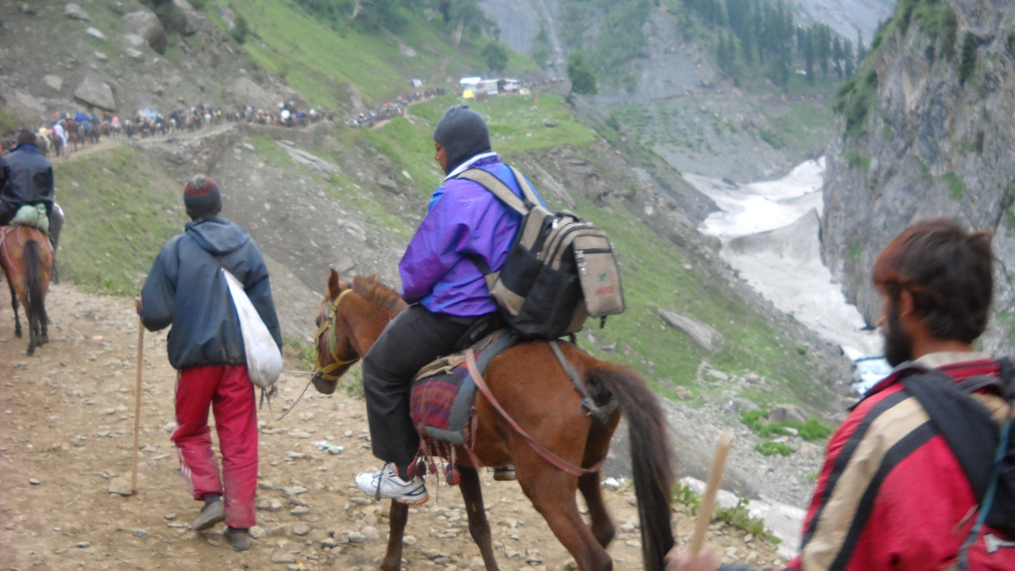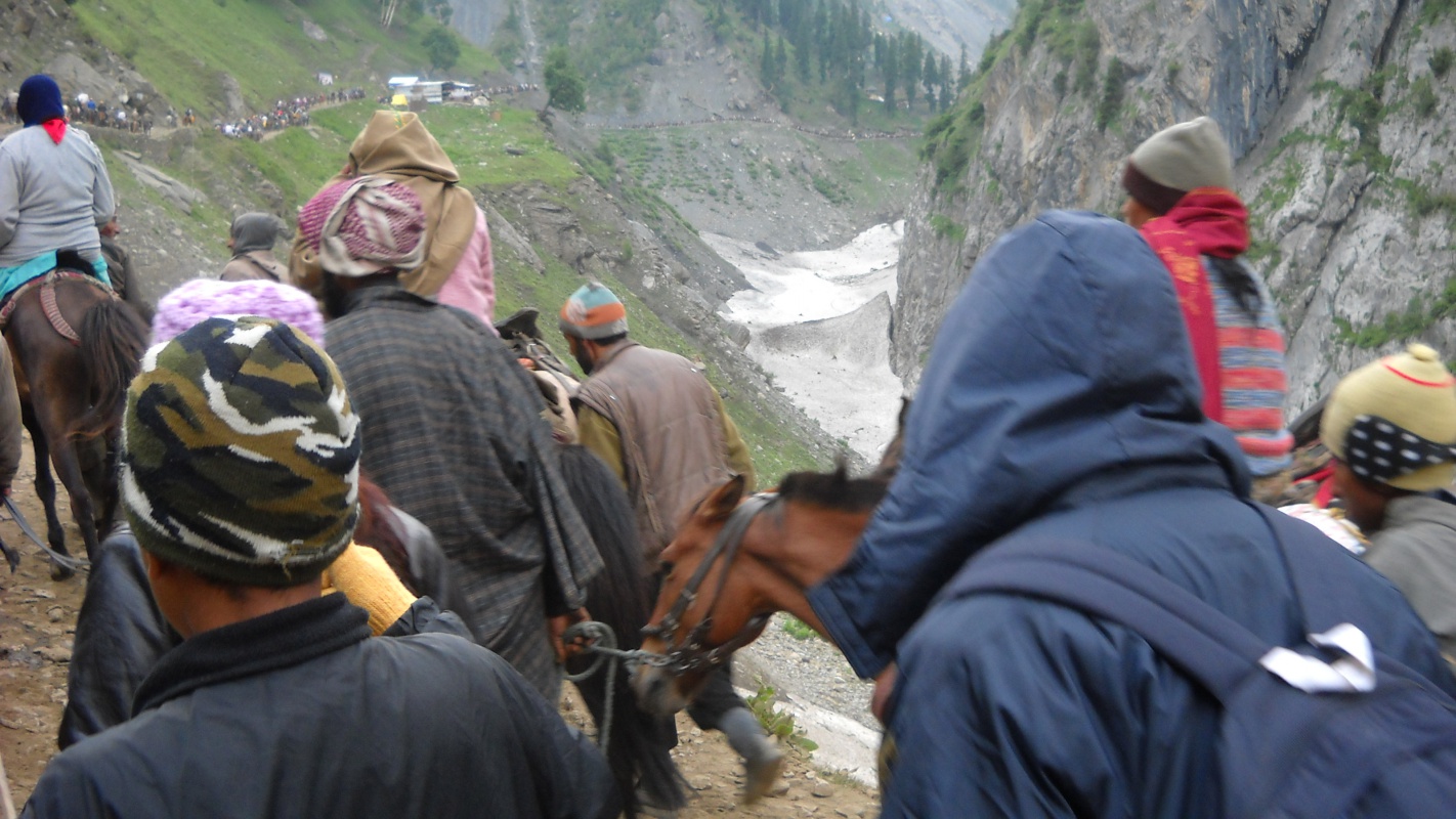 Hачинается самый трудный отрезок пути. Паломники медленно карабкаются вверх по скользкой от дождя тропе. Седоки спешиваются, - здесь лучше не рисковать. Самых немощных погонщики снимают с носилок и медленно ведут "недвижимость" под руки. Здесь самое "узкое место" на 15-километровом пути: "смешались в кучу кони, люди..." Вниз лучше не смотреть, дабы избежать "кружения главы". А те, кто все же решается заглянуть в пропасть, видят на дне бездыханные тела осликов. Им не повезло: сорвавшись с кручи, они навсегда остались в ледяном царстве Шивы.