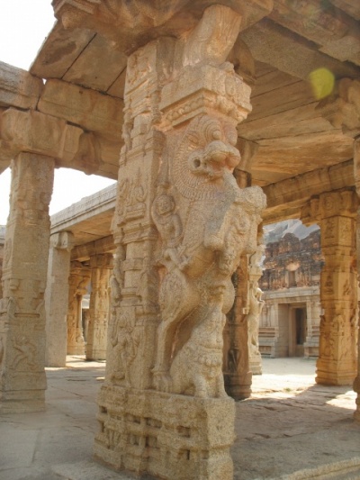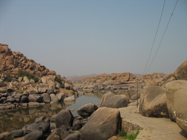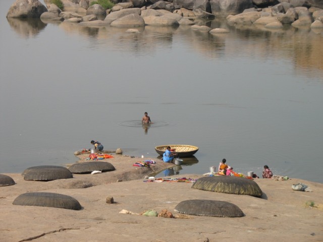Все руинки на территории Хампи относятся к мировому наследию по версии ЮНЕСКО и охраняются как памятники истории и архитектуры. Со стороны деревни до начала основных руинок можно пробраться вдоль реки по дорожкам, вымощенным камнем, либо по тропинкам между гигантских порыжевших валунов. Я шёл вдоль реки, оставив своё транспортное средство у какого-то ресторанчика, т.к. некий смотритель сказал, что на велосипеде дальше нельзя. Дорожка вилась между валунов, ныряла под них, спускалась то вниз, то вверх, и наконец вывела меня на открытое пространство, с которого просматривался берег реки с прачками, их лодками-пиалами и какого-то храброго индуса, который по пояс забрался в реку и оттуда что-то радостно сообщал своим товаркам. К слову сказать, вдоль реки повсюду надписи, предупреждающие об опасных и кровожадных водоворотах. Только сейчас с удивлением вспомнил, что у меня даже как-то мысли не возникло - залезть в реку с целью искупнуться. Вероятно, перекупался в море ;)