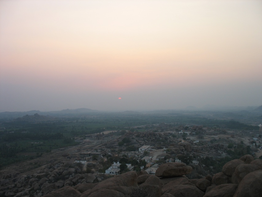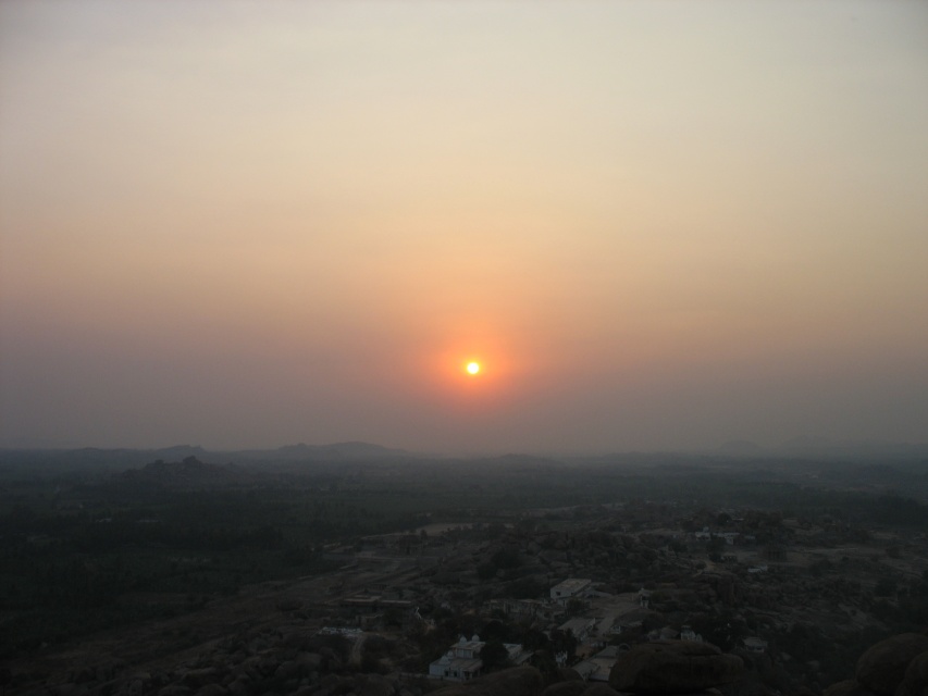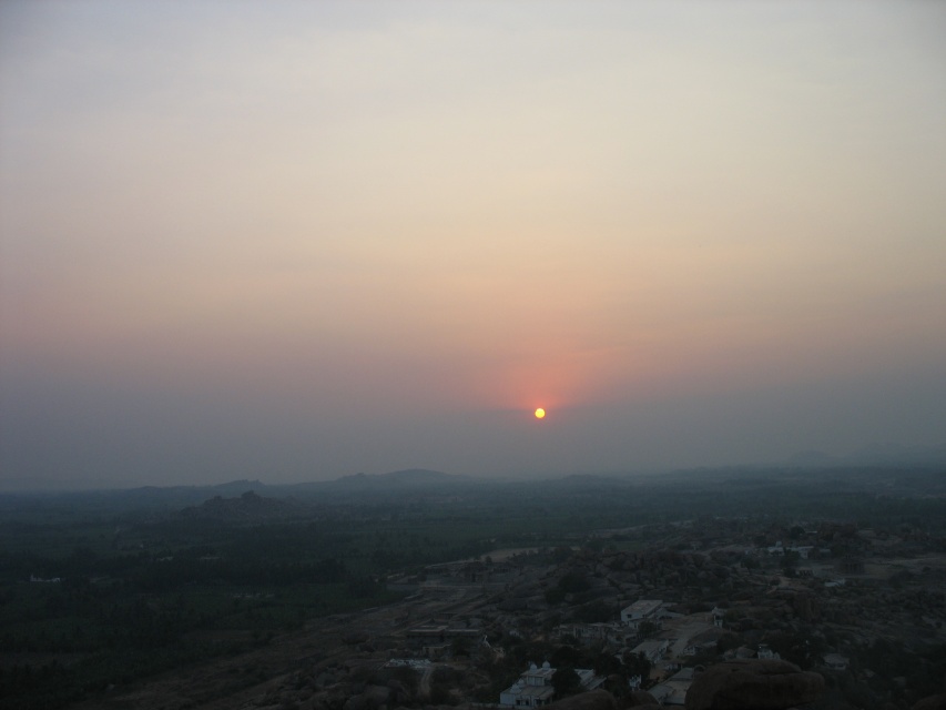 Как такового, горизонта в Хампи не видно. Даль теряется в дымке, а солнце падает в неё, не касаясь горизонта. Как кто-то поэтично упомянул на этом форуме: "...солнце падало в руины древней цивилизации". Видимо, мы наблюдали закат в разное время с разных точек, в моём случае солнце пропало во мгле ;)